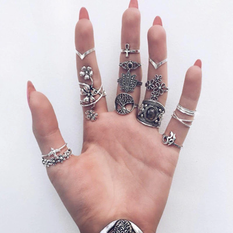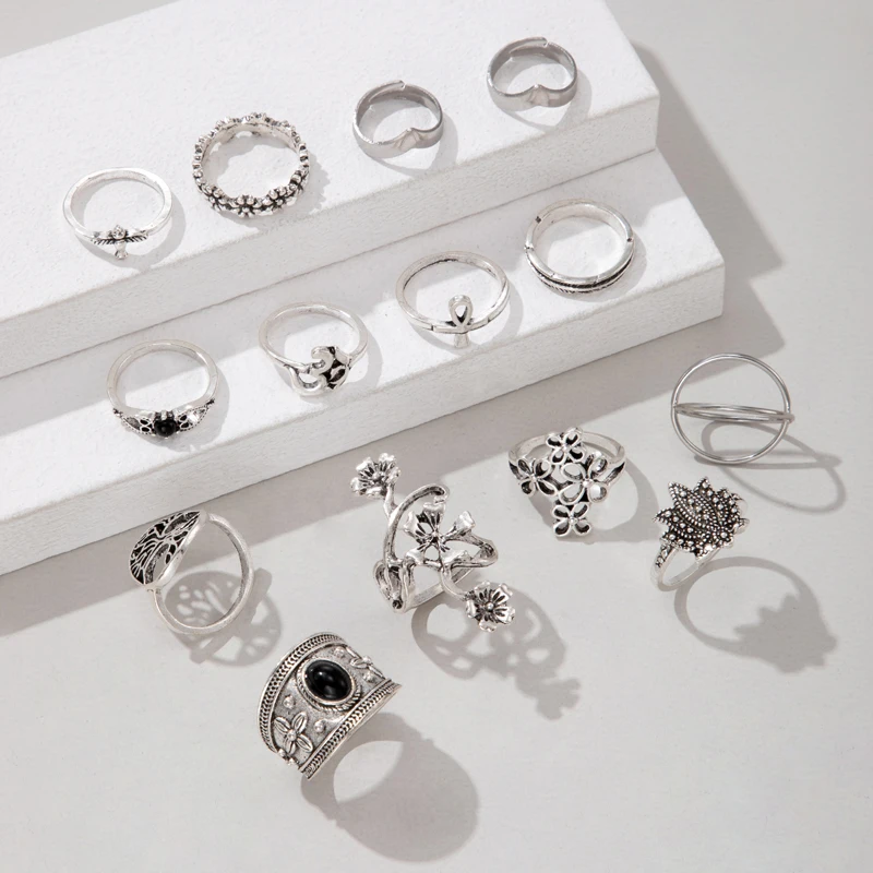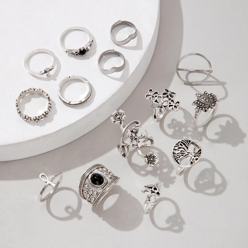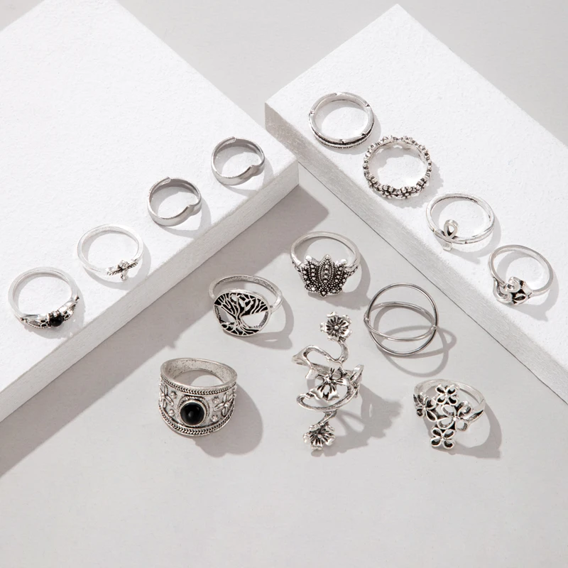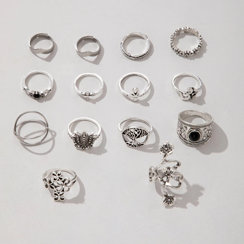 New York’s Fashion 14pcs/Set Vintage Antique Silver Color Ring for Women Rose Sunflowers Cross Geometric Bohemia Jewelry