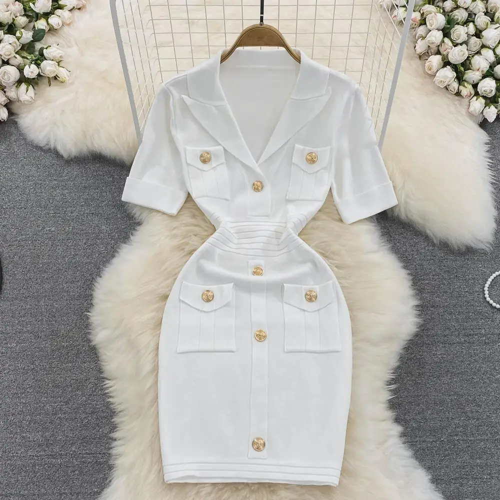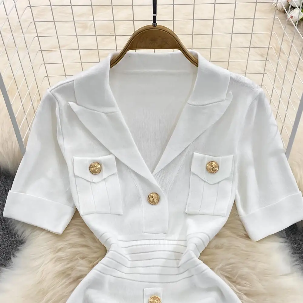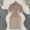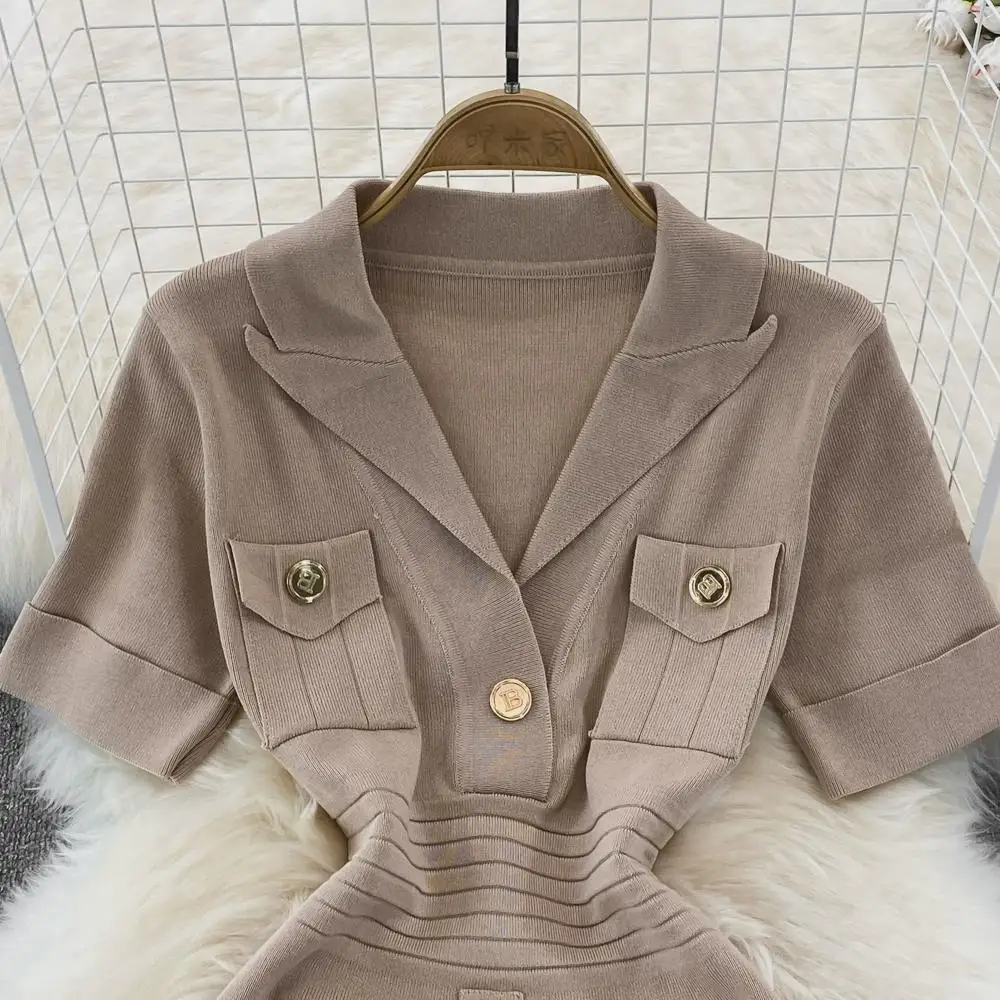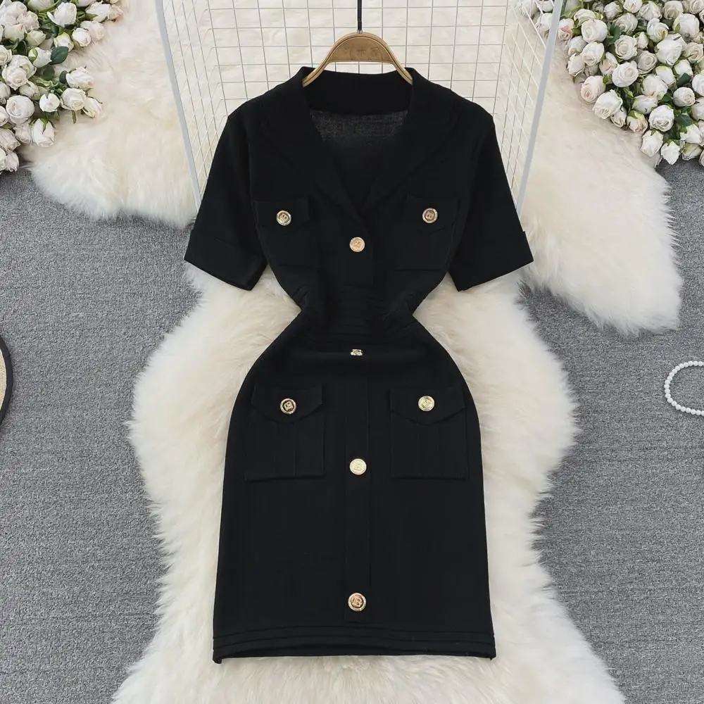 New York’s Fashion 2025 New Summer Buttons Vintage Knitted Women’s Dresses High Waist Solid V-neck Sheath Wrap Sexy Mini Dress Female