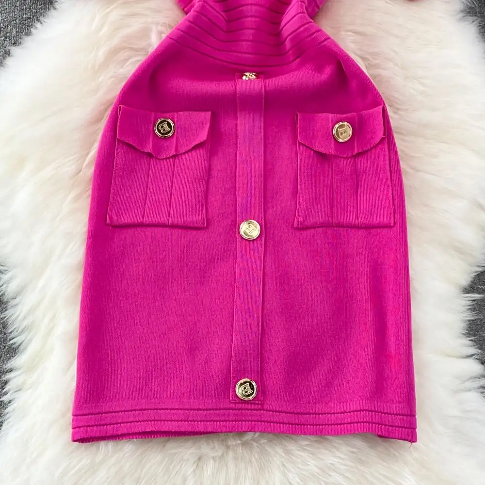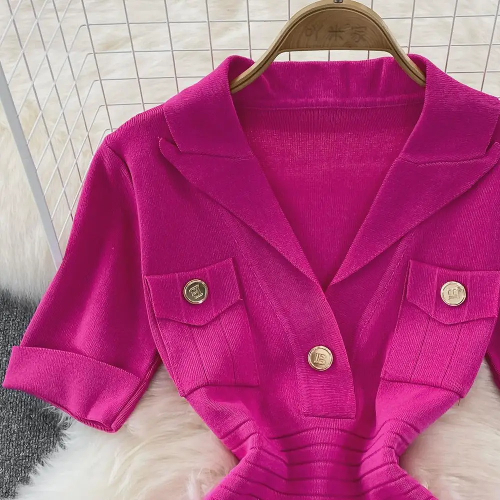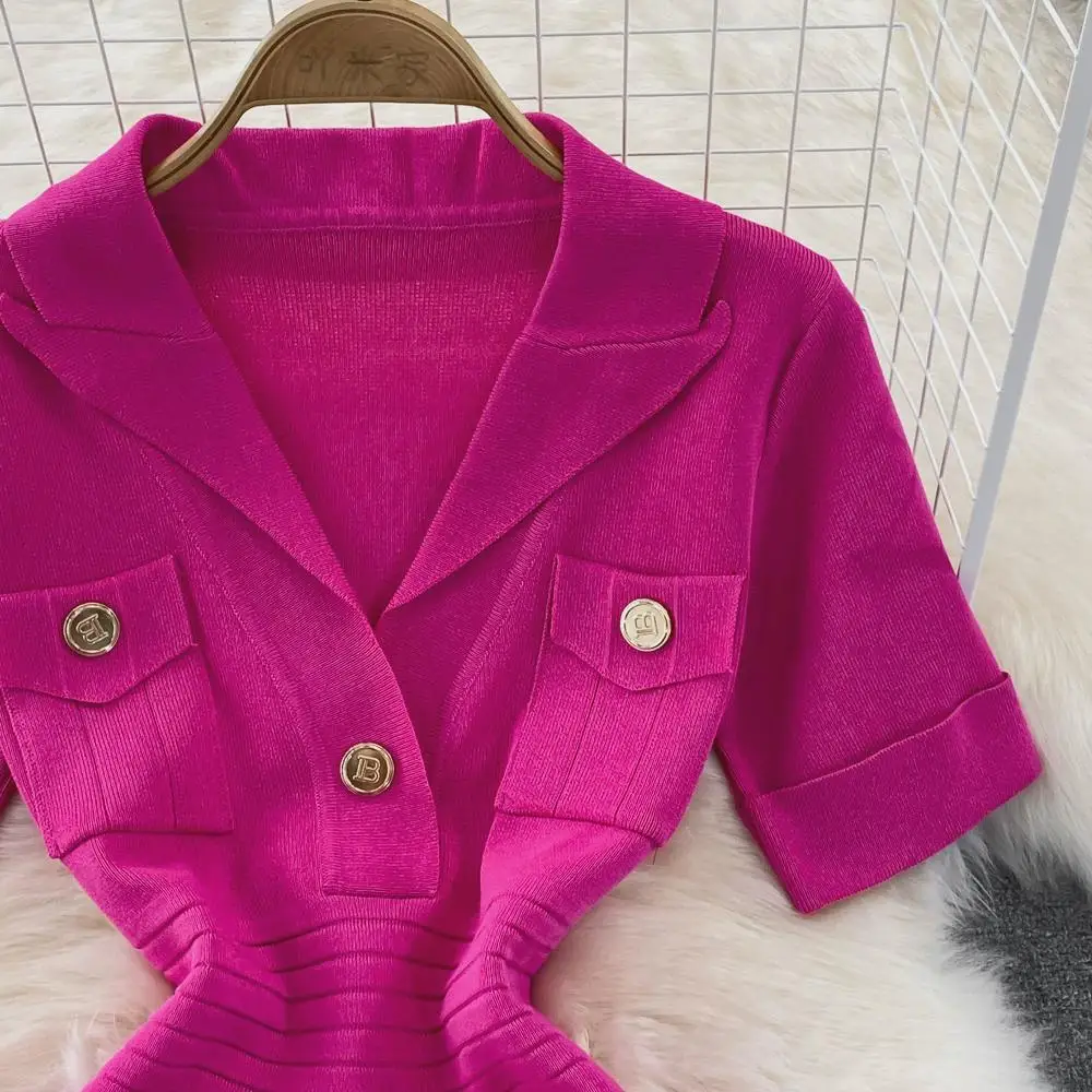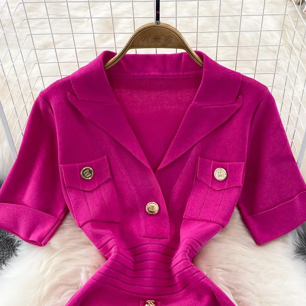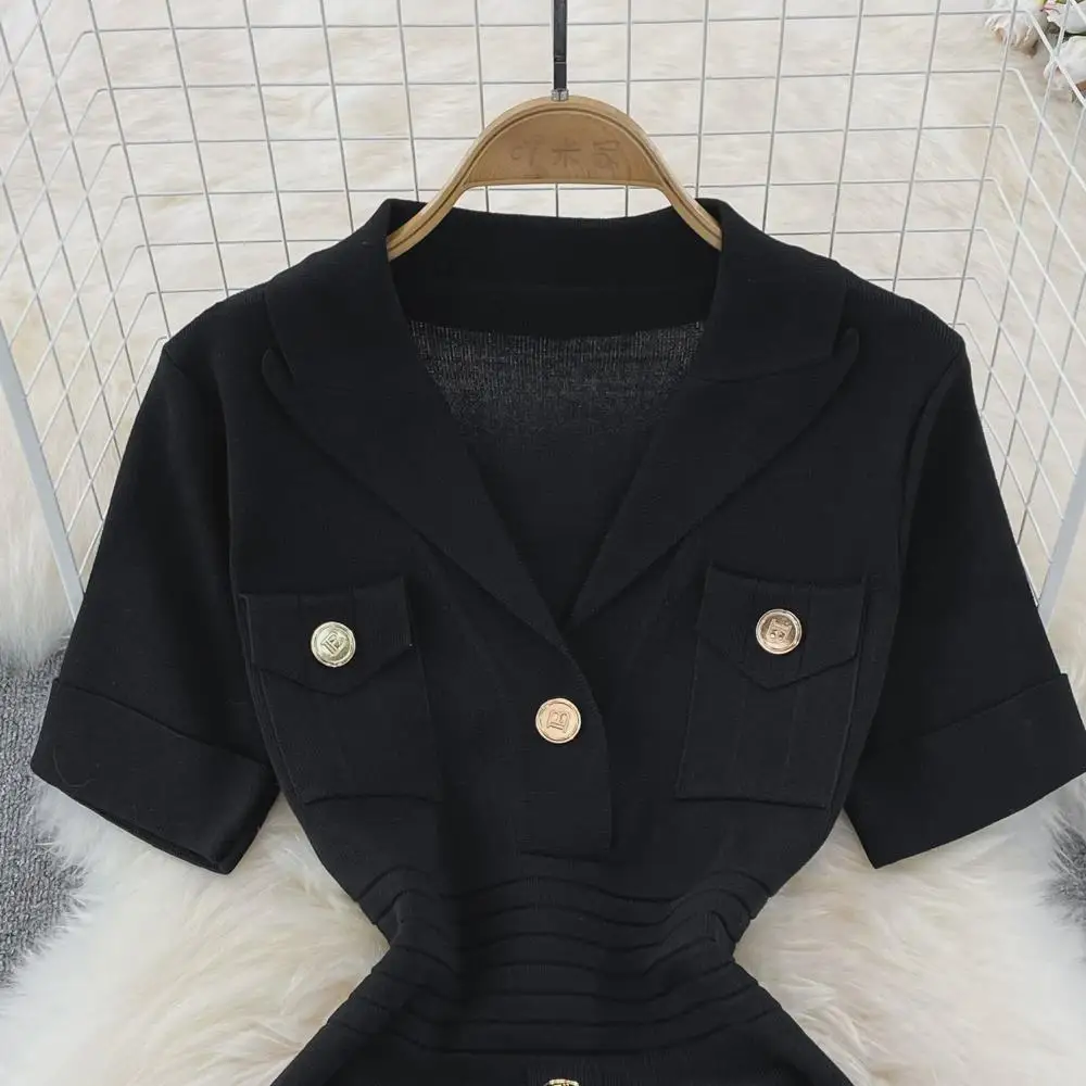 New York’s Fashion 2025 New Summer Buttons Vintage Knitted Women’s Dresses High Waist Solid V-neck Sheath Wrap Sexy Mini Dress Female