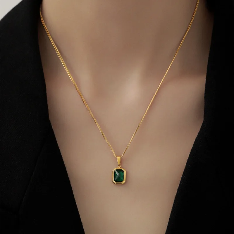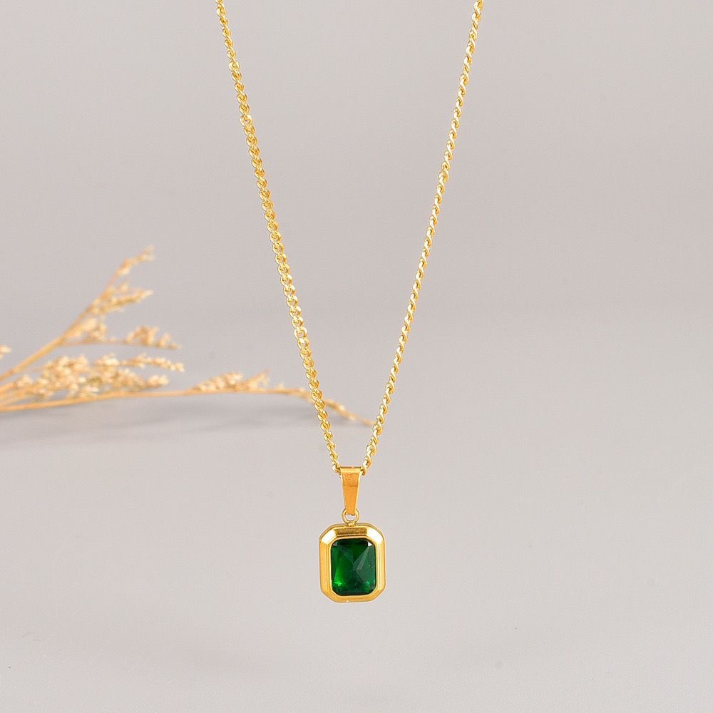 New York’s Fashion 316L Stainless Steel Gold Plated Emerald Zirconia Geometric Square Pendant Necklace For Women Girls Temperament Jewelry
