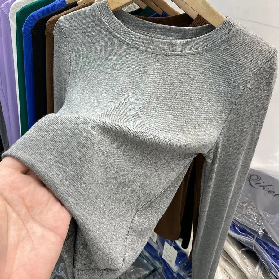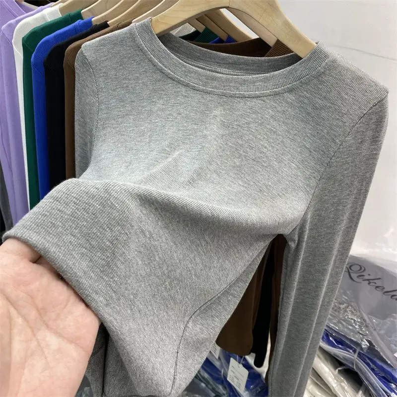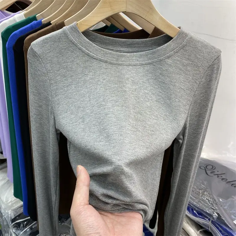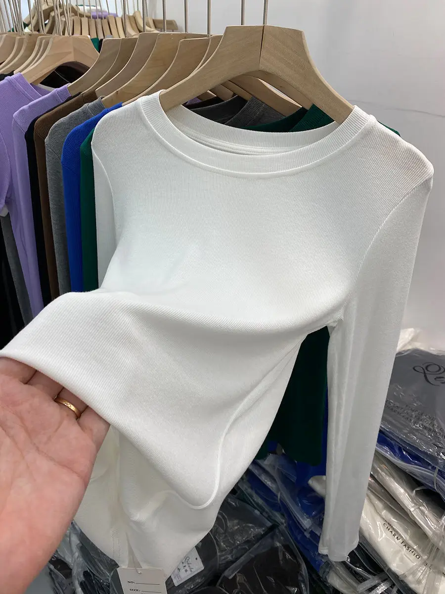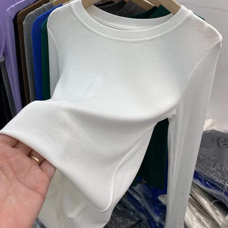 New York’s Fashion Autumn Office Lady O-Neck Elastic T-Shirt Women Base Layer Shirt Thin Slim Casual Top Screw Thread Long Sleeve Women T Shirt