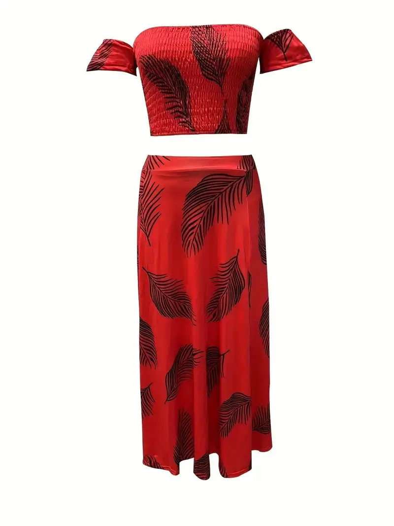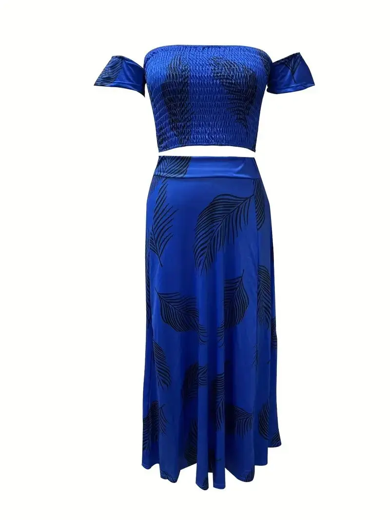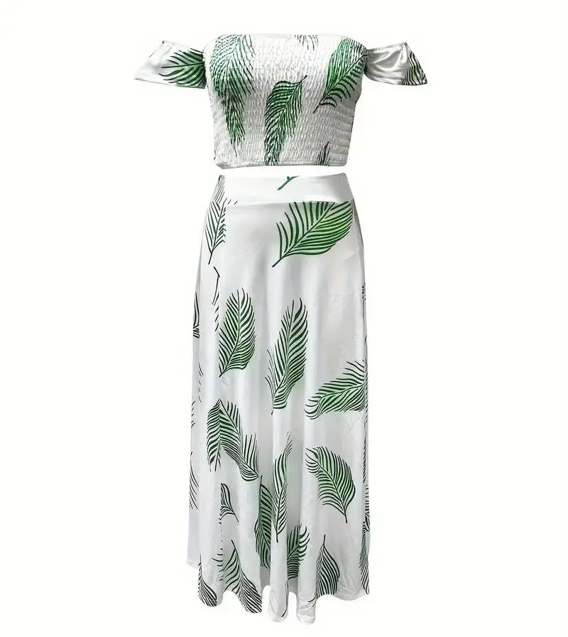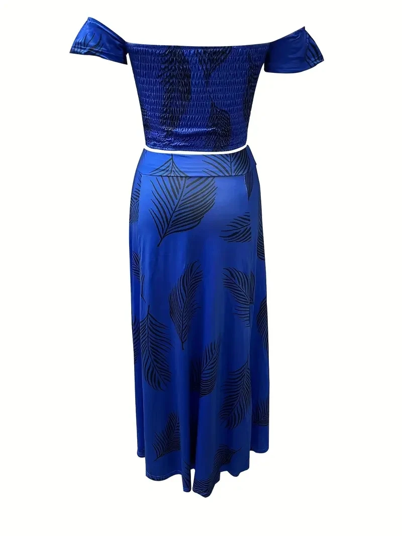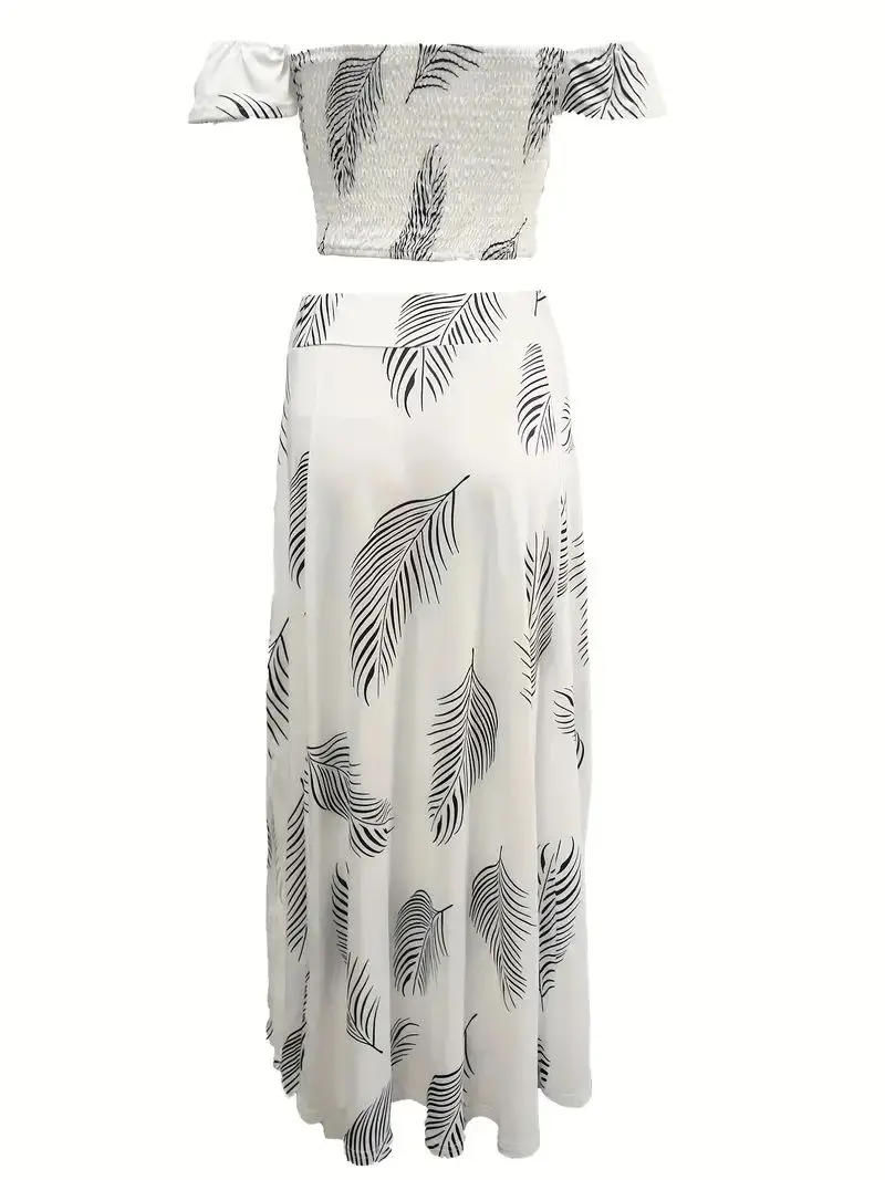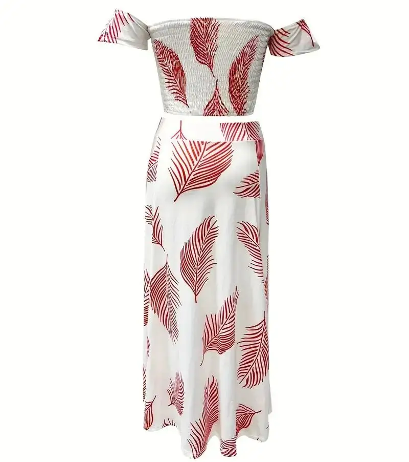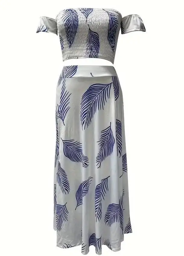 New York’s Fashion Bohemian Two-piece Set Women’s Off-shoulder Elastic Solid Color Vest With feather Print High Waist Slit Skirt Set