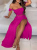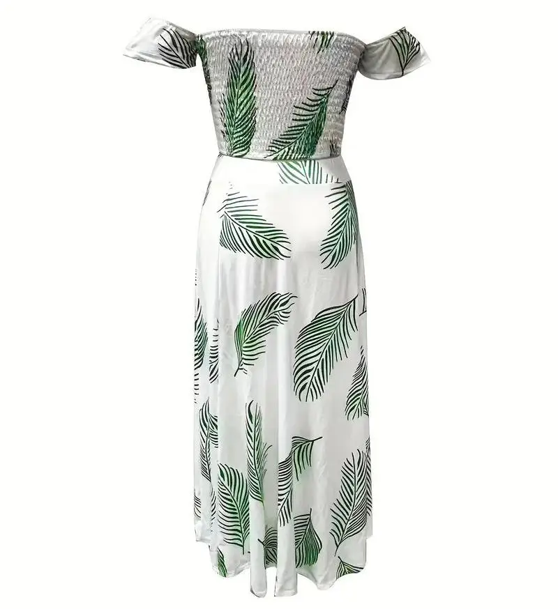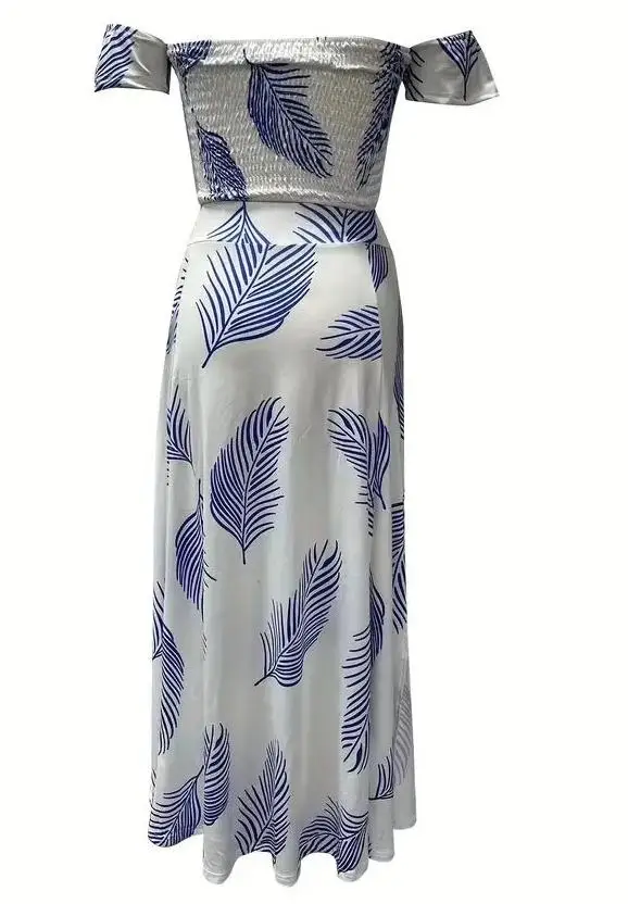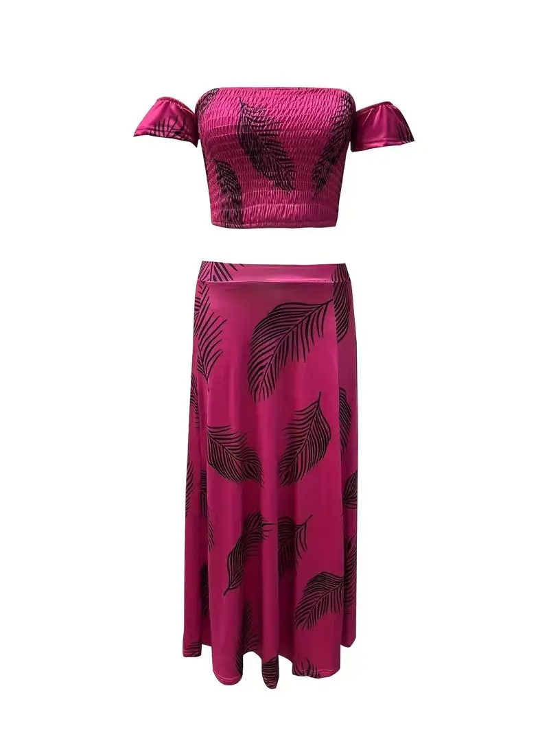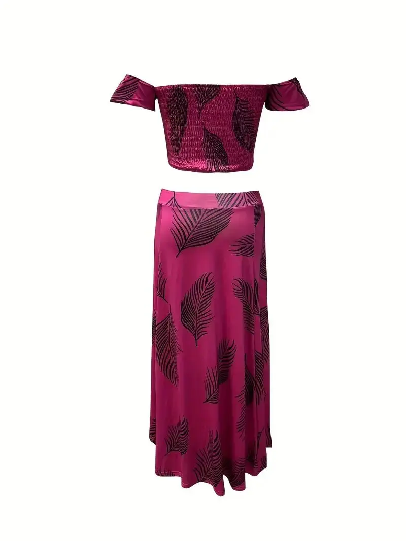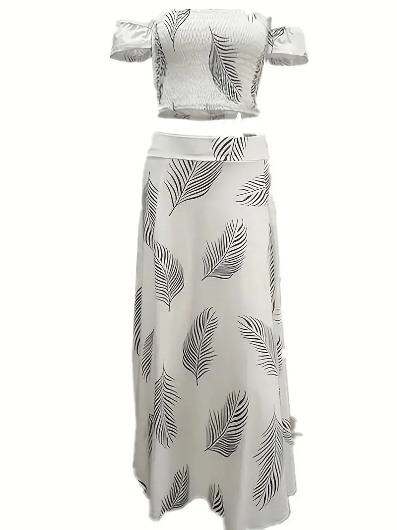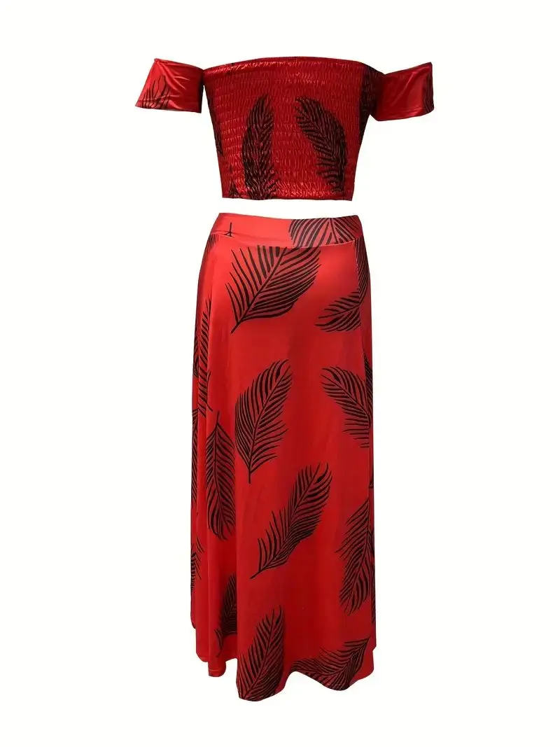 New York’s Fashion Bohemian Two-piece Set Women’s Off-shoulder Elastic Solid Color Vest With feather Print High Waist Slit Skirt Set