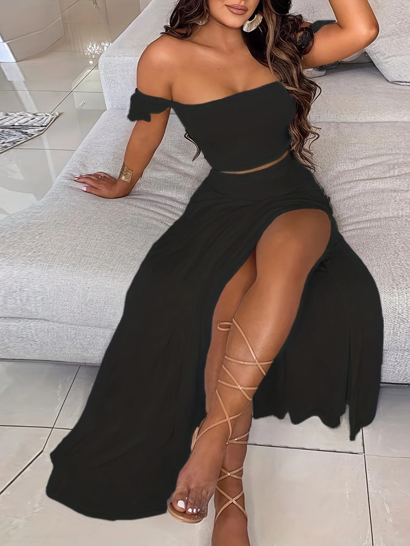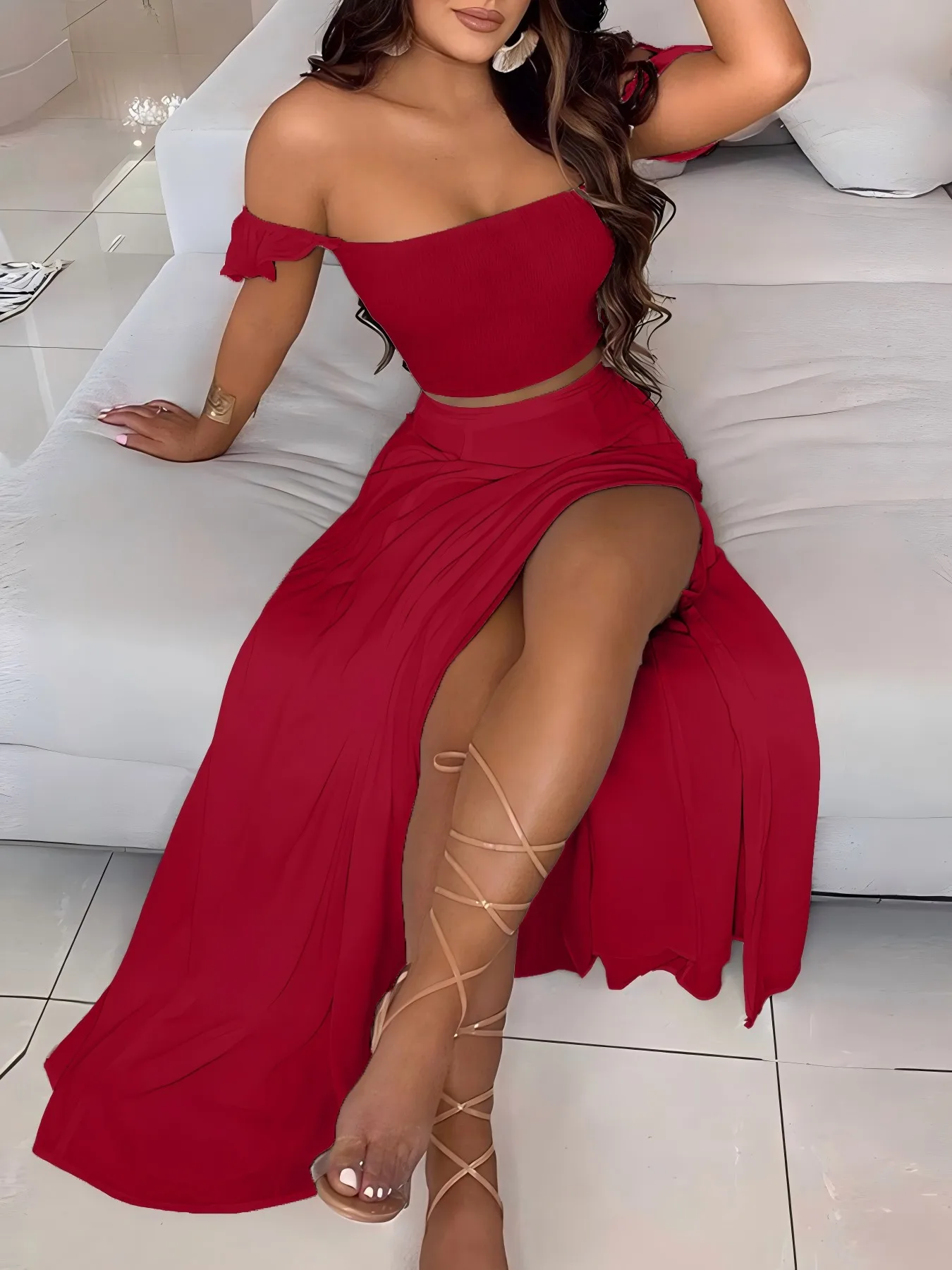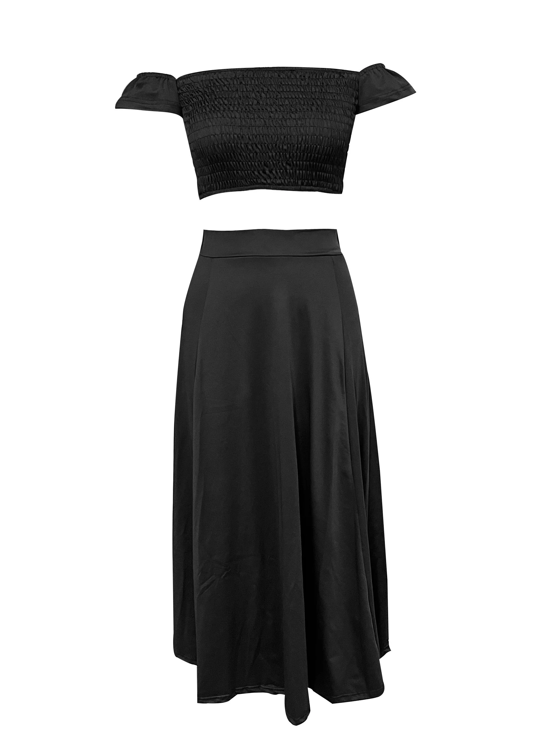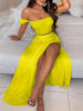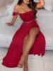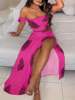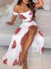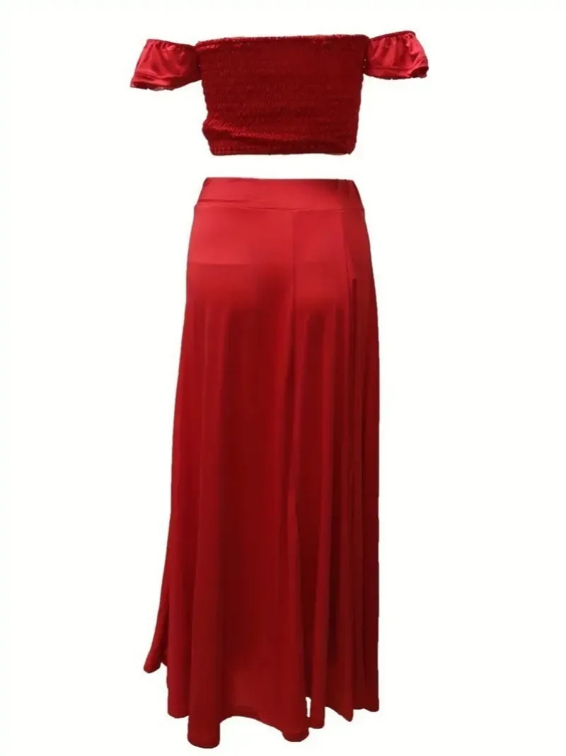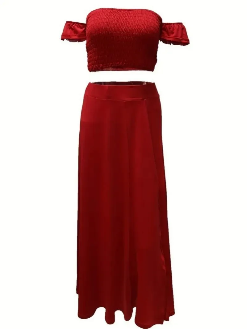 New York’s Fashion Bohemian Two-piece Set Women’s Off-shoulder Elastic Solid Color Vest With feather Print High Waist Slit Skirt Set