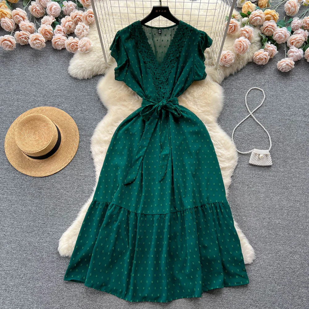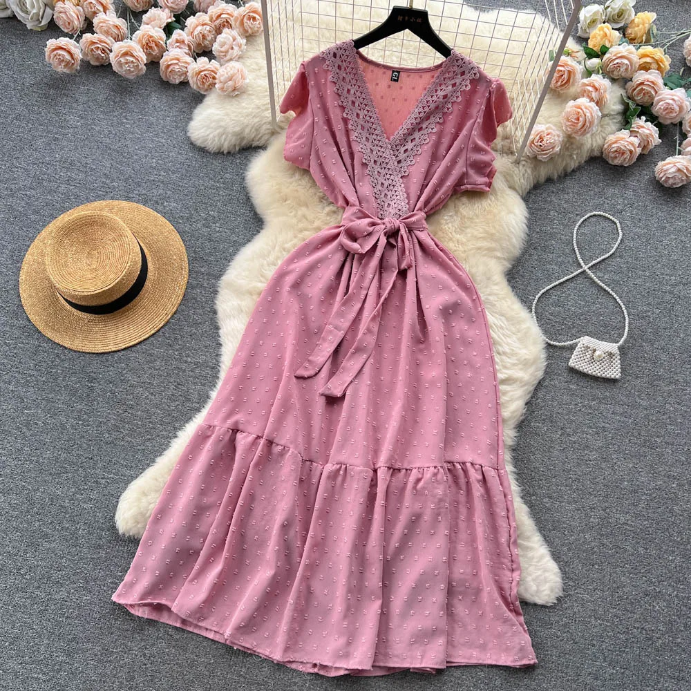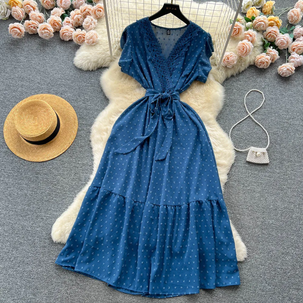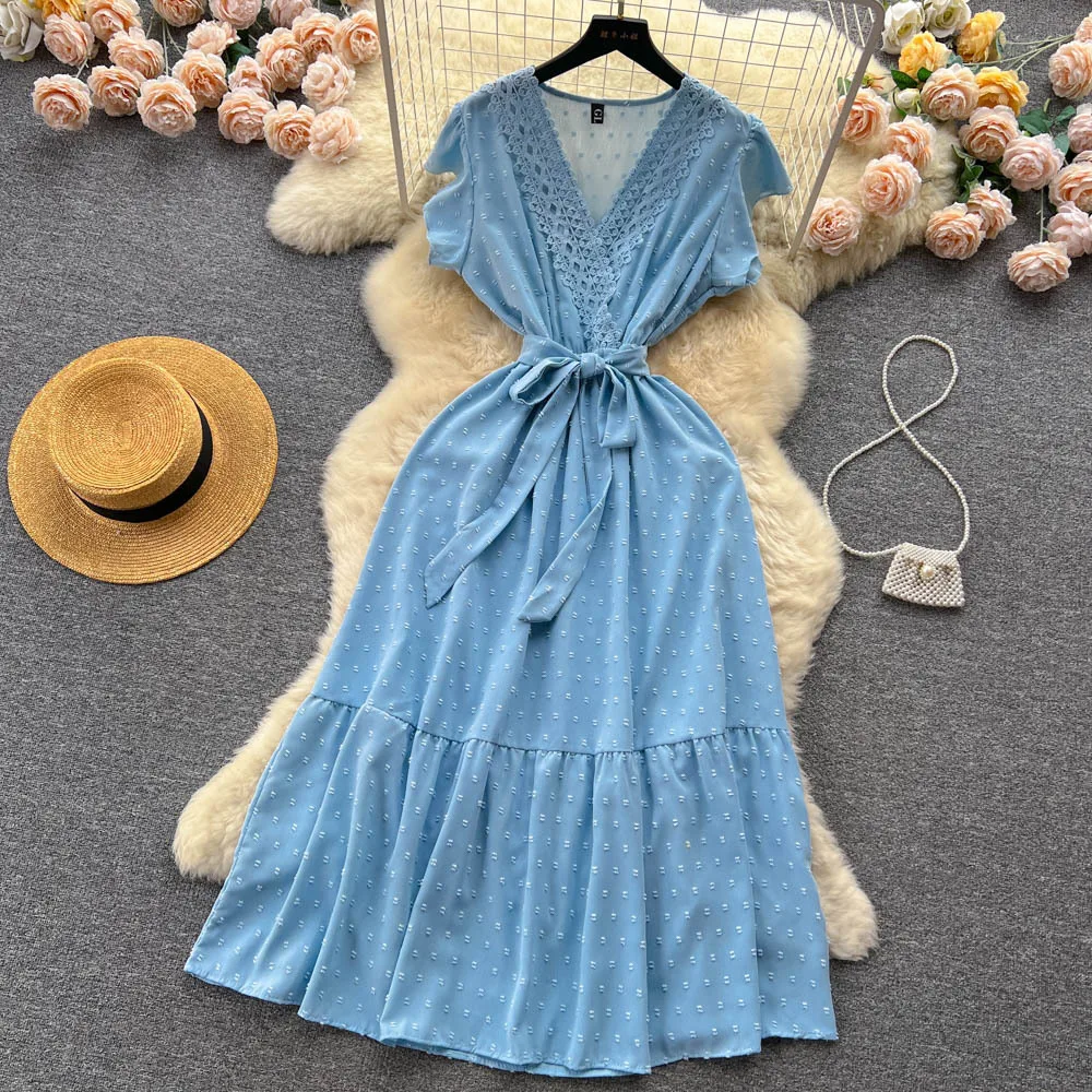 New York’s Fashion Chic Fashion Lace Patchwork Long Summer Dress Women V-neck Big Swing Vacation Belt Beach Vestidos Chiffon Robe Femme