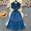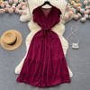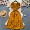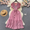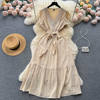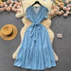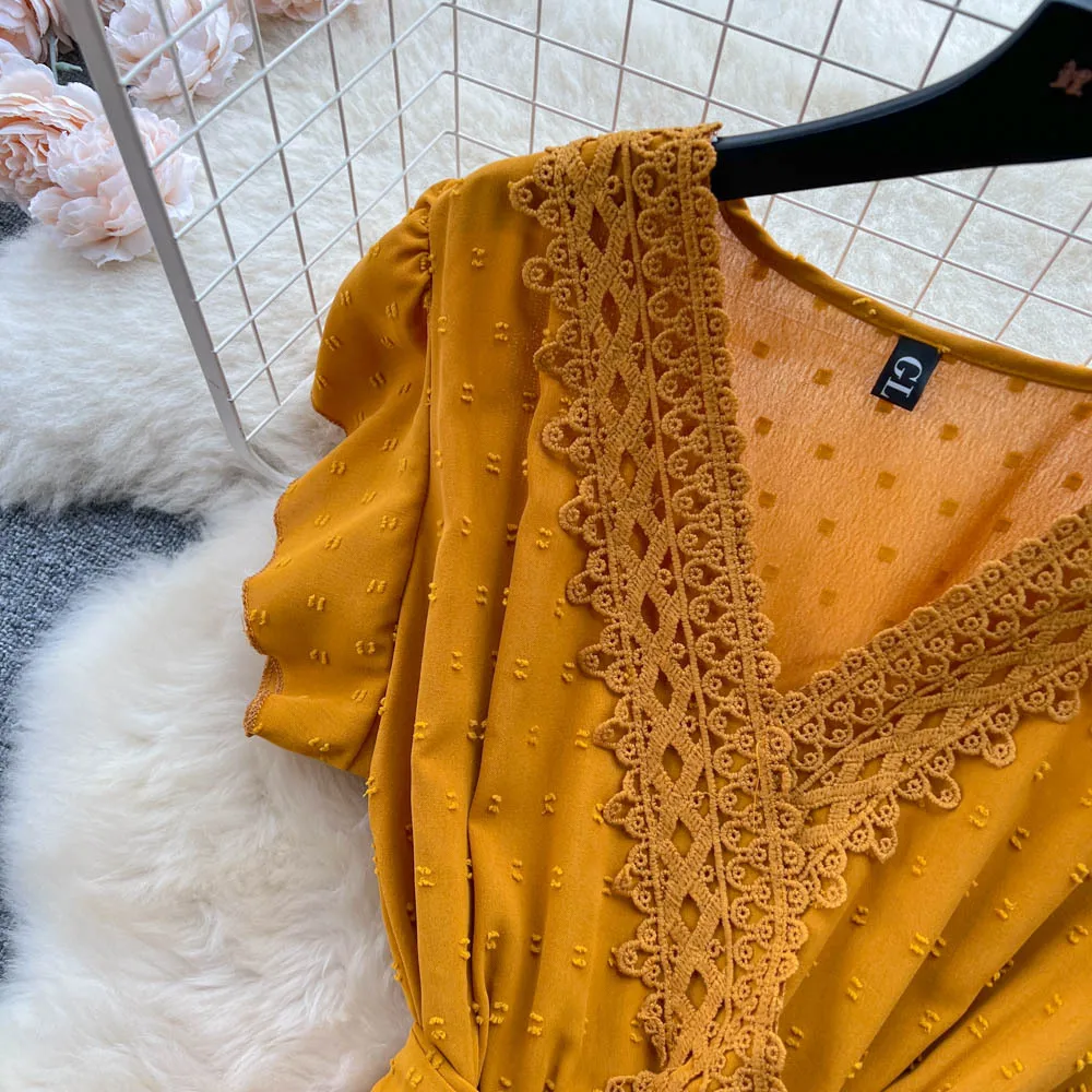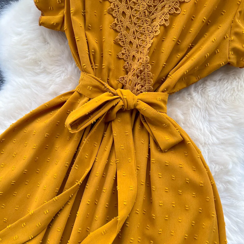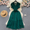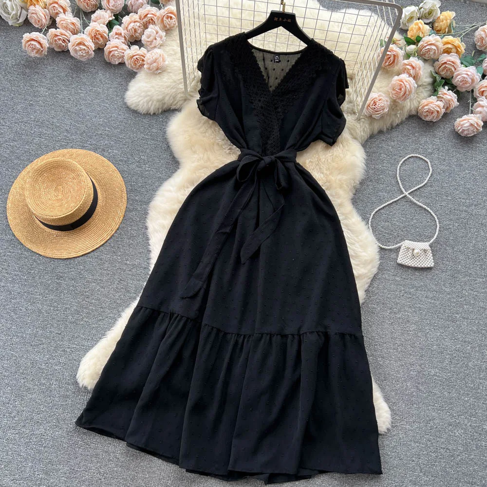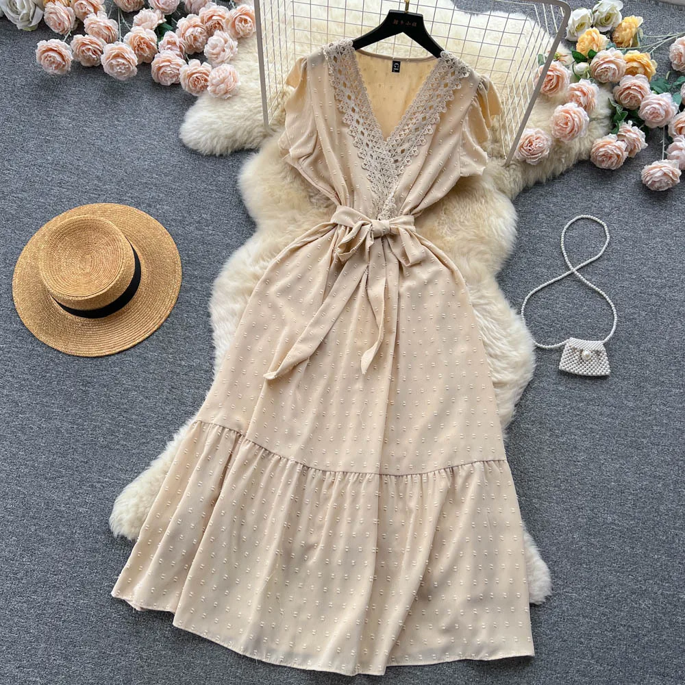 New York’s Fashion Chic Fashion Lace Patchwork Long Summer Dress Women V-neck Big Swing Vacation Belt Beach Vestidos Chiffon Robe Femme