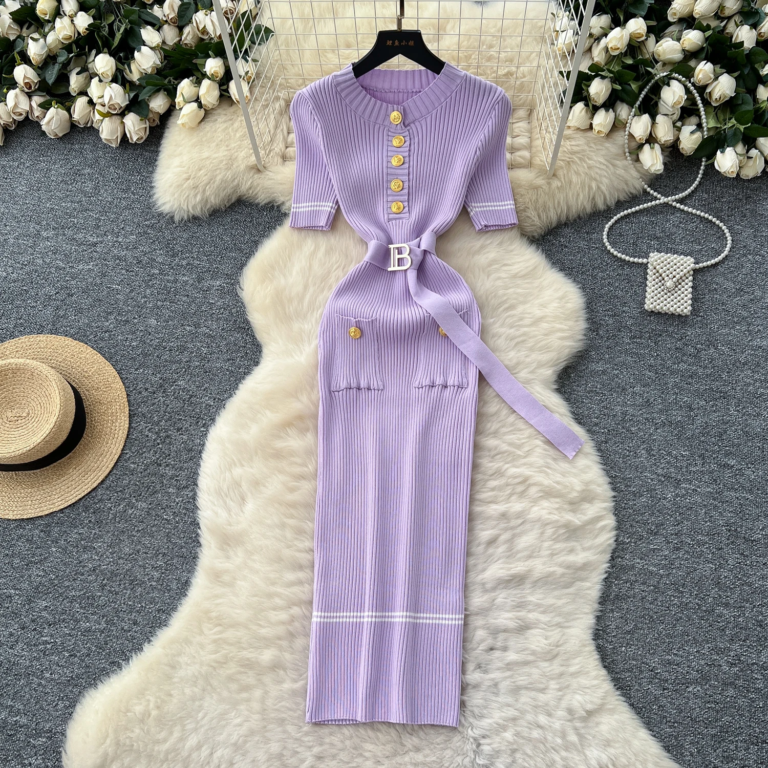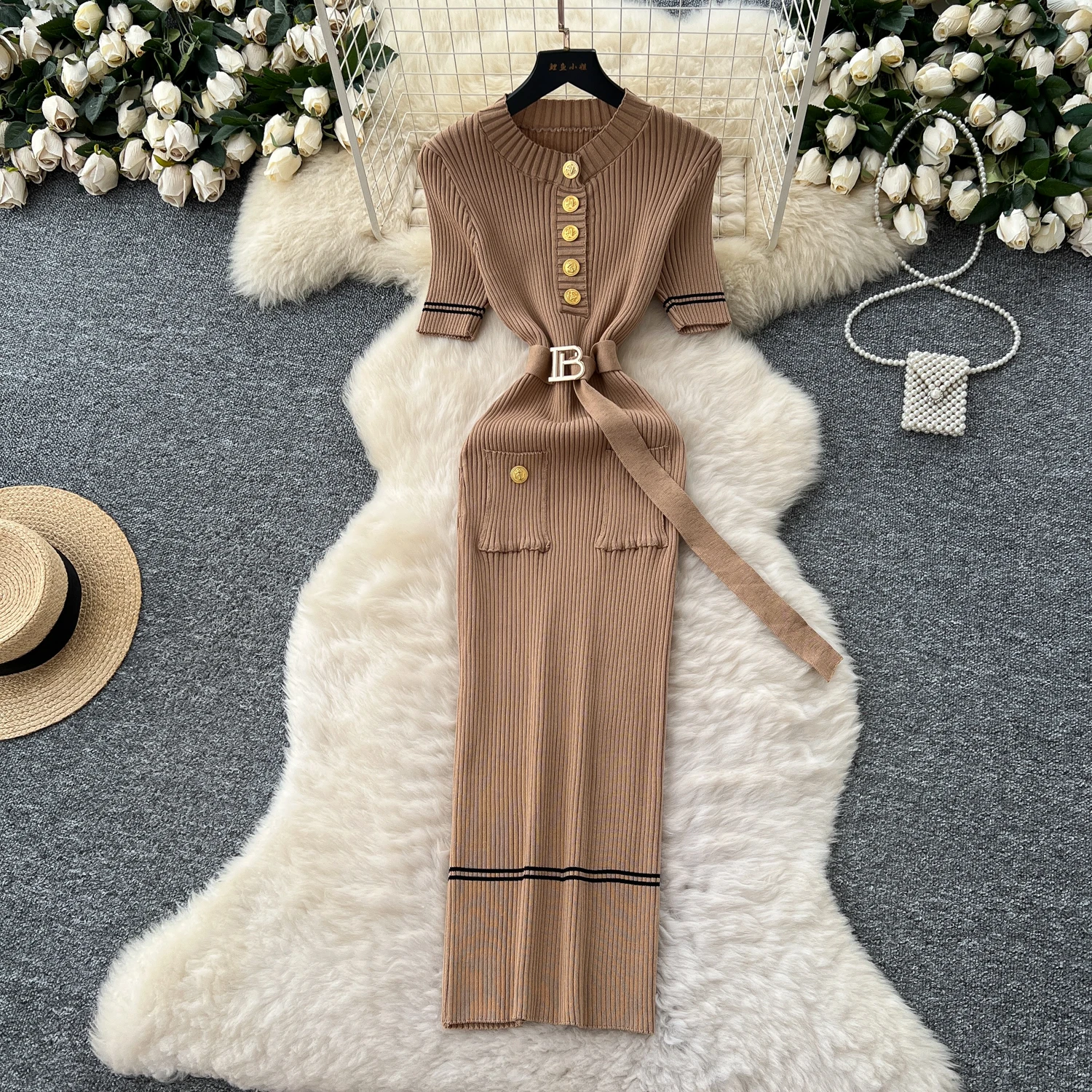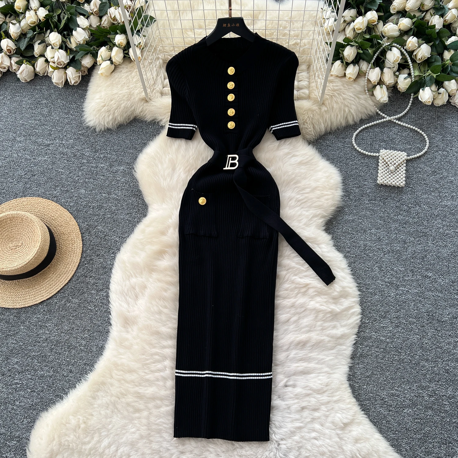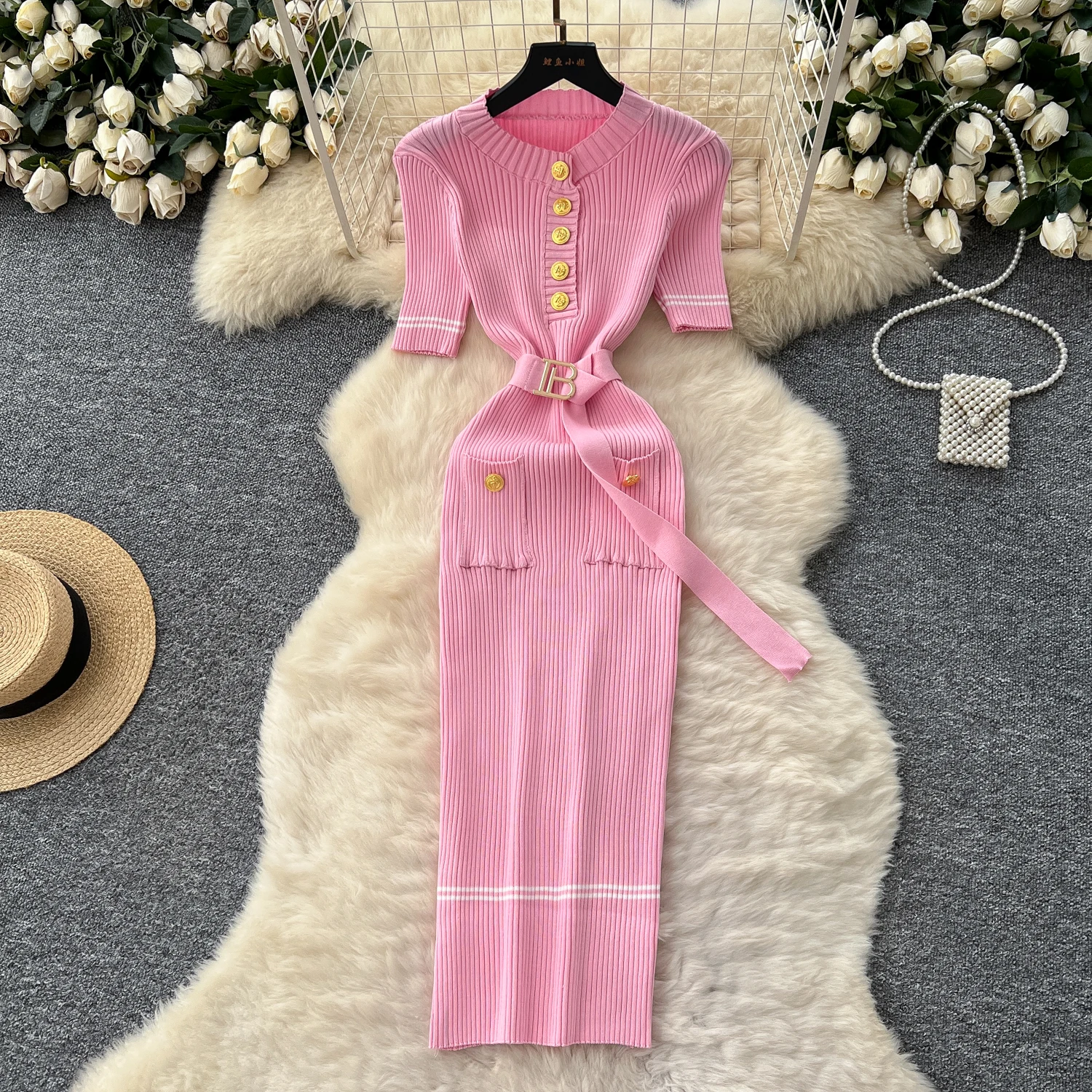 New York’s Fashion Chic Fashion Sexy Package Hips Knitted Long Dress Spring Summer Elegant O-neck Buttons Office Lady Belt Sweater Dress