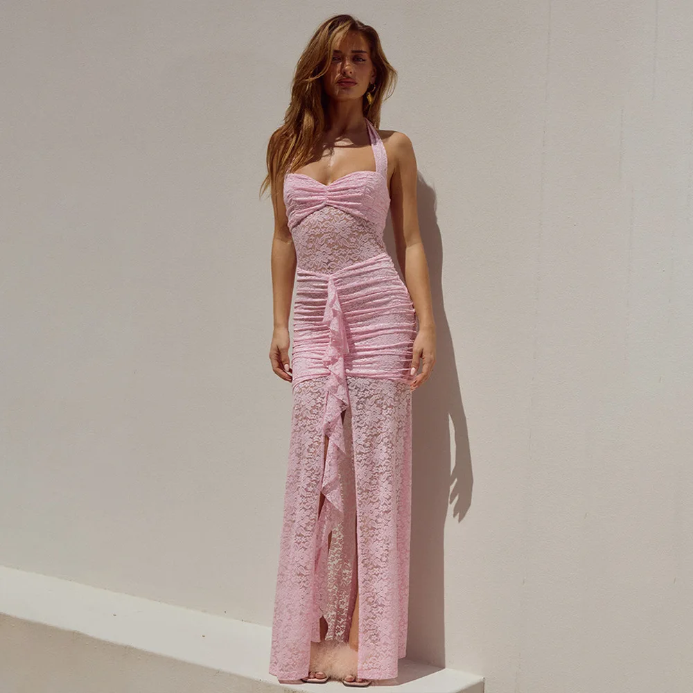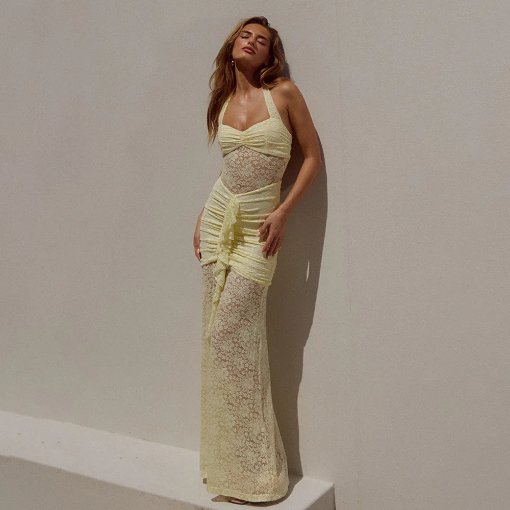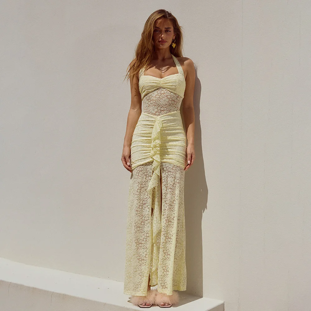 New York’s Fashion Elegant Hanging Collar Lace Double Layer Dress Women 2025 Summer Long Skirt Sexy Sleeveless Backless Slim Evening Dress