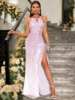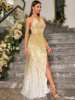 New York’s Fashion Elegant Keyhole Neck Split Thigh Sequin Formal Dress