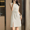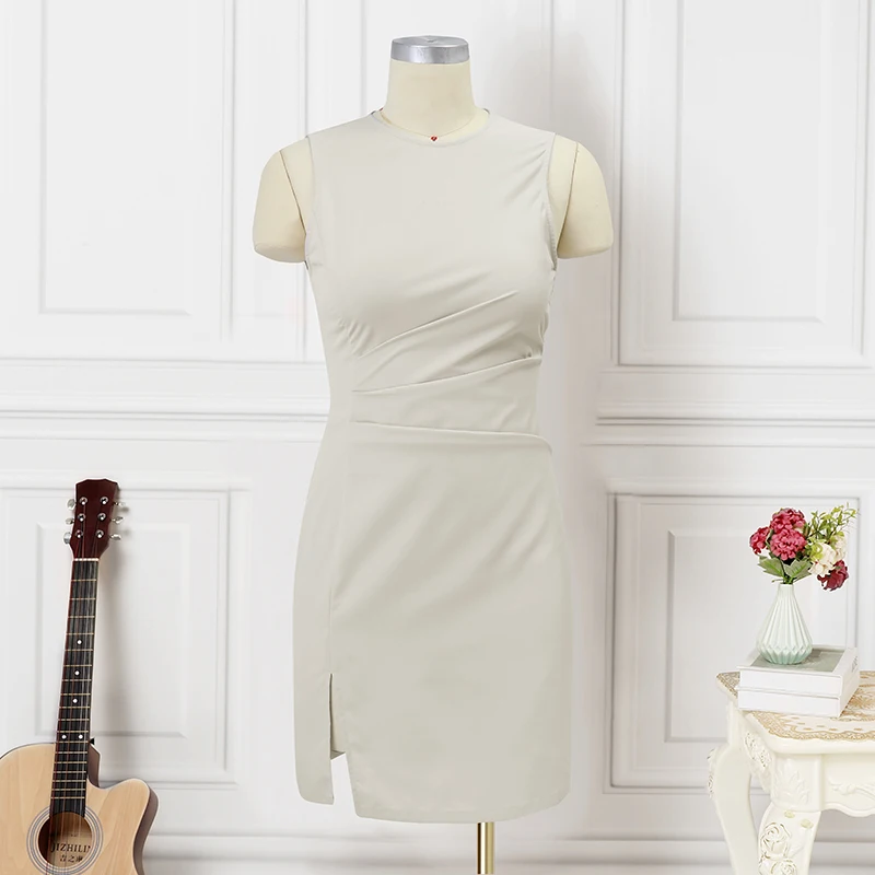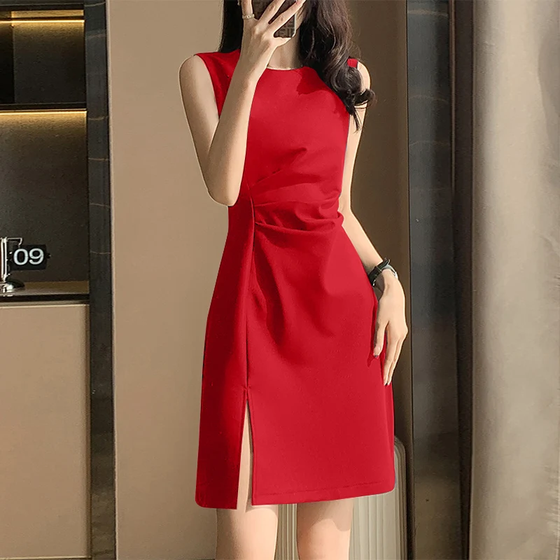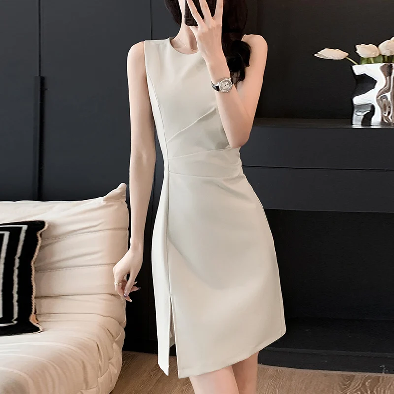 New York’s Fashion Elegant Mini Dress Summer Women Sleeveless O-neck Tank Dress Fashion Draped Short Robes Office Slit Hem Party Vestidos