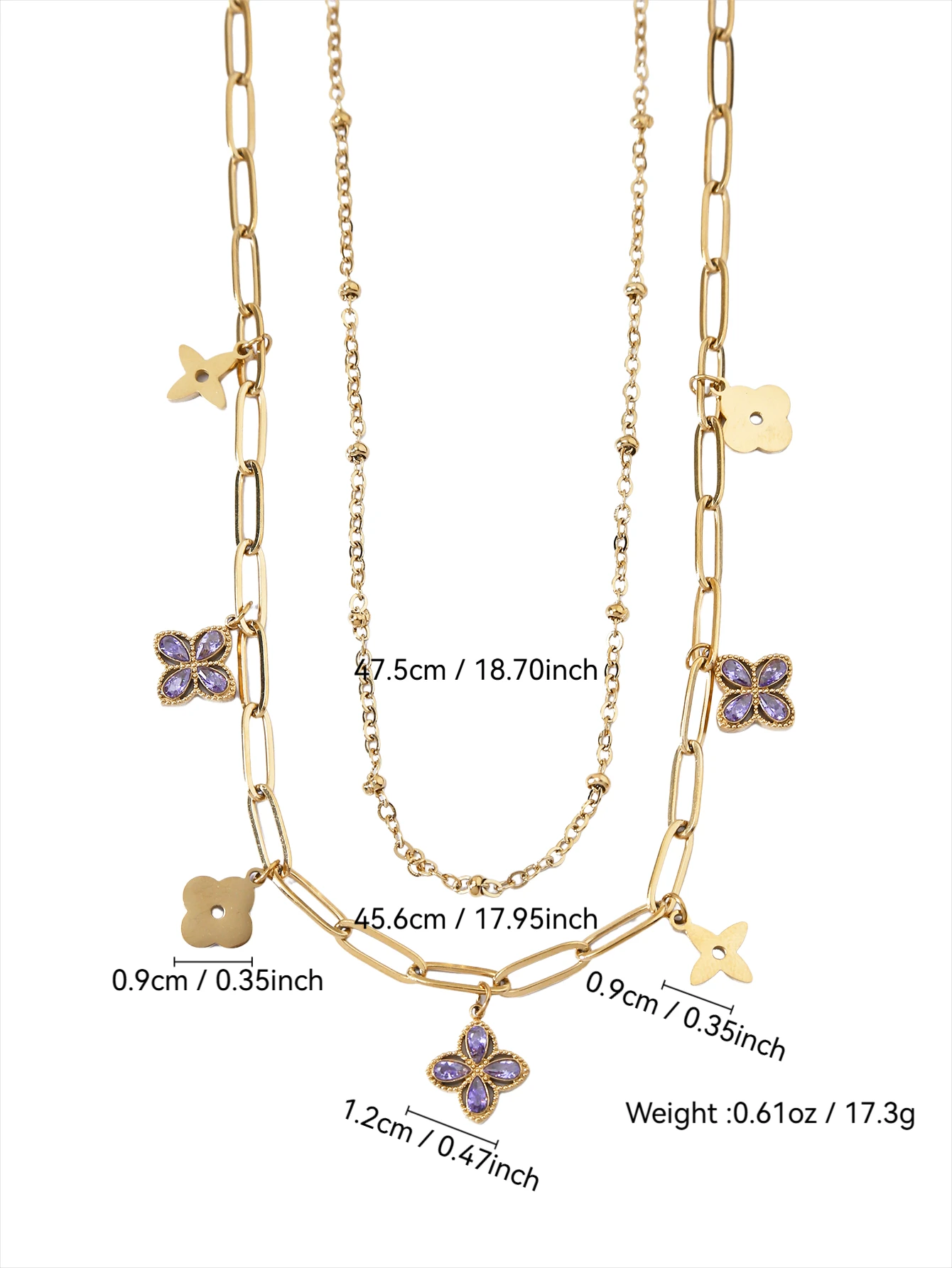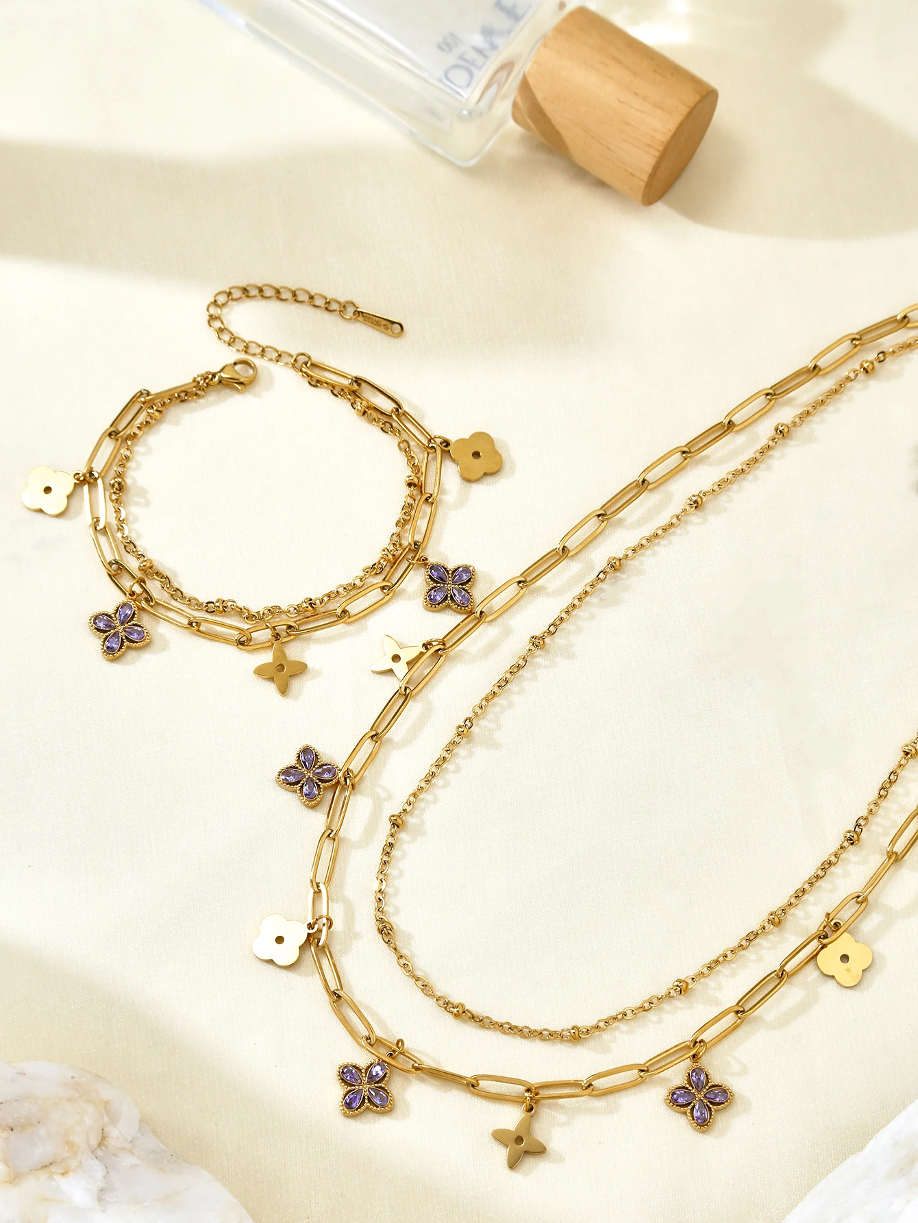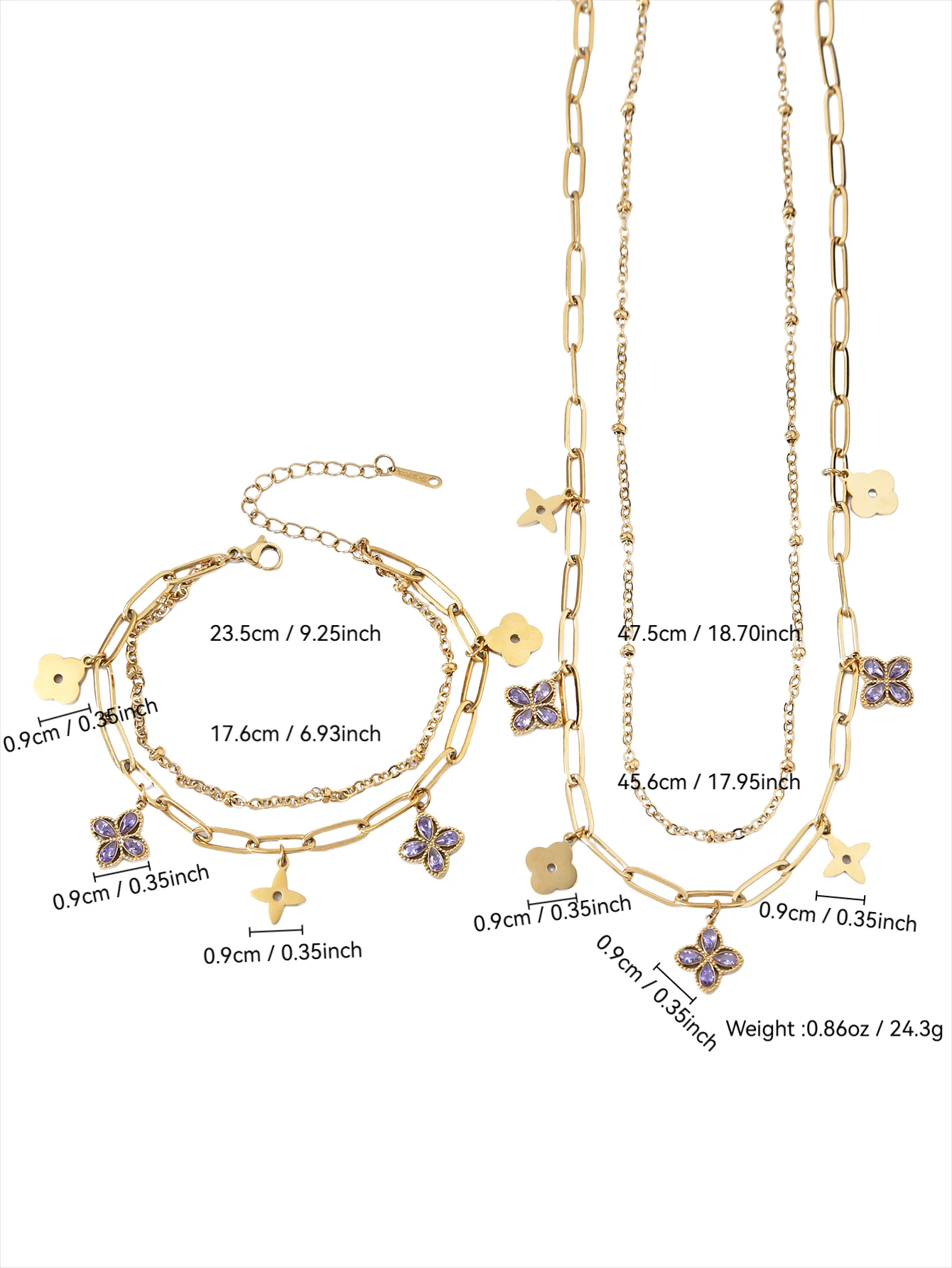 New York’s Fashion Elegant Vintage-Chic Luxury Stainless Steel 18K Gold-Plated Purple Diamond Four-Leaf Clover Necklace And Bracelet Set For Women
