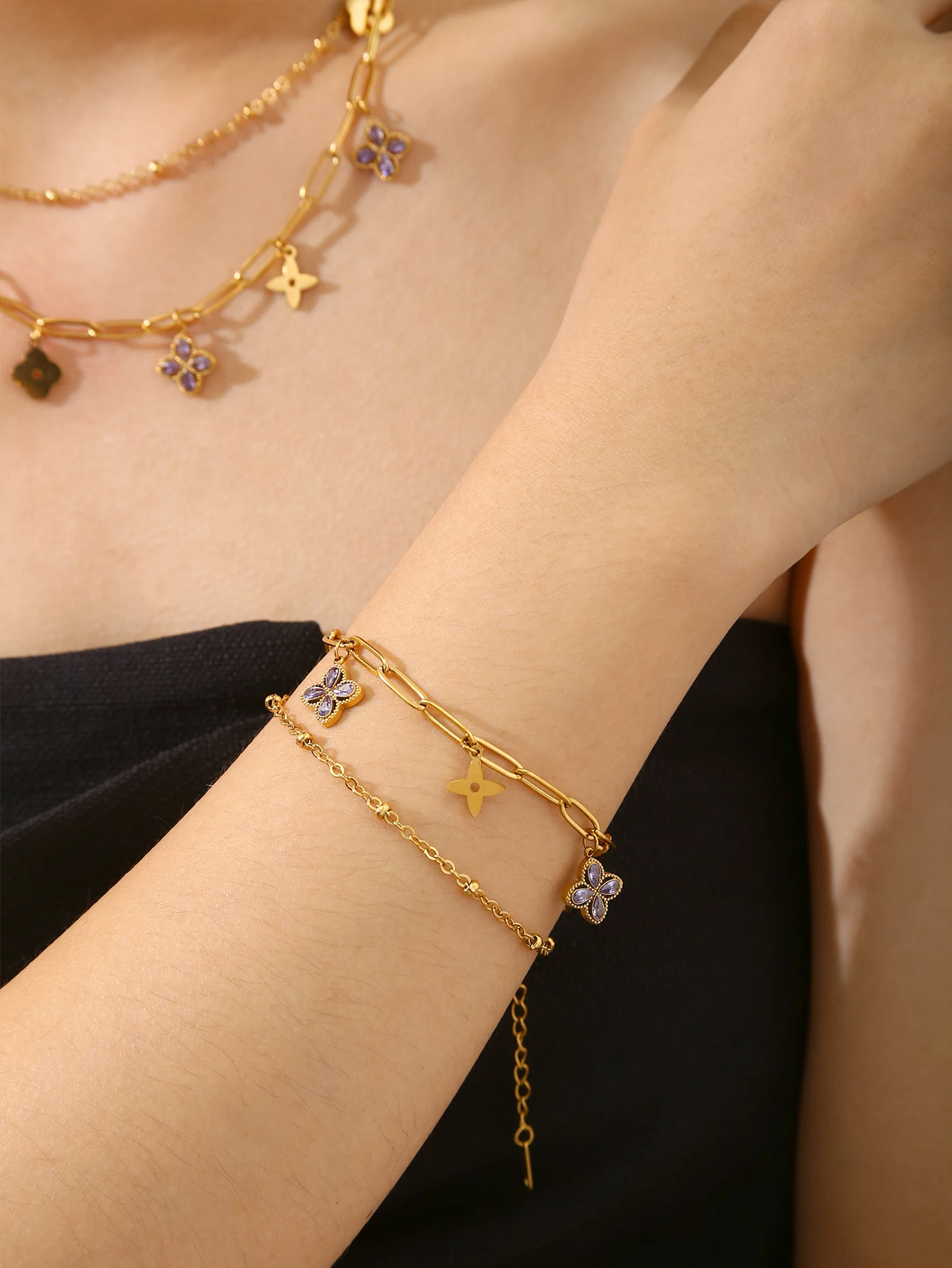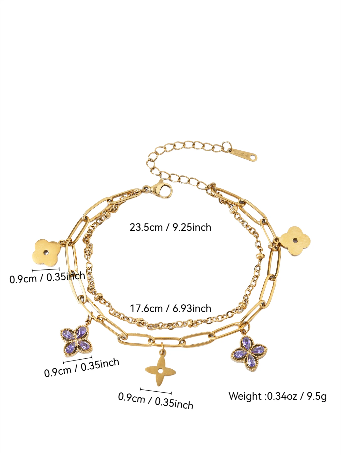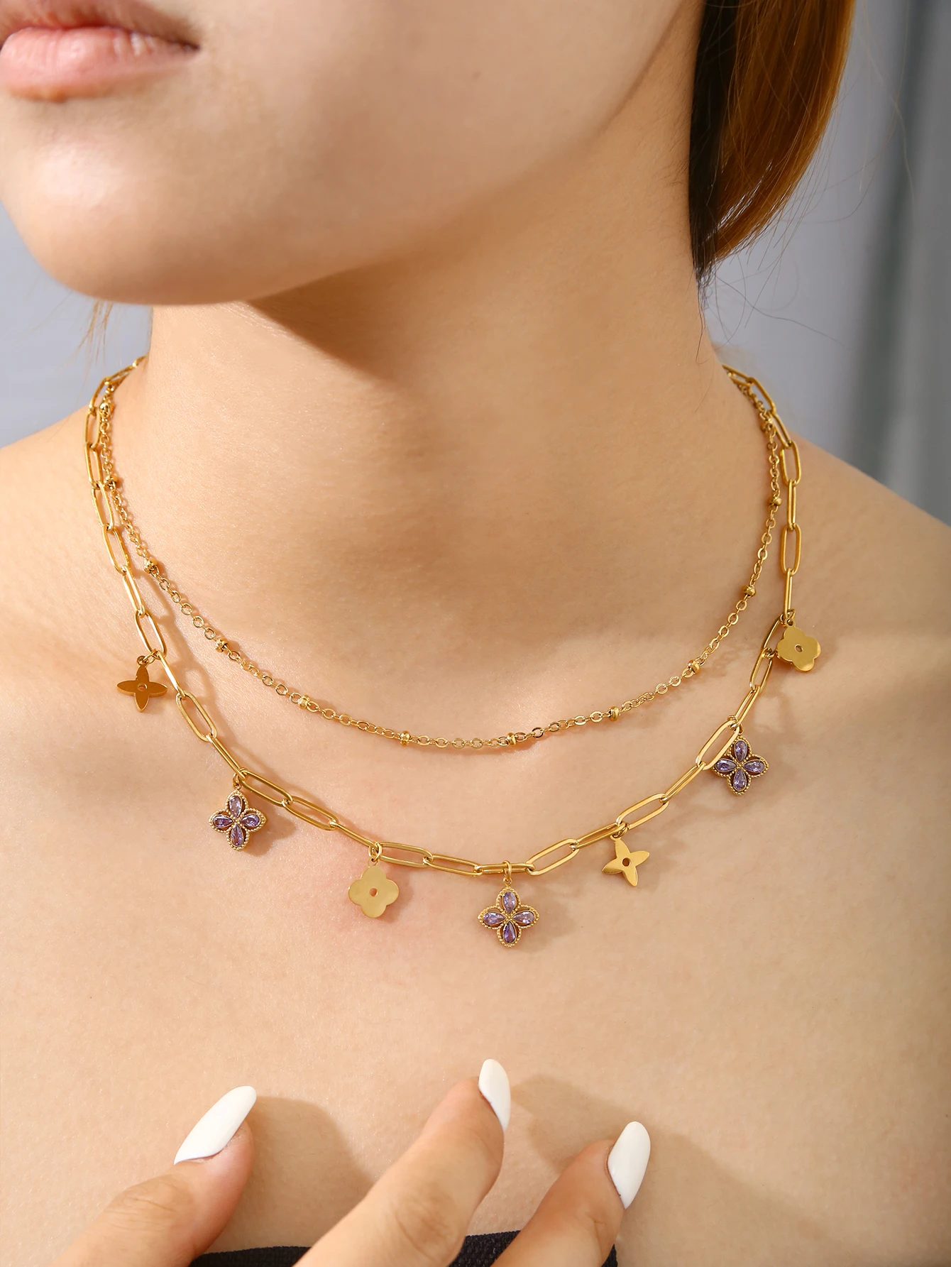 New York’s Fashion Elegant Vintage-Chic Luxury Stainless Steel 18K Gold-Plated Purple Diamond Four-Leaf Clover Necklace And Bracelet Set For Women