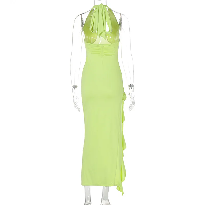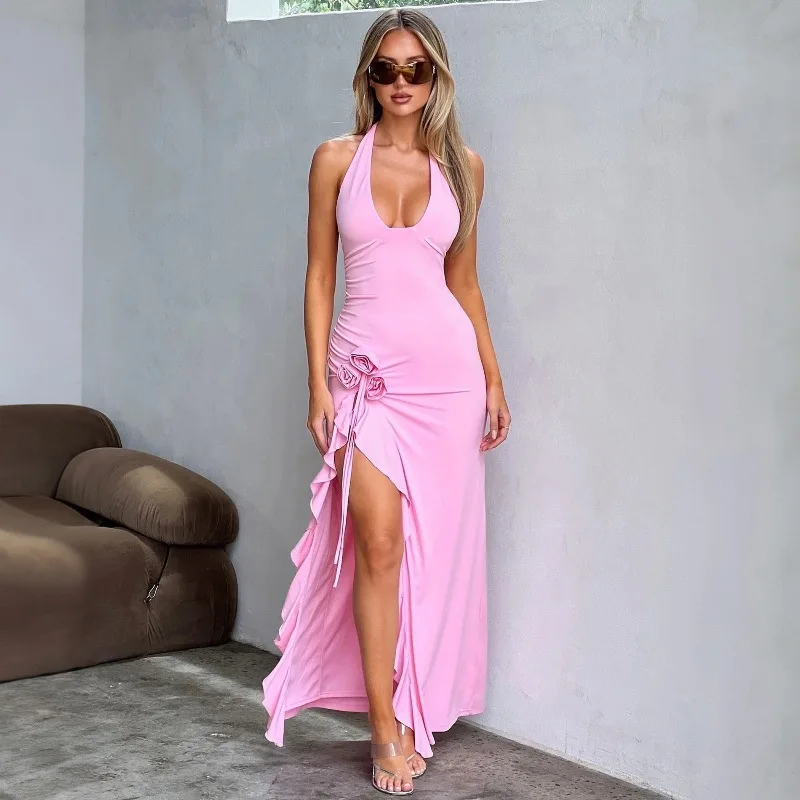 New York’s Fashion Flower Draped Split Long Dress For Women Fashion Halter Deep V Neck Sleeveless Backless Bodycon Club Party Long Dress