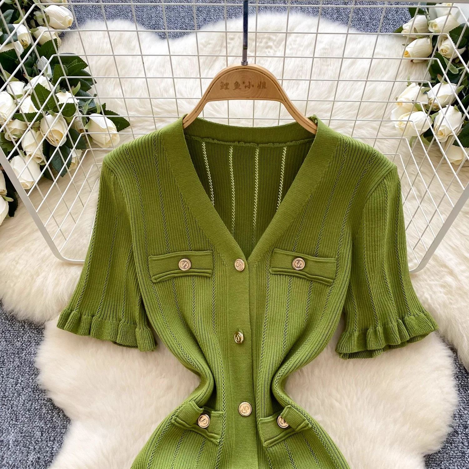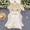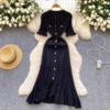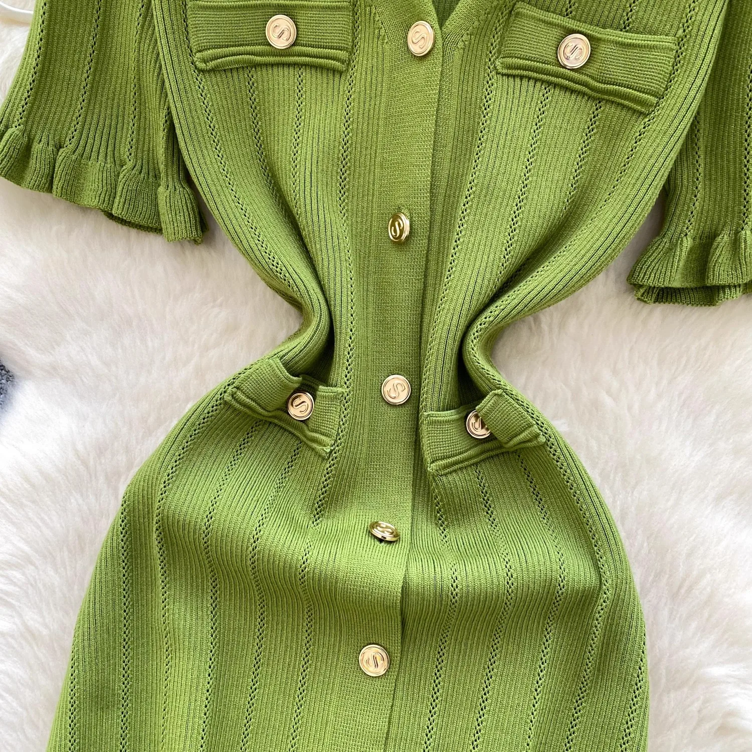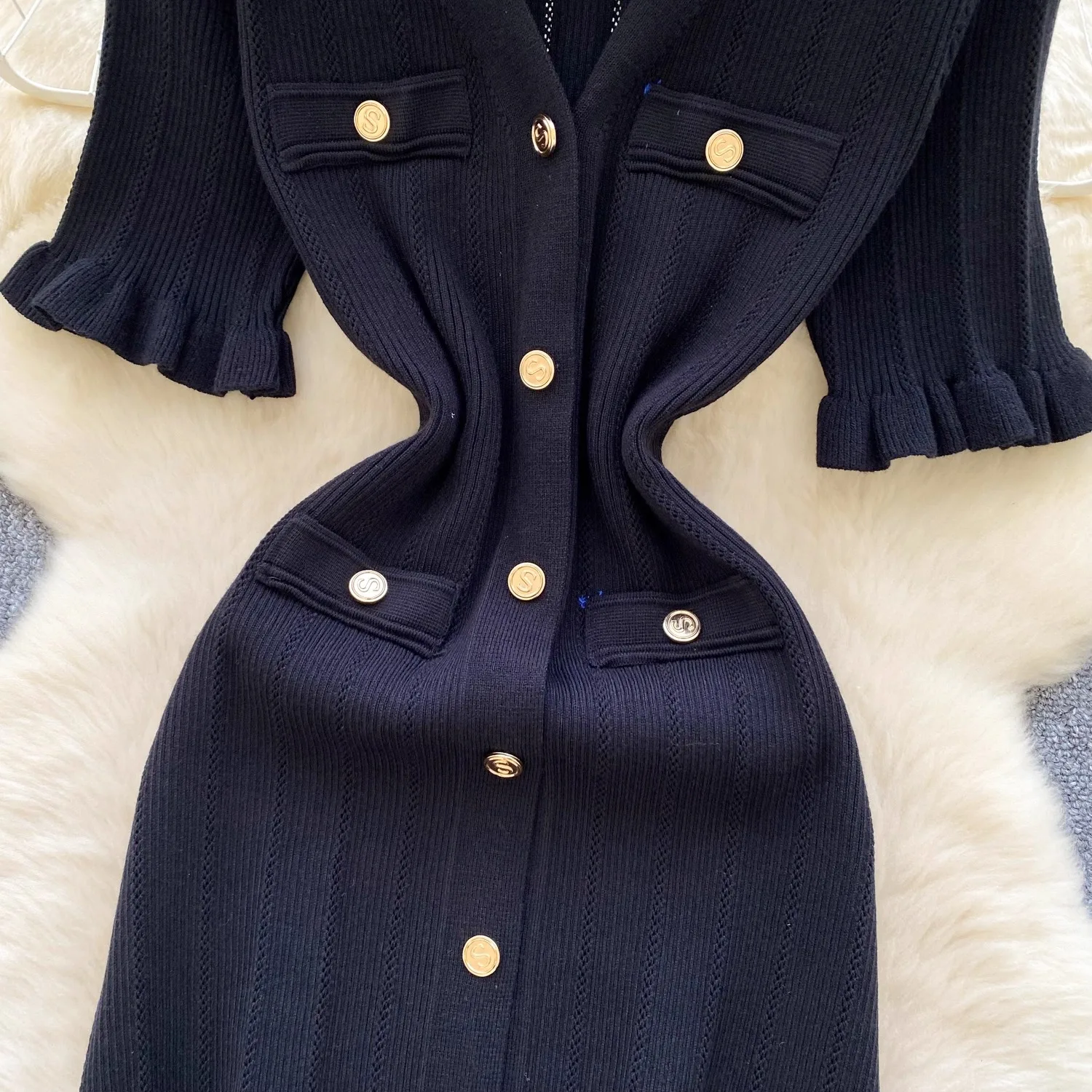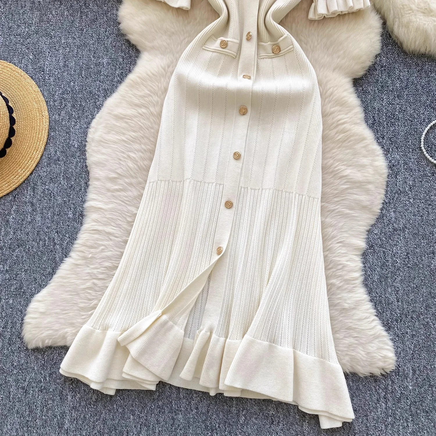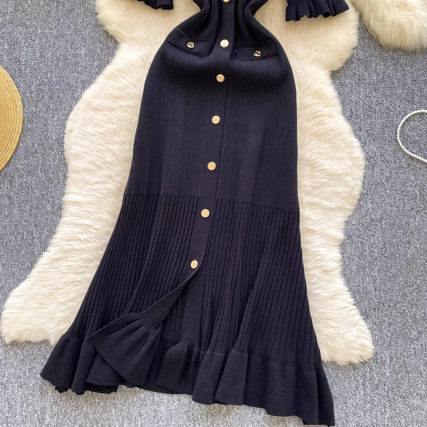 New York’s Fashion French Vintage Women Luxury Knitted Long Dress Chic Designer Ruffles Single-breasted Long Sweater Dress Lady Party Robe