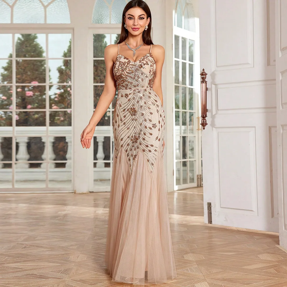 New York’s Fashion Halter V-neck sexy sequined slim fishtail long dress