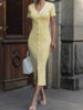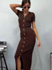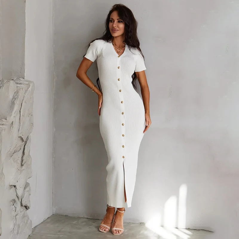 New York’s Fashion High Waist Knitted Dress For Women V Neck Buttons Short Sleeve Slim Long Dress Female Retro Elegant Commuting Outfits