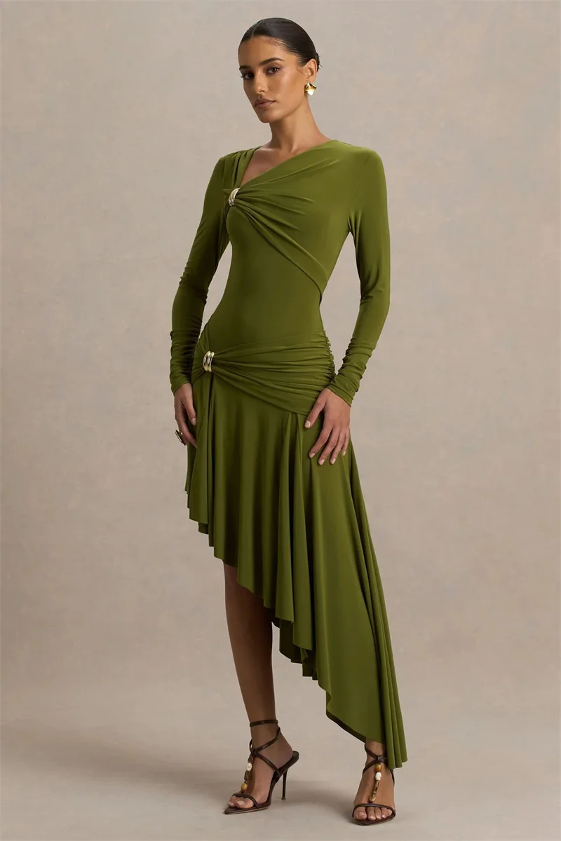 New York’s Fashion Irregular Long Sleeve Sexy Maxi Dress Women Gown Elegant Diagonal Collar Split Ruffle Ruched Club Party Long Dresses