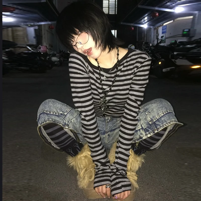 New York’s Fashion Japanese Y2k T-shirt Women Long Sleeve Off Shoulder Striped Crop Tops Y2k Grunge 2000s Aesthetic Streetwear T Shirts
