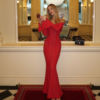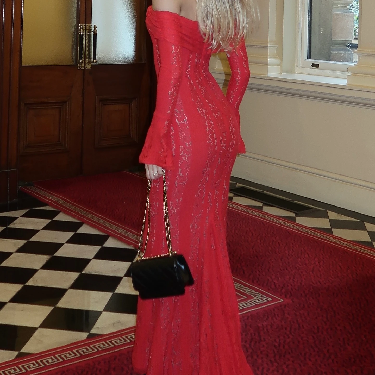 New York’s Fashion Maxi Wedding Guest Dress Women 2025 Elegant Off The Shoulder evening party dresses red lace flare sleeve dress