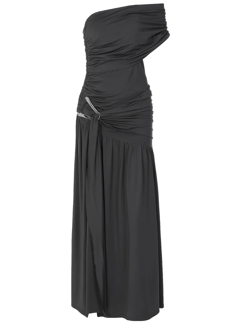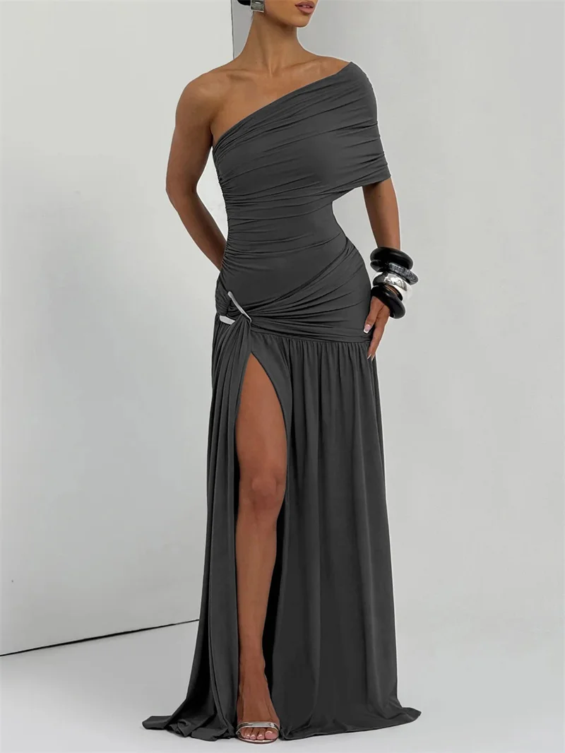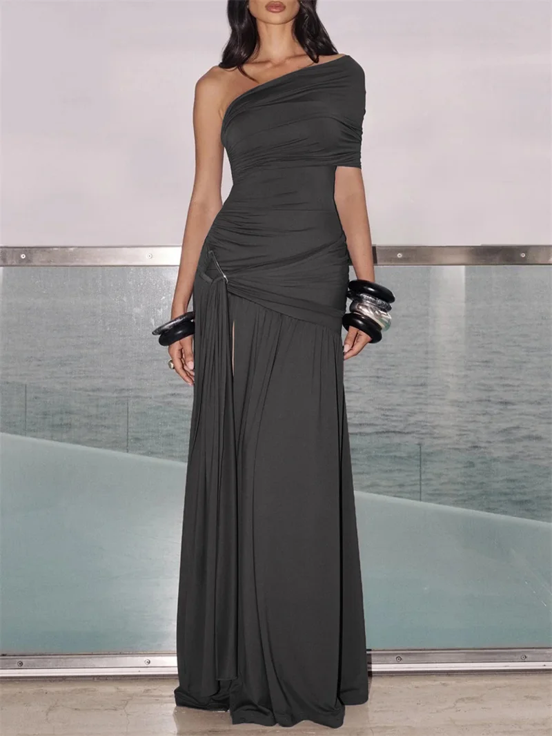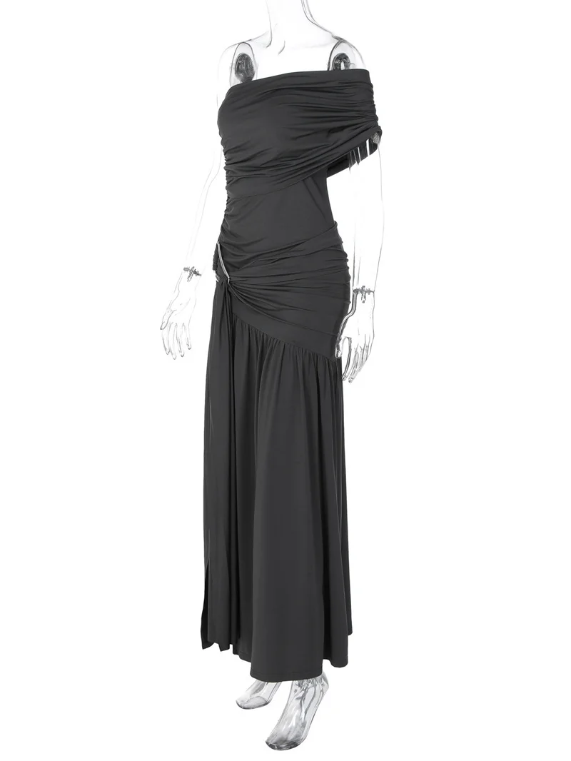 New York’s Fashion Off-shoulder Backless Sexy Maix Dress Women Elegant One Sleeve Ruched Split Club Party Pleated Long Dress Female