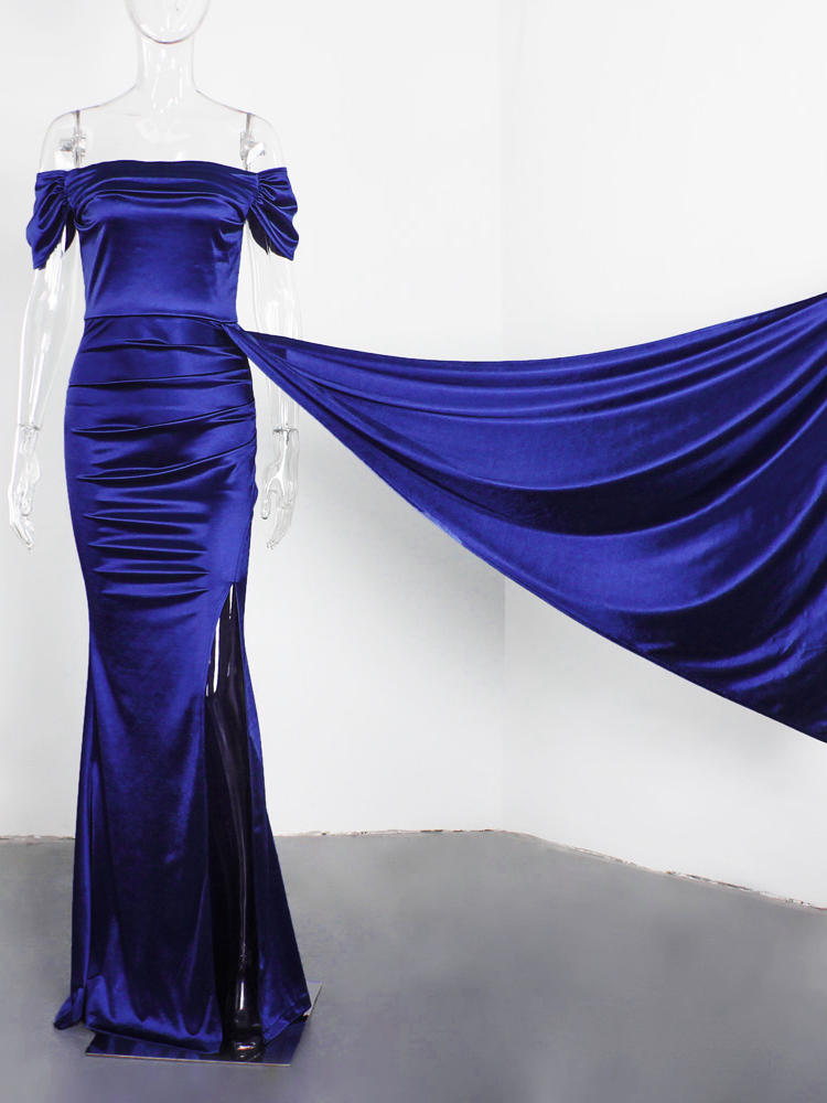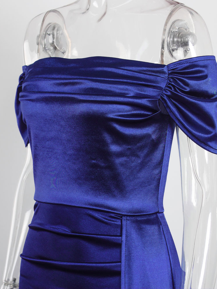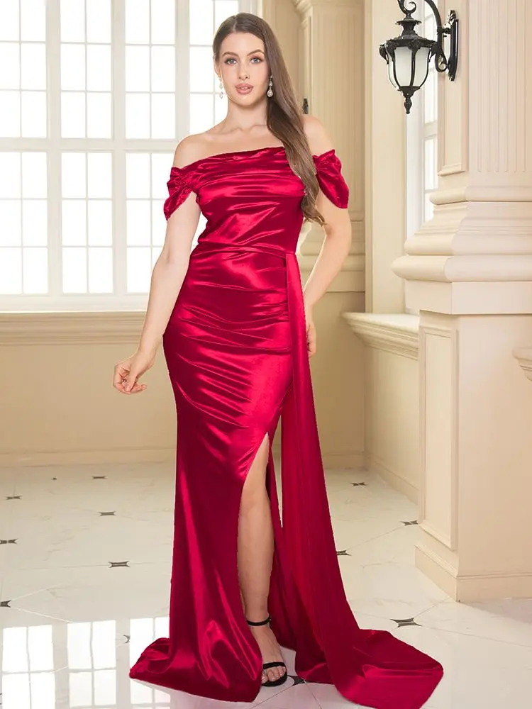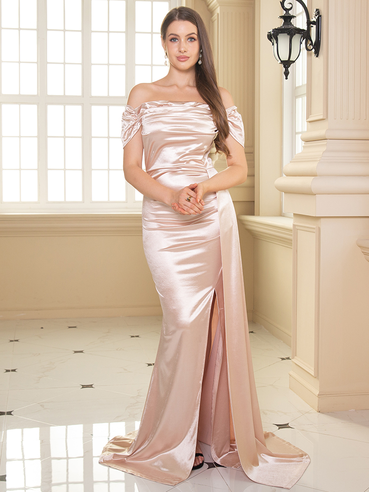 New York’s Fashion Off Shoulder Ruched Stretch Satin Bridesmaids Dress Front Split Floor Length Bodycon Evening Night Formal Gown