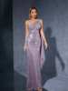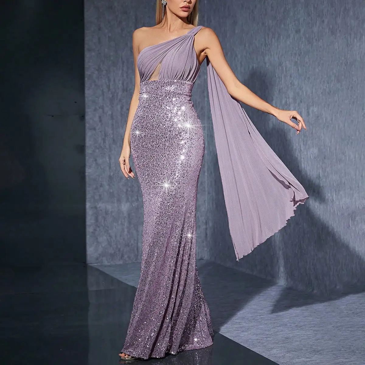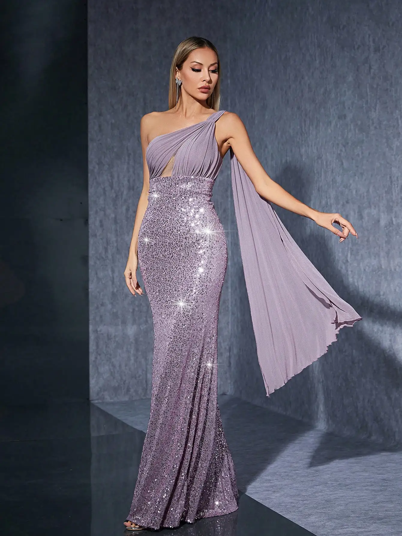 New York’s Fashion One-shoulder irregularly folded front and middle perforated transparent back pendant scarf spliced sequins slimming sexy fishtai