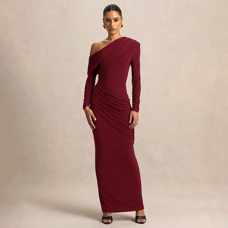 New York’s Fashion One Shoulder Long Sleeve Sexy Maxi Dress Women Gown Elegant Skew Collar Backless Ruched Bodycon Club Party Dresses