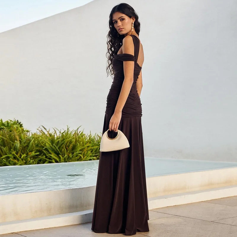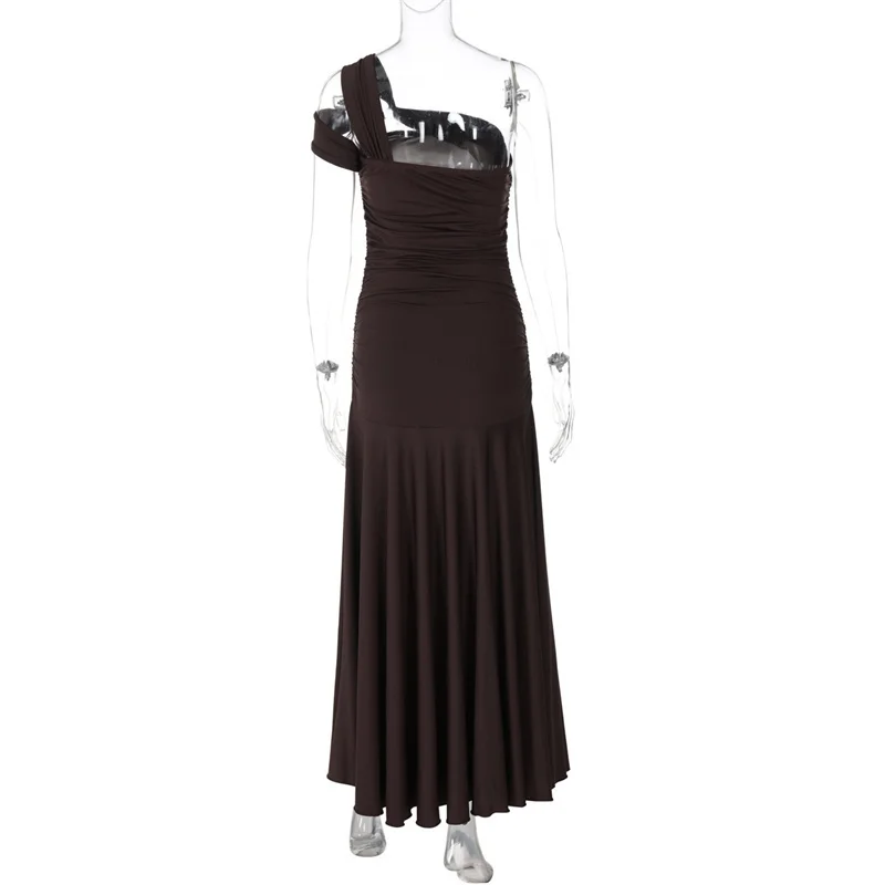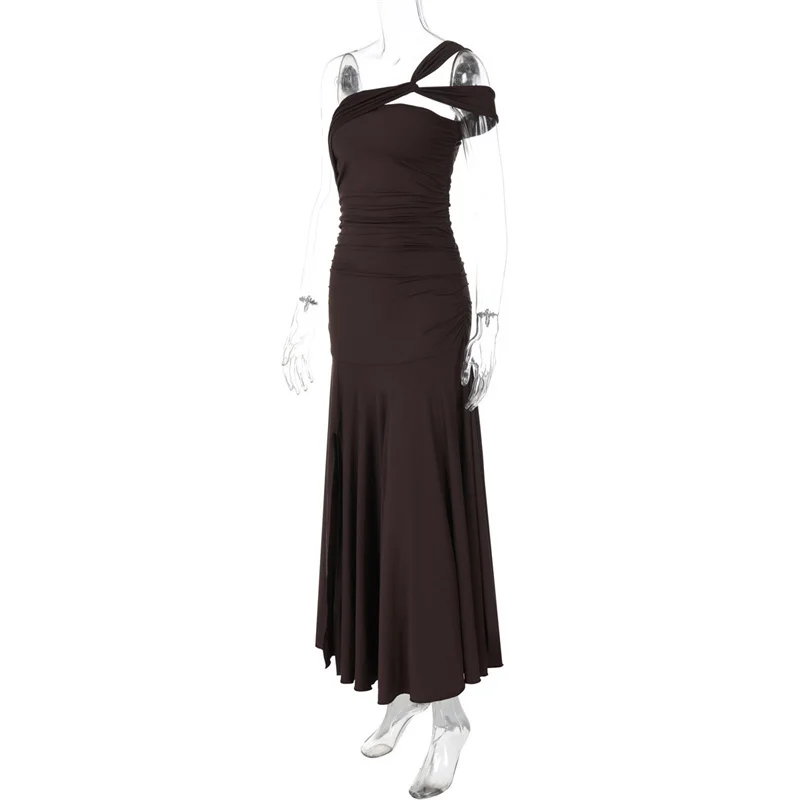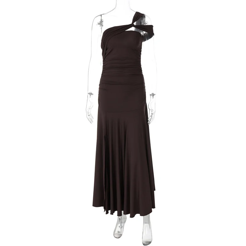 New York’s Fashion One Shoulder Split Sexy Maxi Dress Women Gown Fashion Inclined Shoulder Sleeveless Backless Club Party Pleated Dress