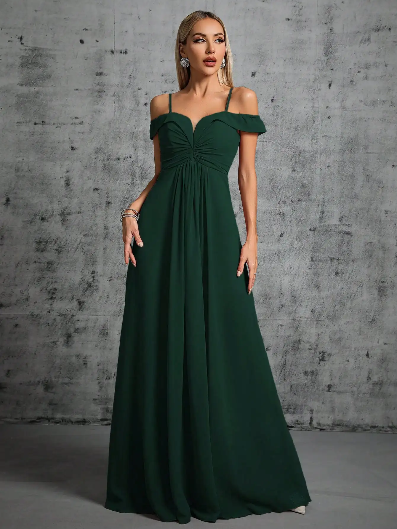 New York’s Fashion One-shoulder V-neck pleated chiffon long dress