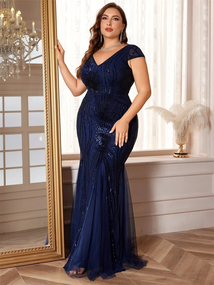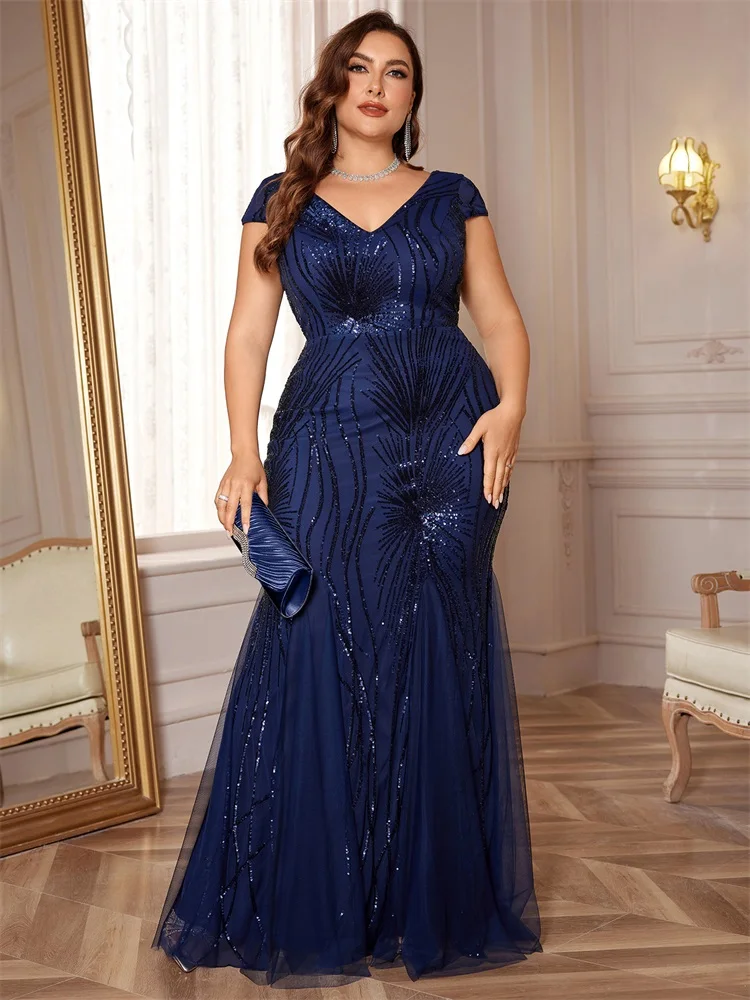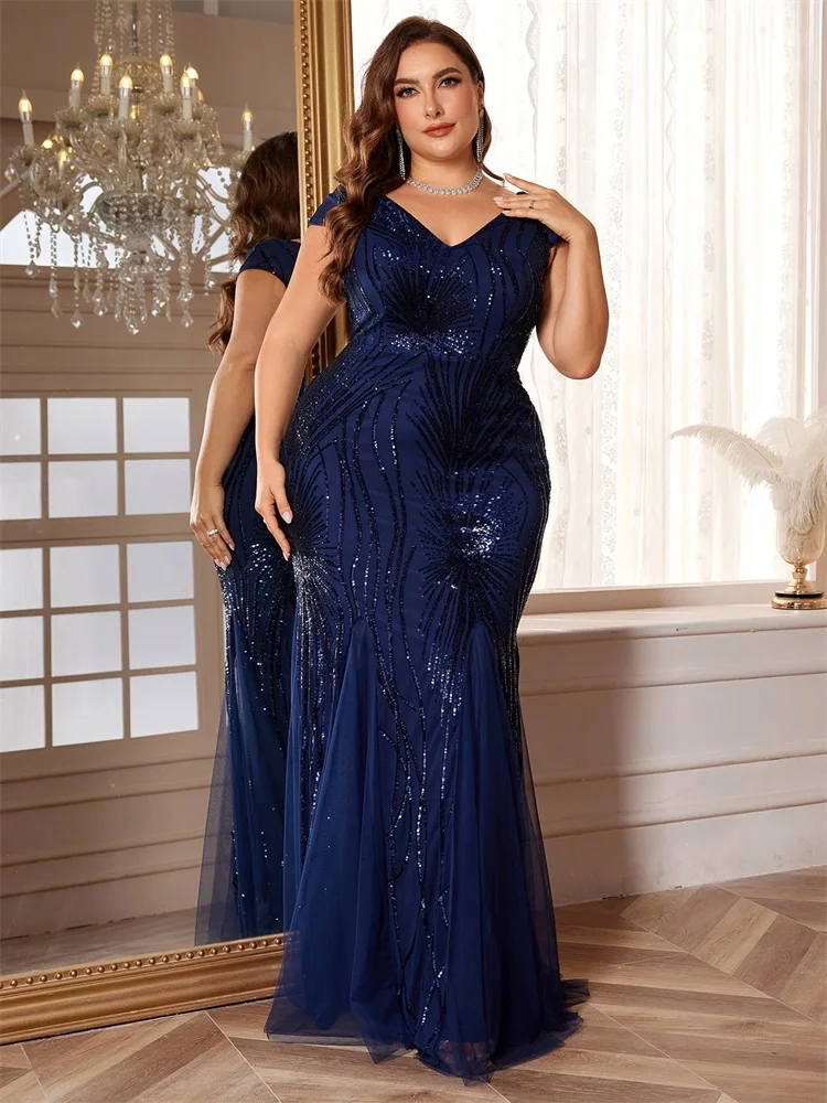 New York’s Fashion Plus Size Luxury Sleeveless Blue Sequin Formal Evening Dress For Women Elegant Mermaid Party Maxi PromCocktail Gown