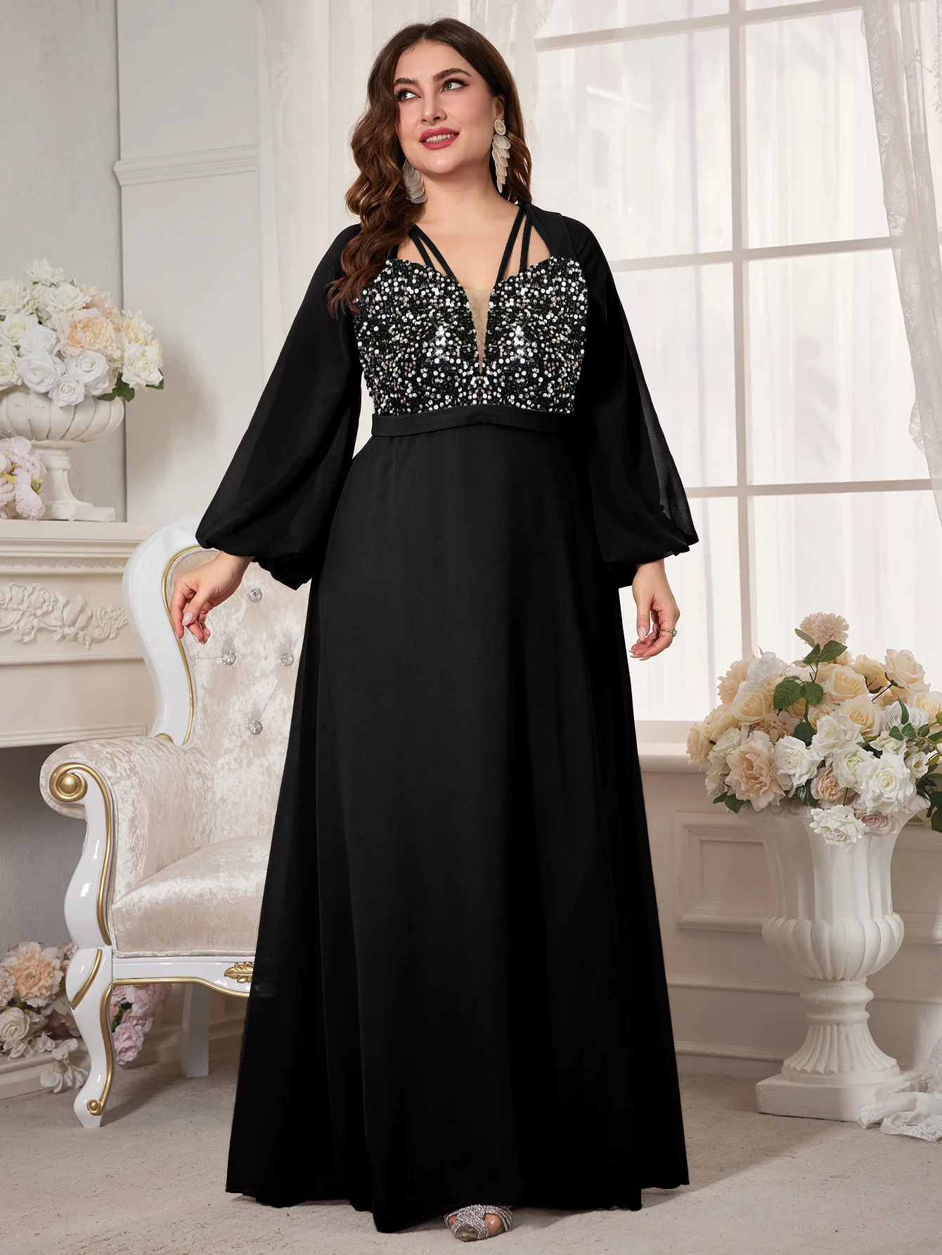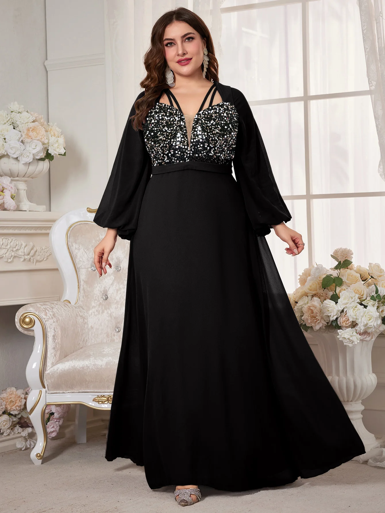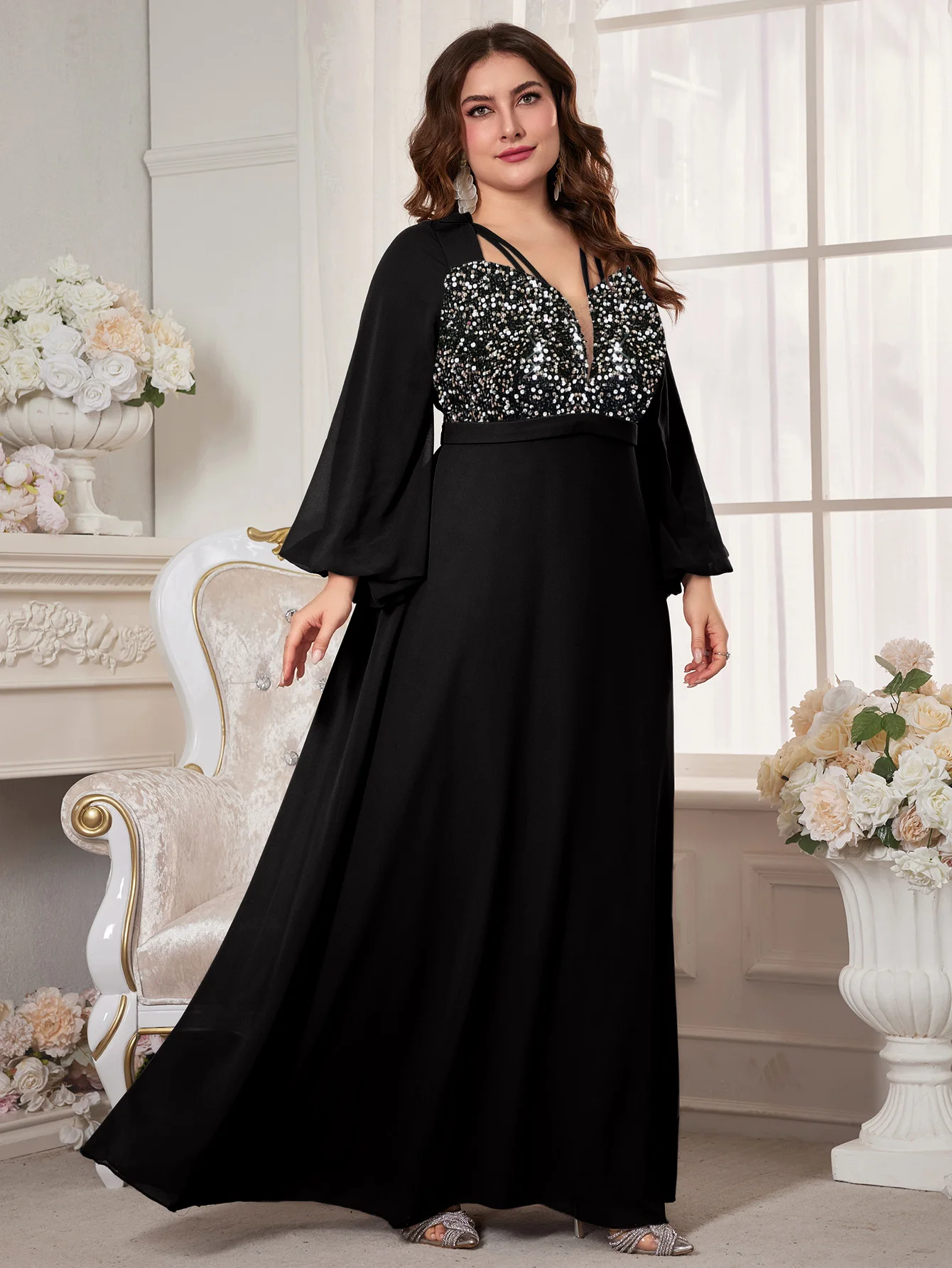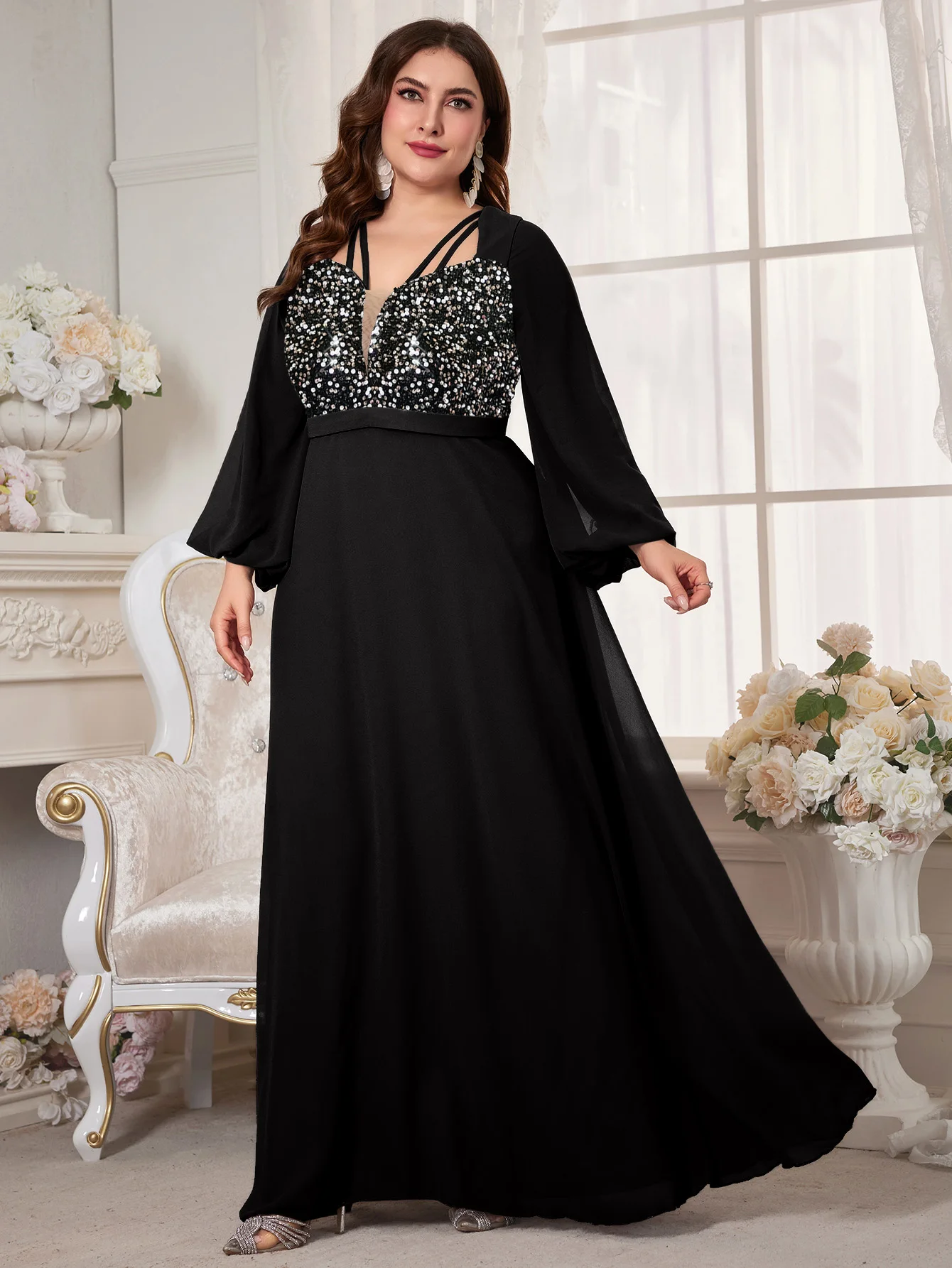 New York’s Fashion Plus Women’s V-Neck Lantern Sleeve Sequin Patchwork Chiffon Dress