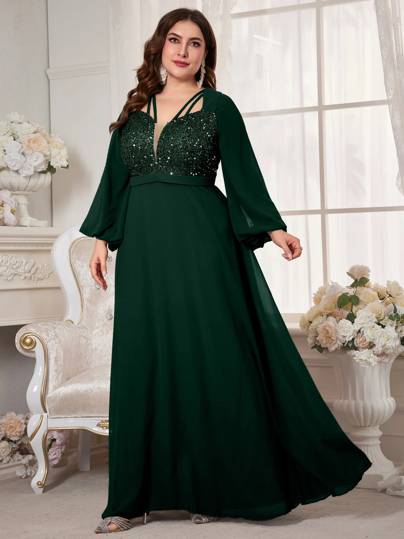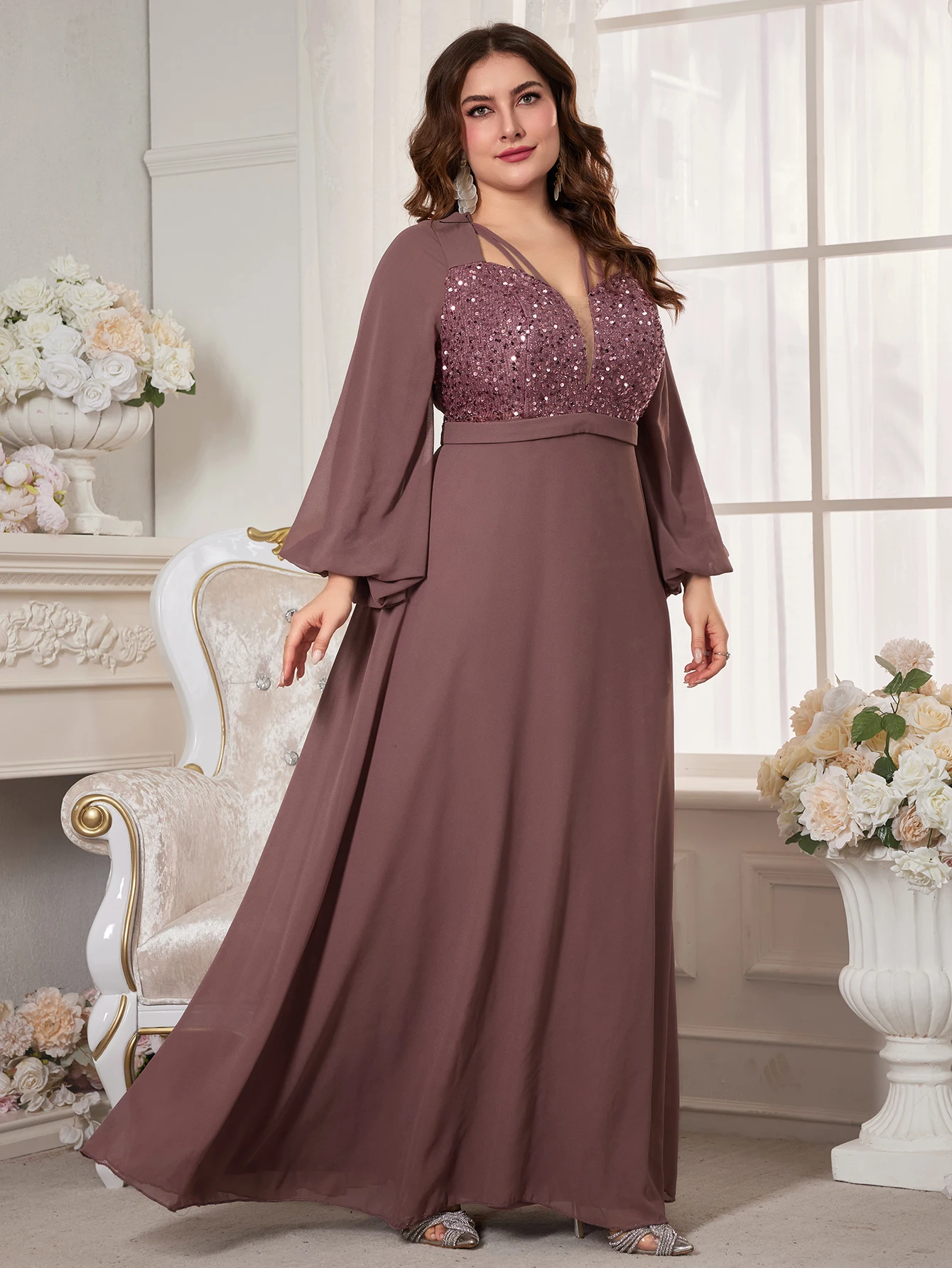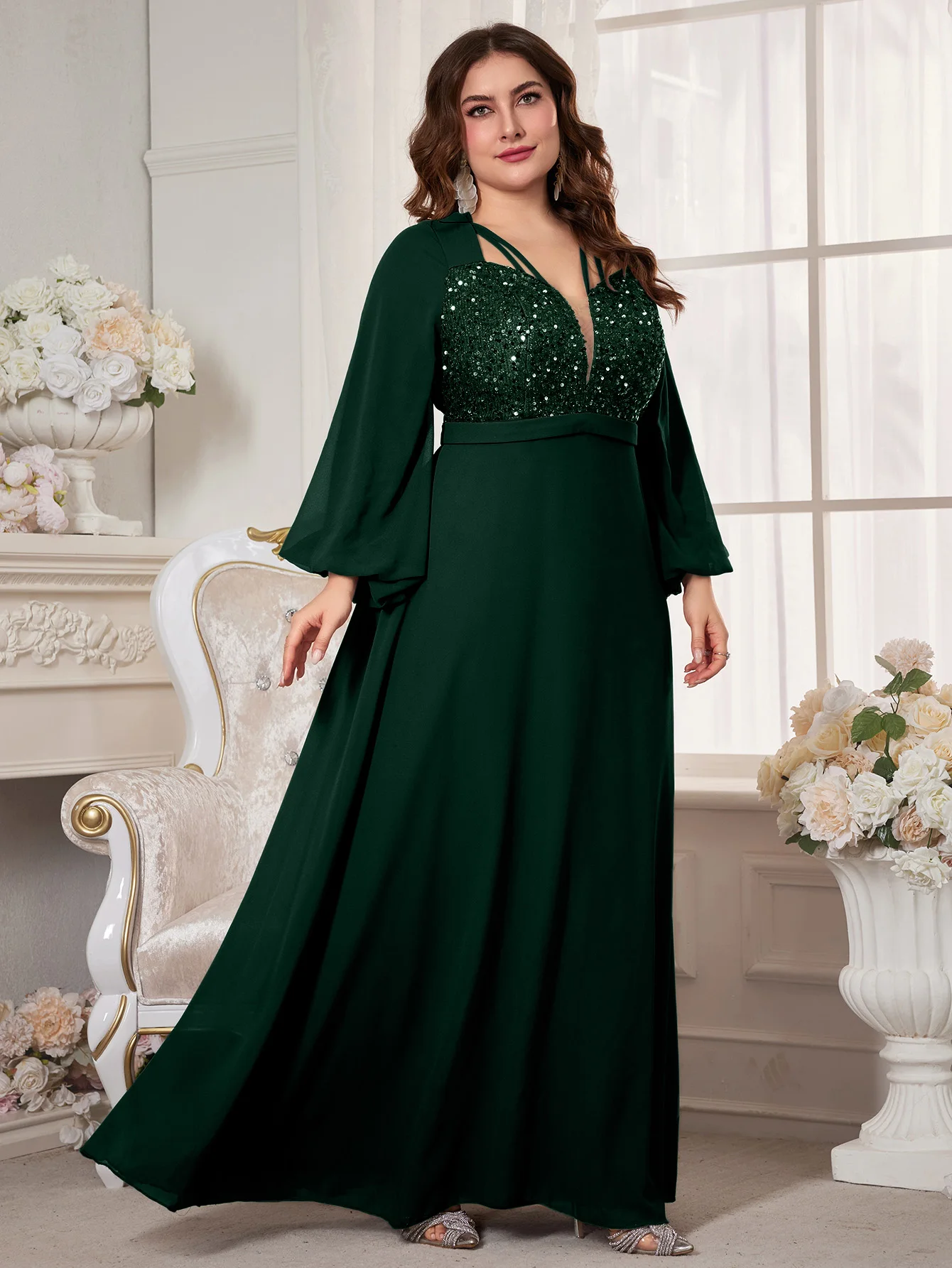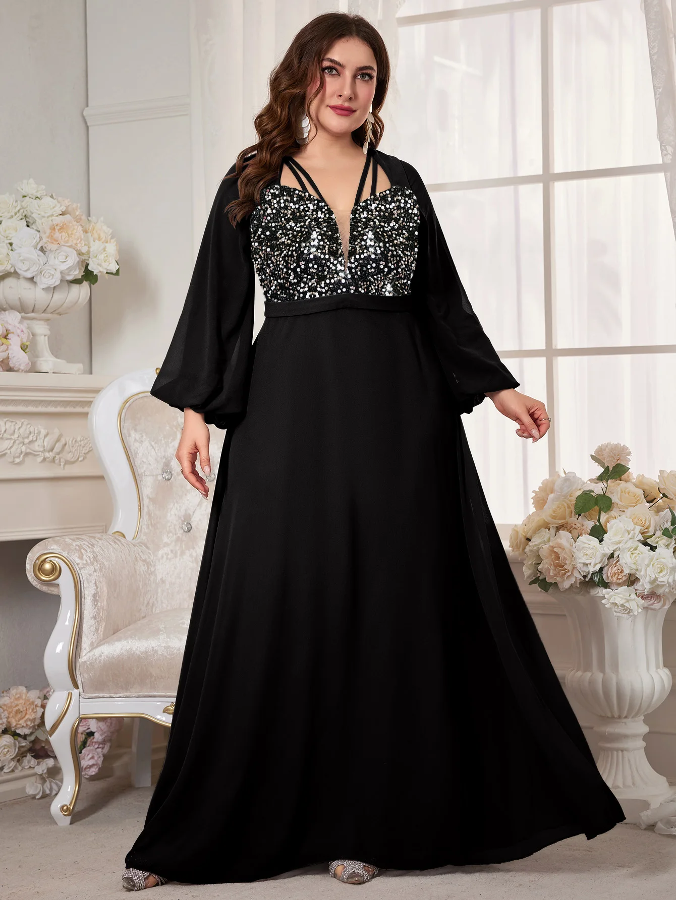 New York’s Fashion Plus Women’s V-Neck Lantern Sleeve Sequin Patchwork Chiffon Dress