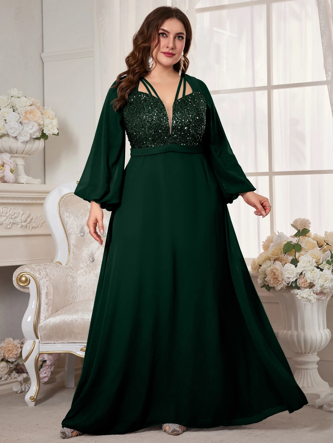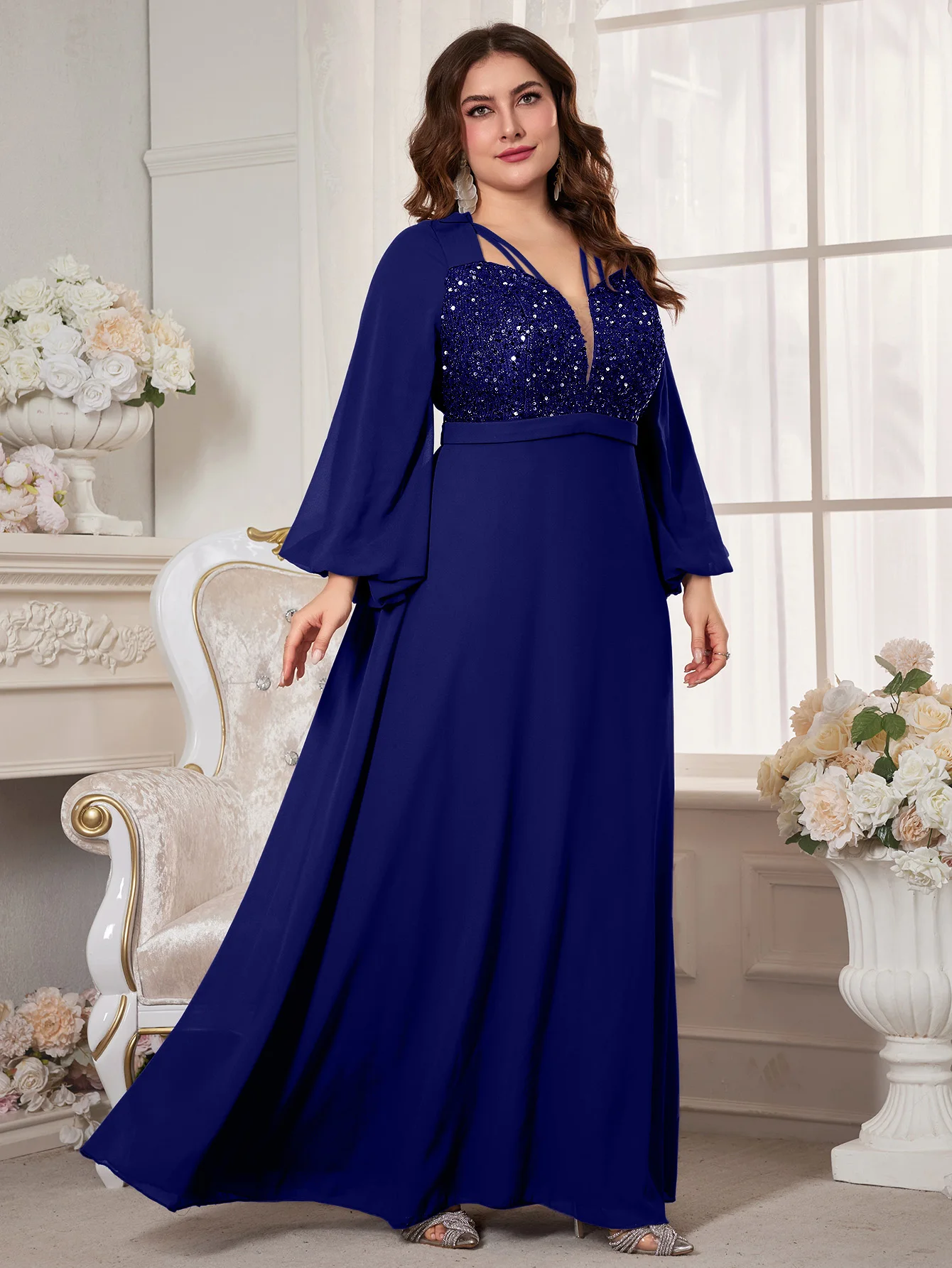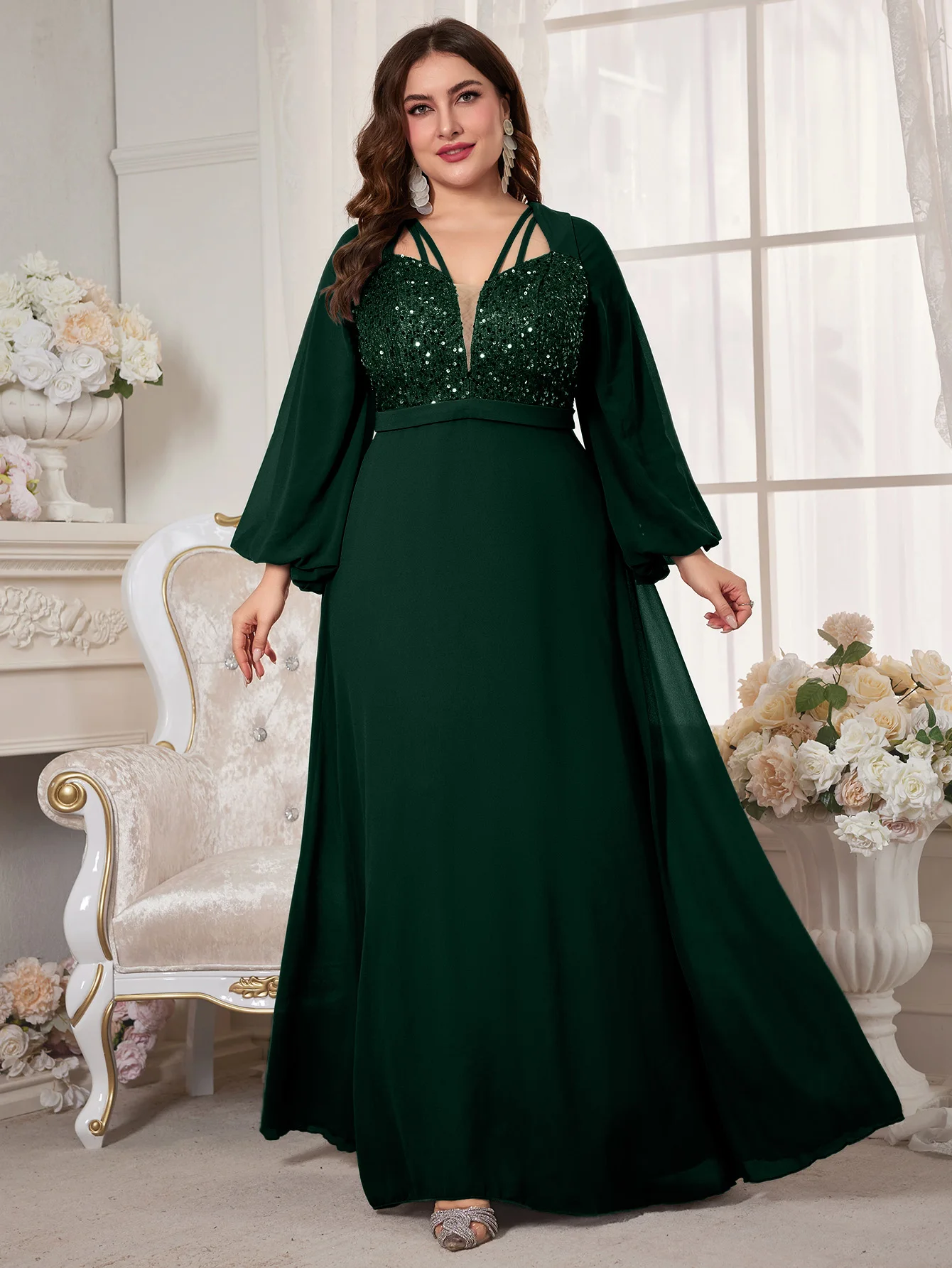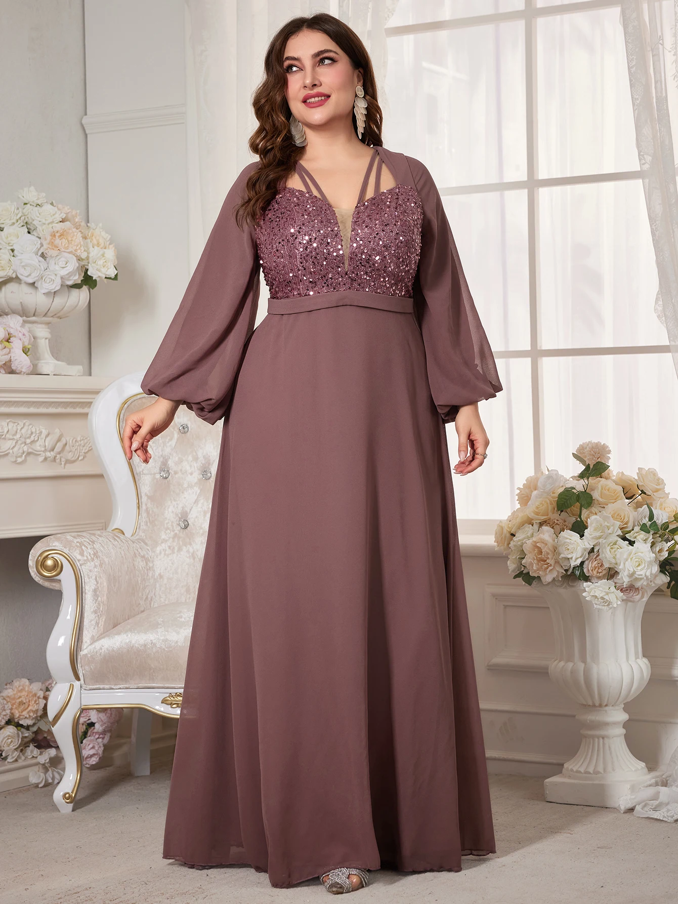 New York’s Fashion Plus Women’s V-Neck Lantern Sleeve Sequin Patchwork Chiffon Dress