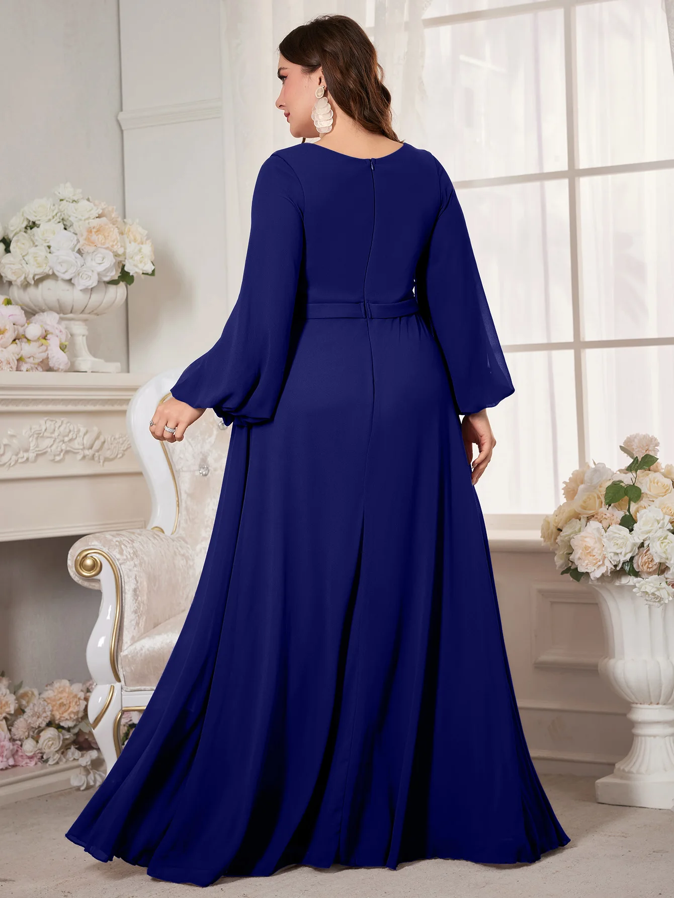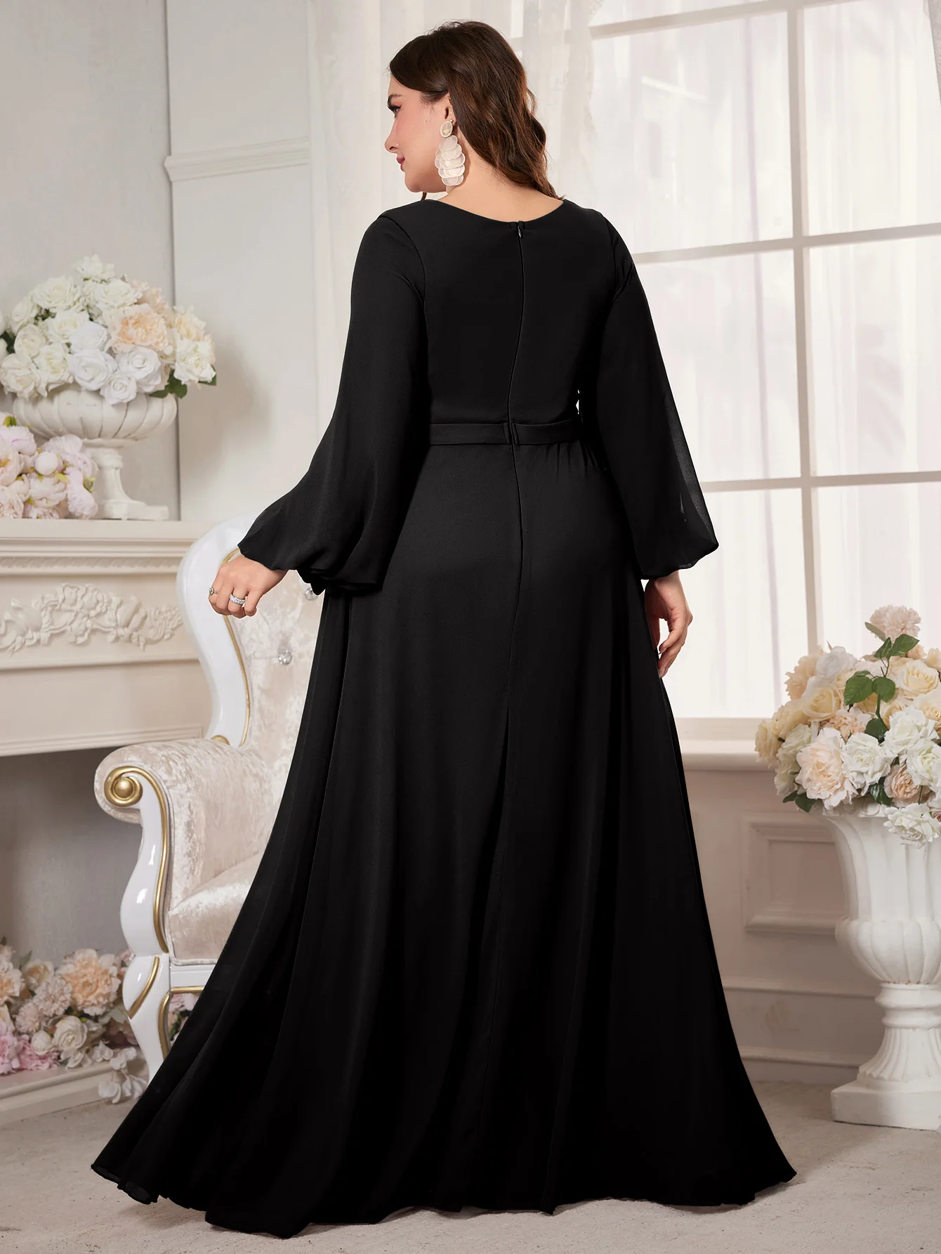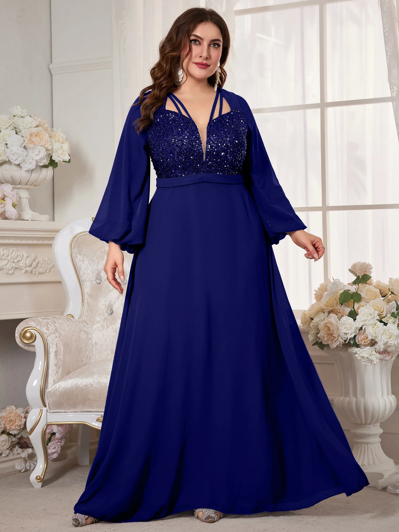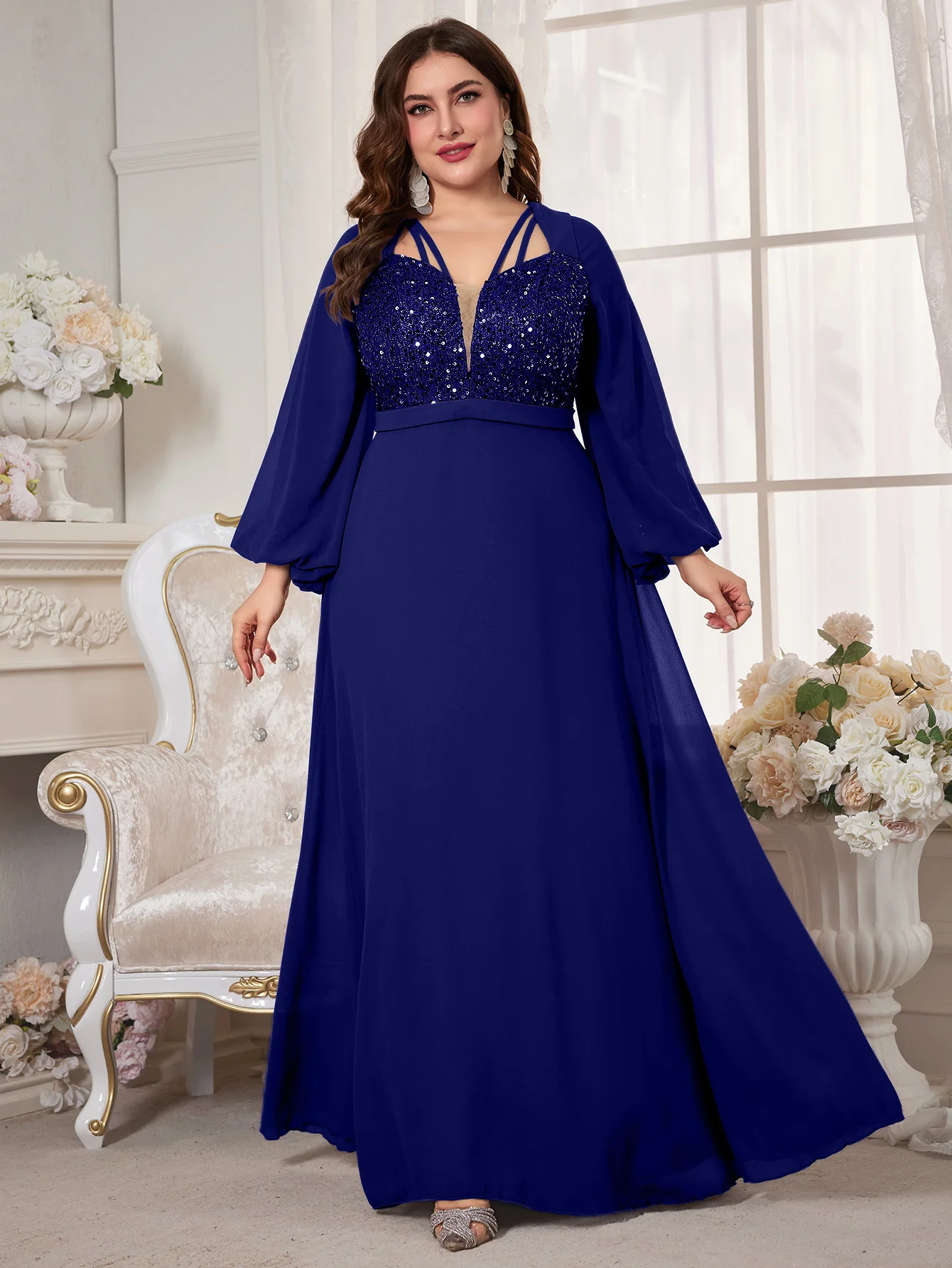 New York’s Fashion Plus Women’s V-Neck Lantern Sleeve Sequin Patchwork Chiffon Dress