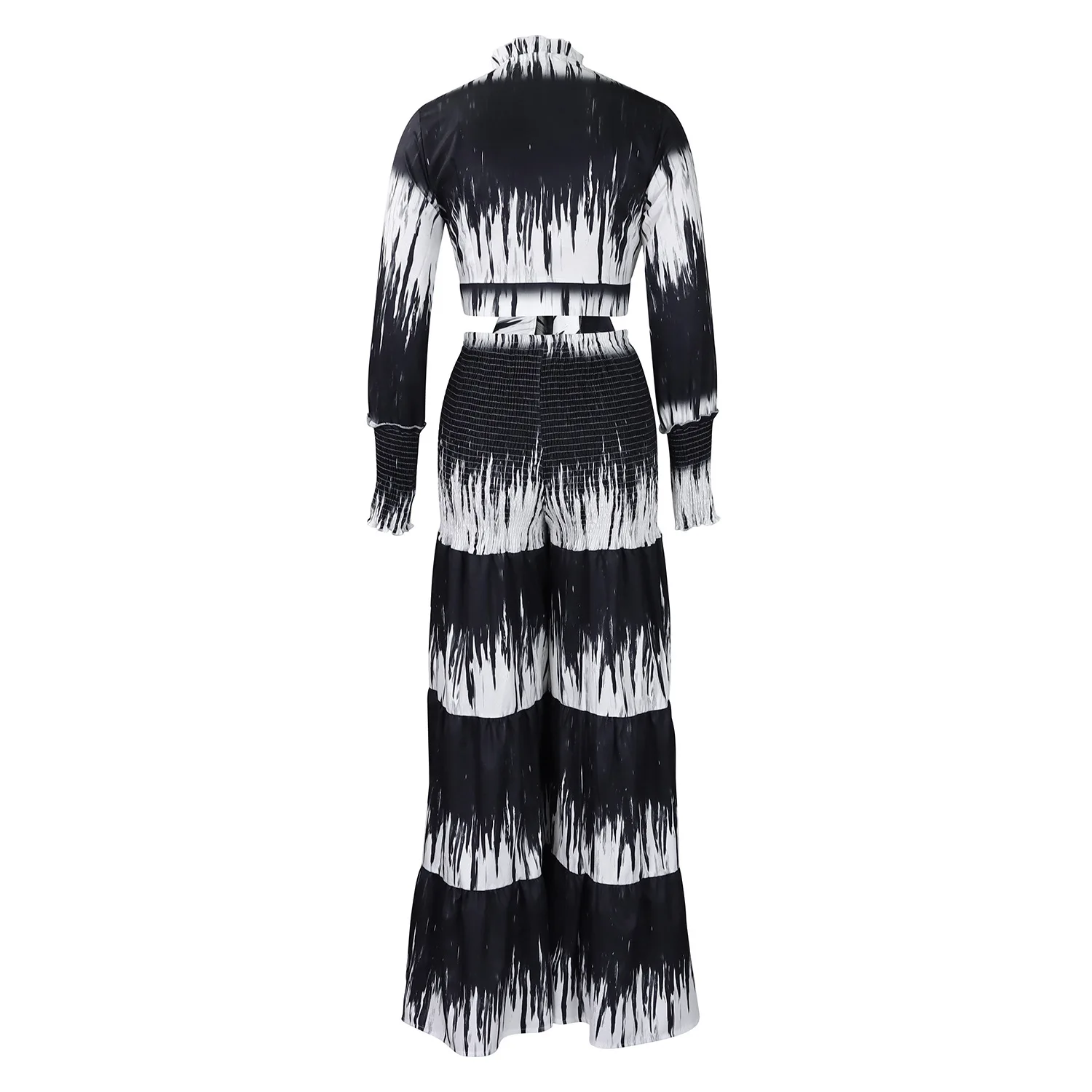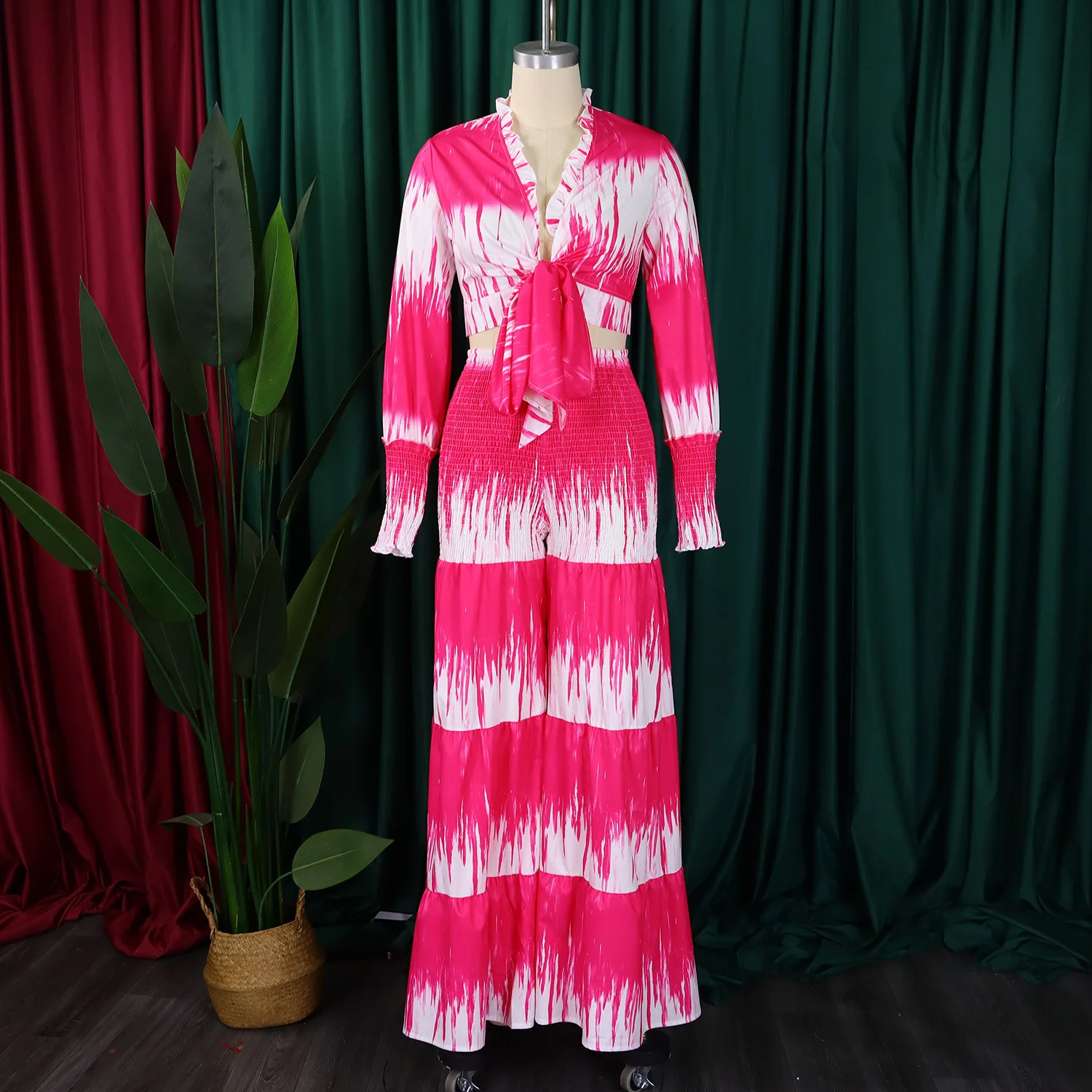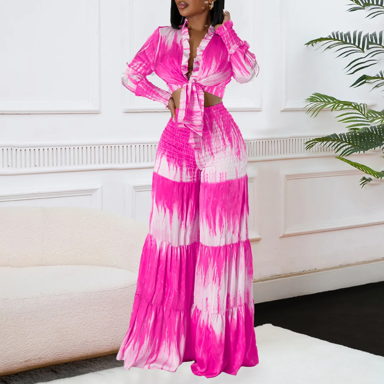 Printed Tie Front Long Sleeve Top and High Waist Wide Leg Pants Two Piece Set Casual Going Out Outfits for Women Summer Style