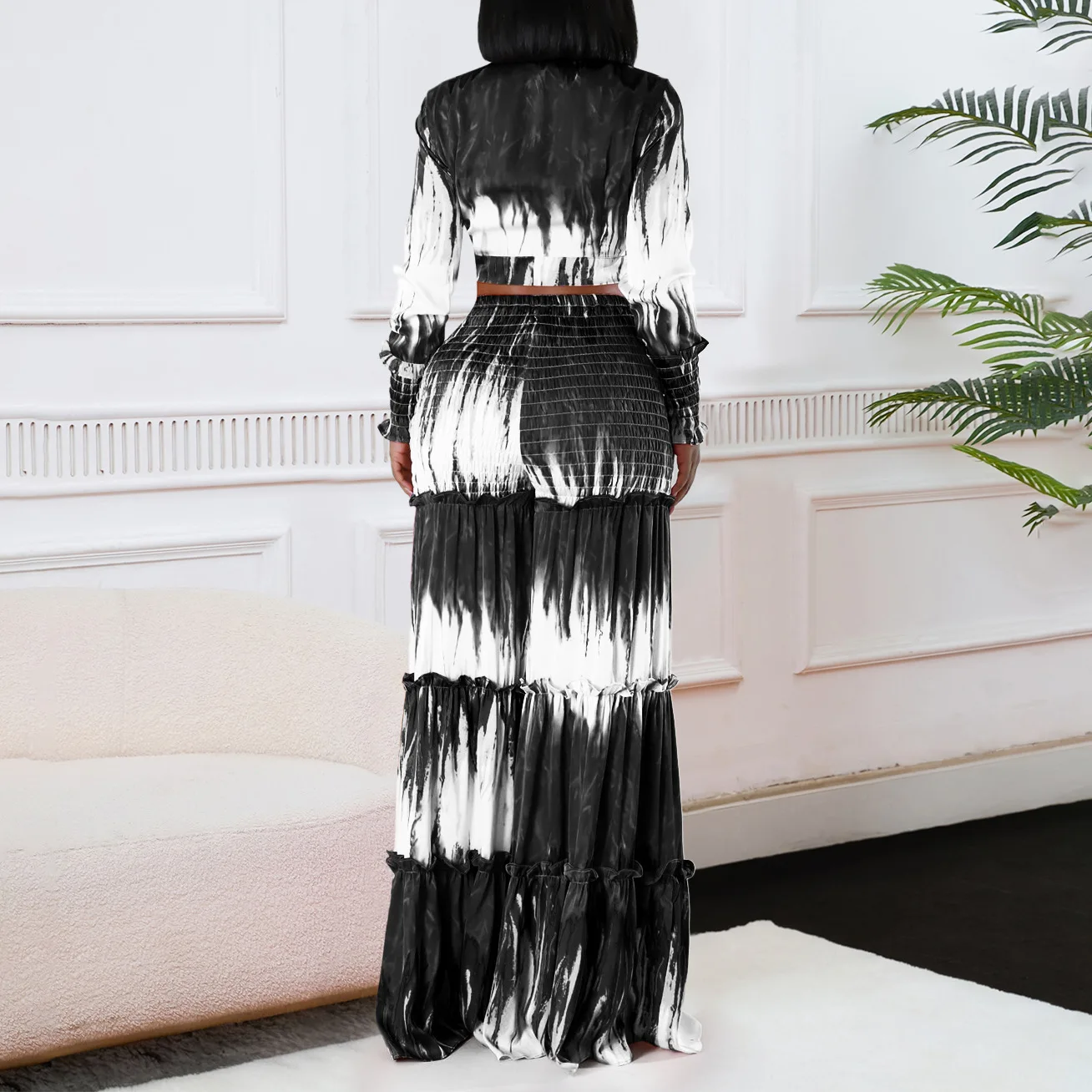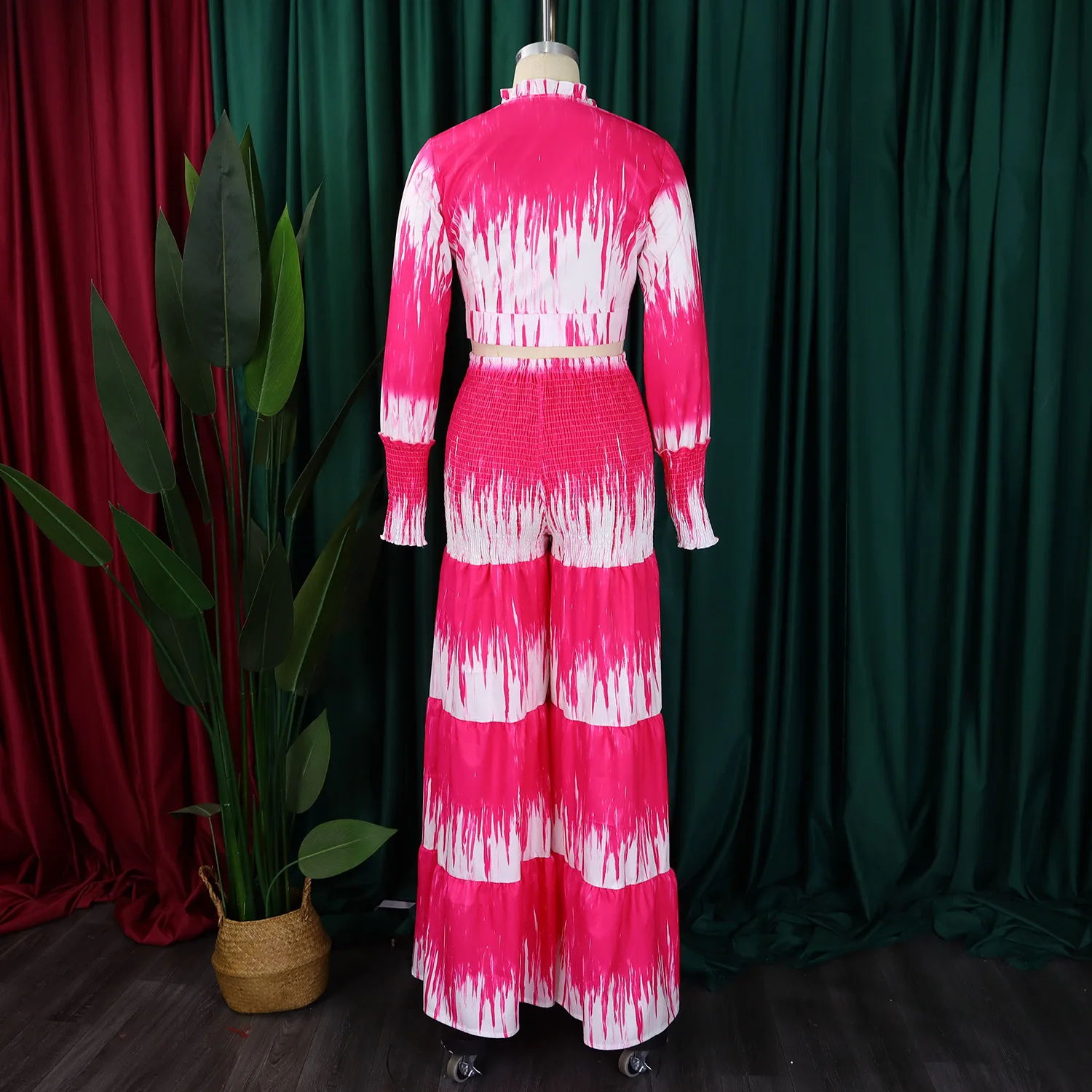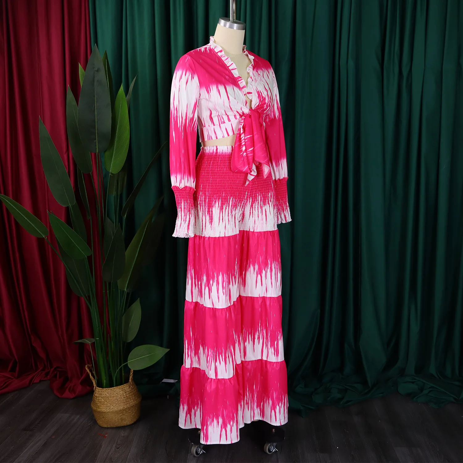 Printed Tie Front Long Sleeve Top and High Waist Wide Leg Pants Two Piece Set Casual Going Out Outfits for Women Summer Style