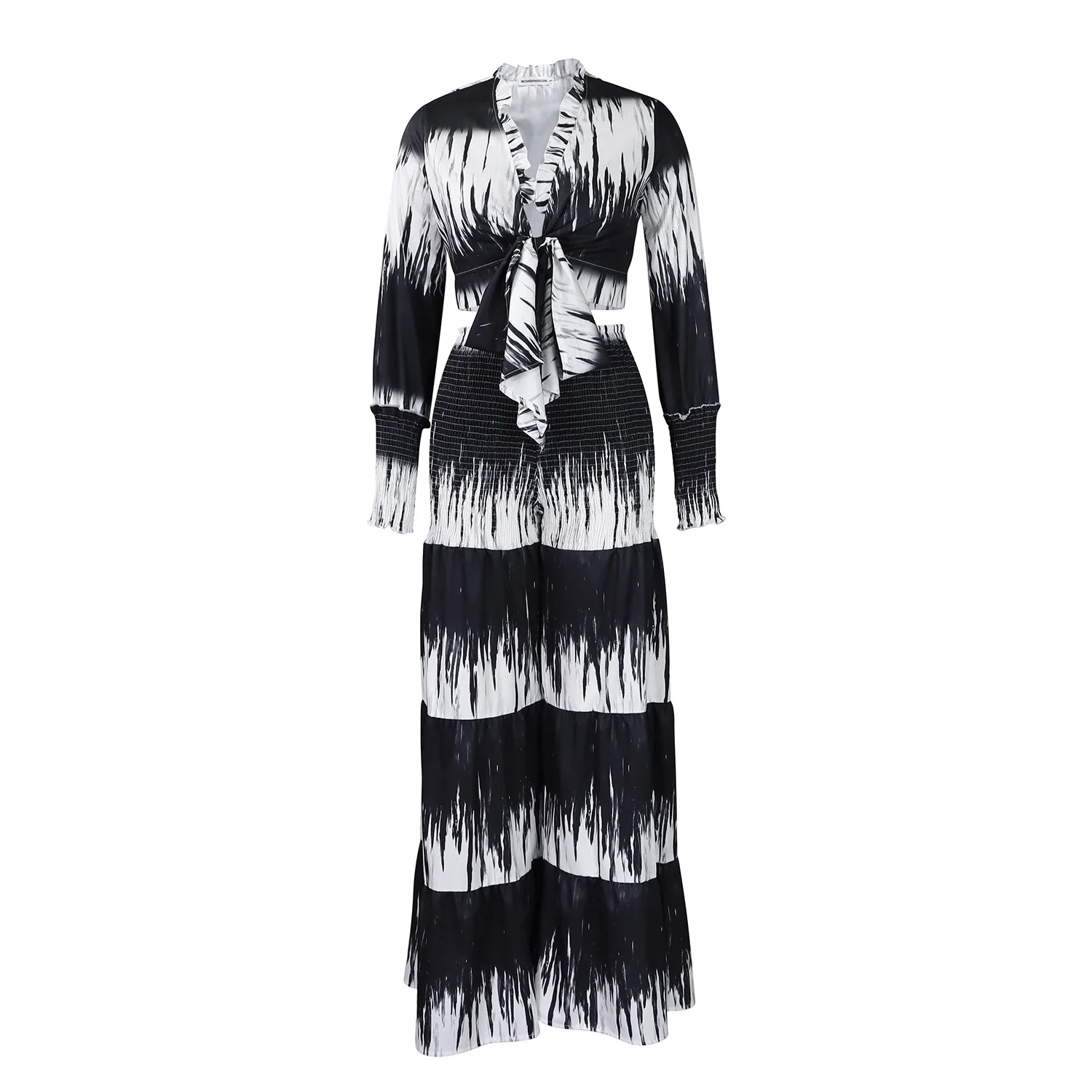 New York’s Fashion Printed Tie Front Long Sleeve Top and High Waist Wide Leg Pants Two Piece Set Casual Going Out Outfits for Women Summer Style
