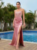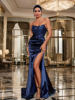 New York’s Fashion Sequined Lace Hollow Out Satin Dress Bridesmaid Evening Party Maxi Gown Strapless Backless Lace Up Front Slit Pink Navy
