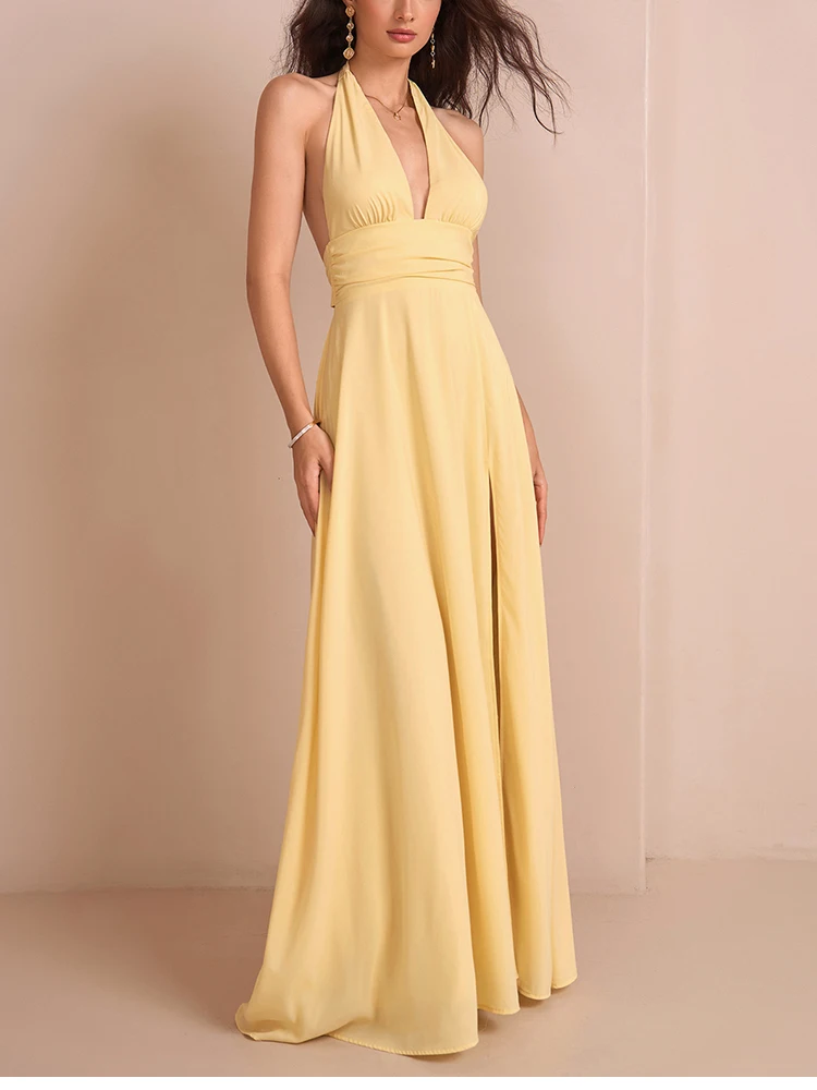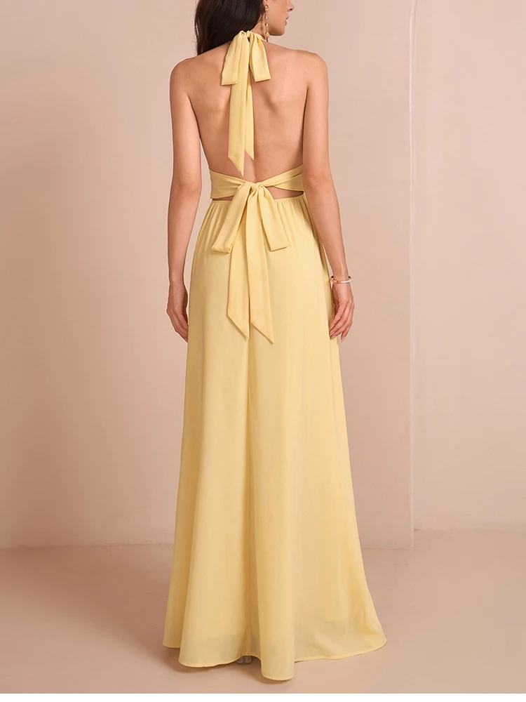 New York’s Fashion Sexy Deep V Neck Halter Chiffon Maxi Dress with Bow Tie Backless High Slit Women Elegant Evening Gown for Party Wedding