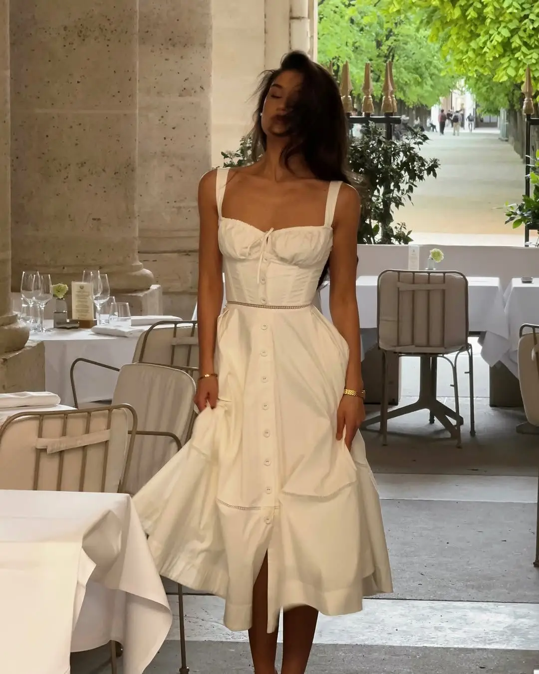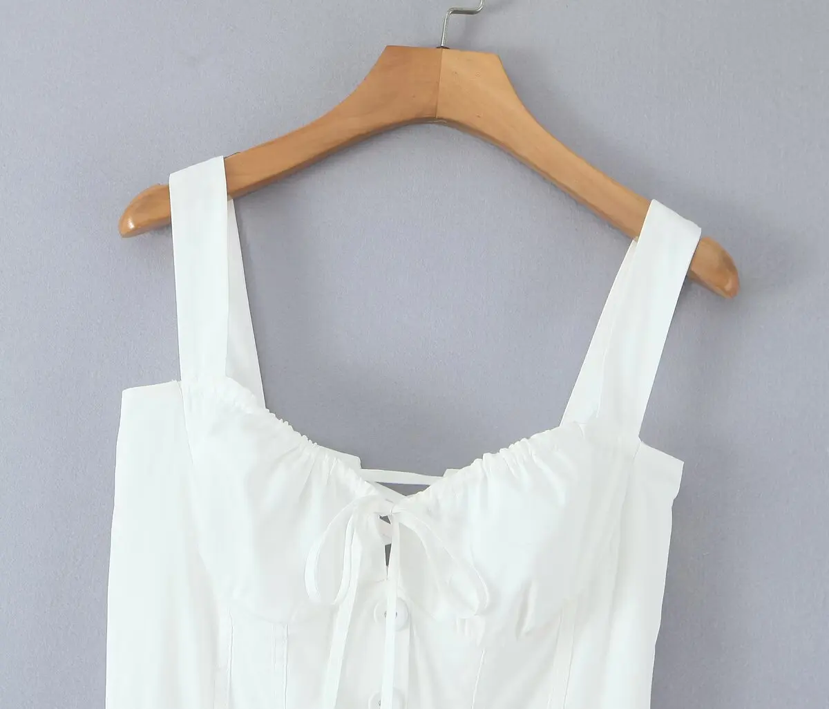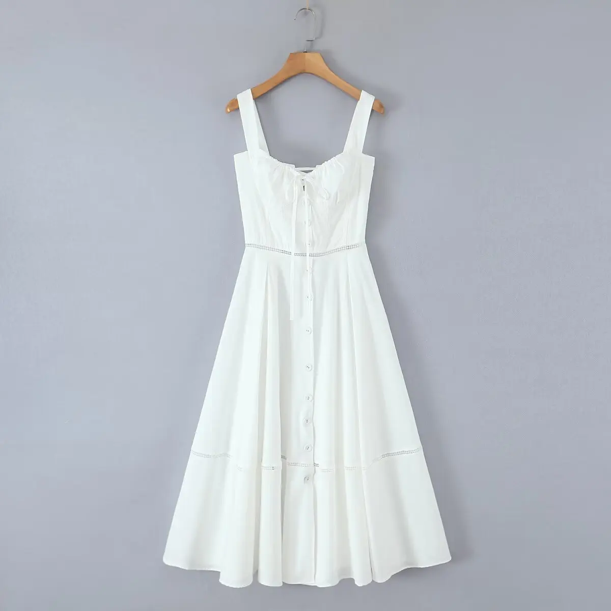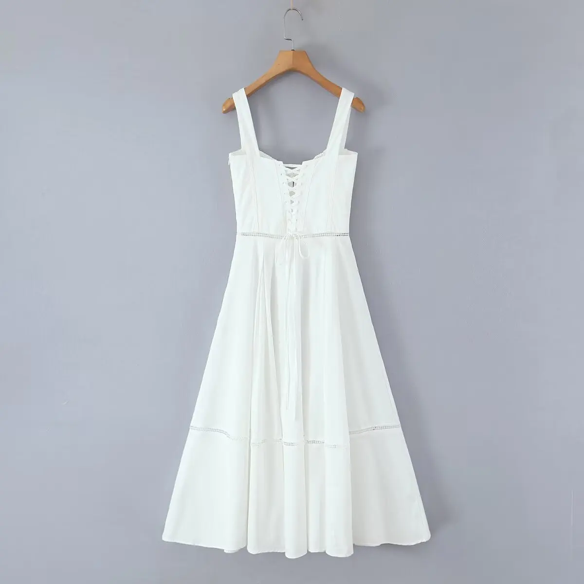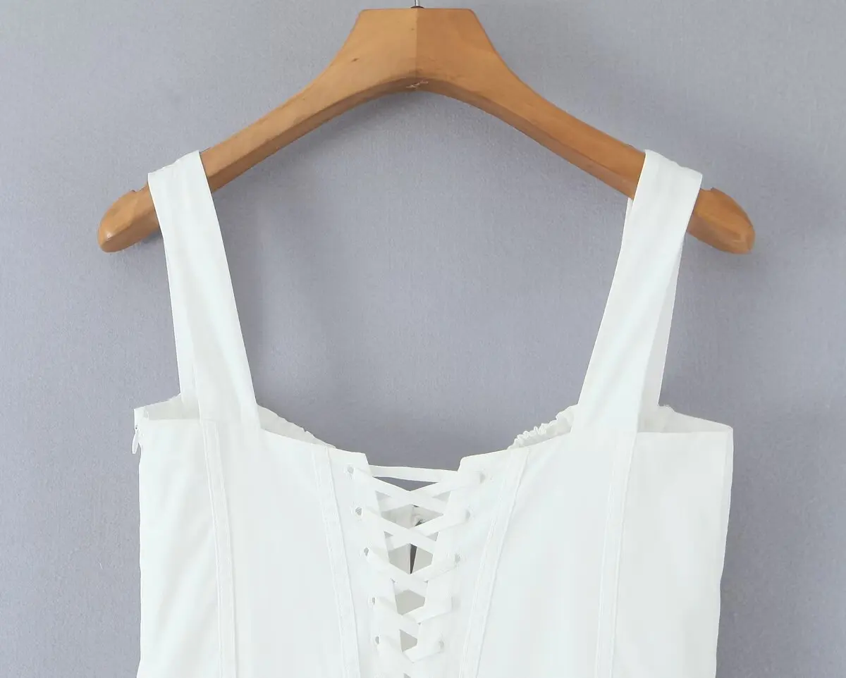 New York’s Fashion Sexy Lace Up Bandage Back Elegant White Sling Dress Women Front Button A-line Cotton Corset Style Summer Dress Midi Robe