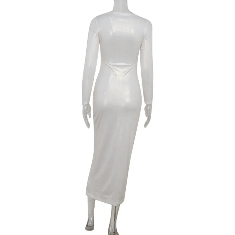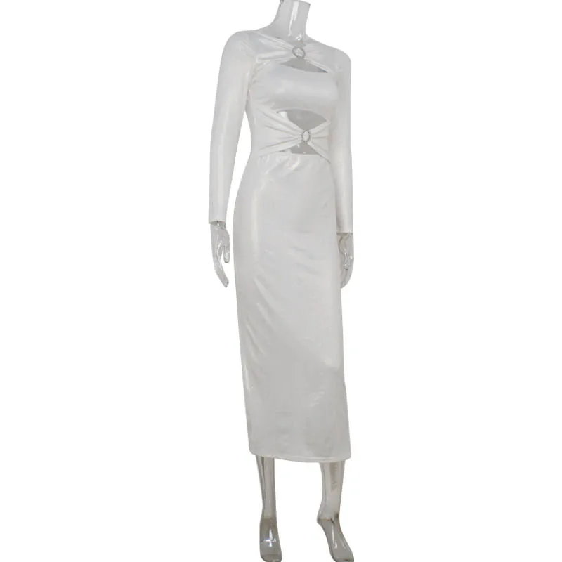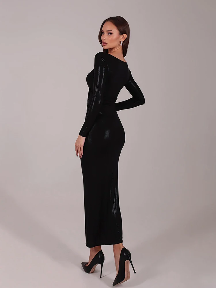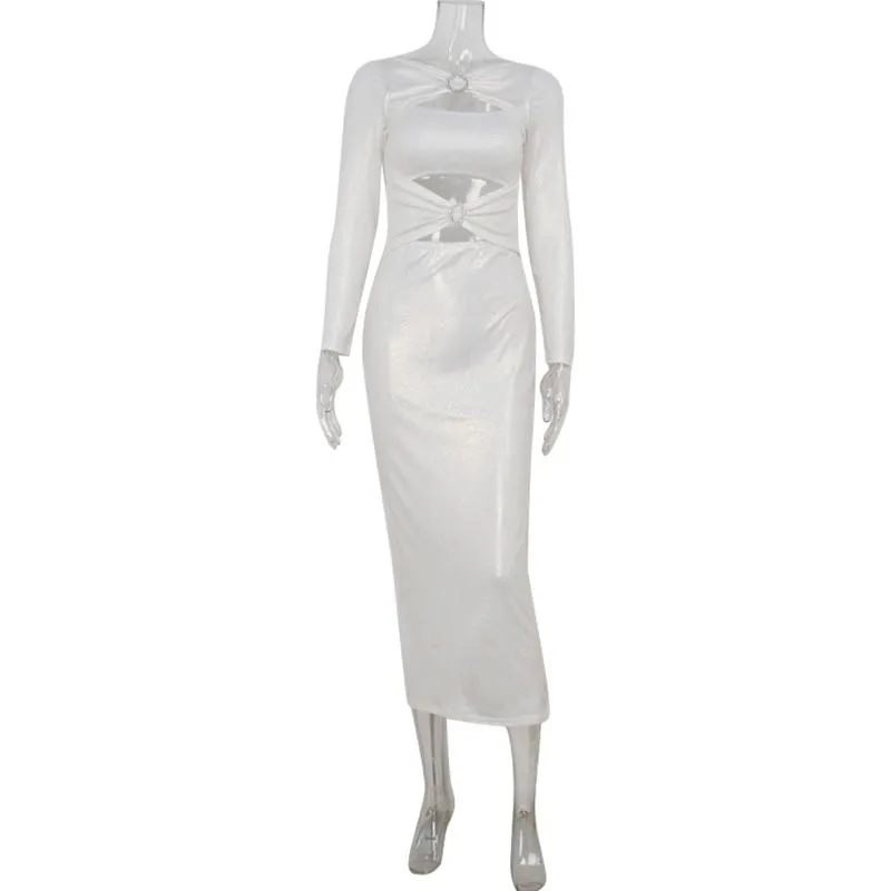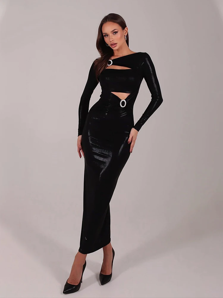 New York’s Fashion Sexy Pu Leather Women’s Maxi Dresses Solid Hollow Out Sheath Long Sleeves O-Neck Buttons Bodycon Party Vestidos Robes