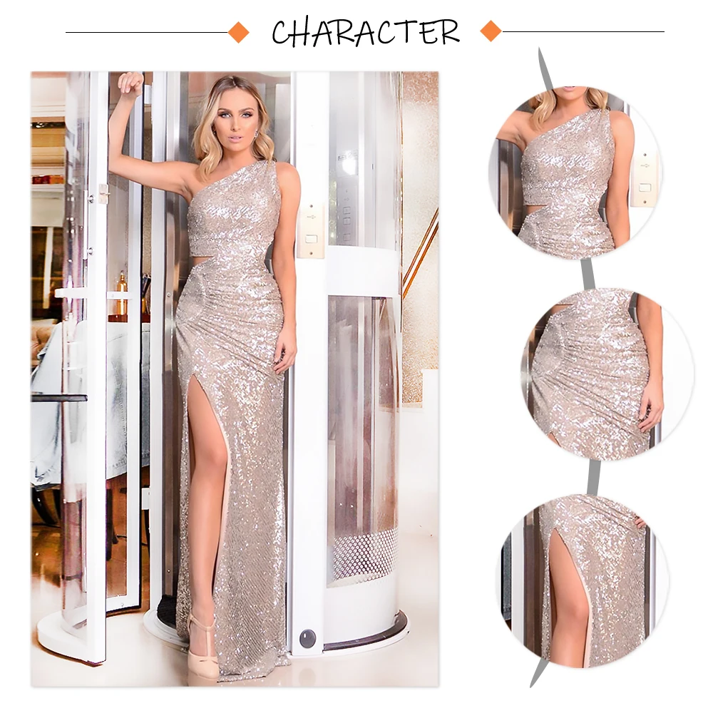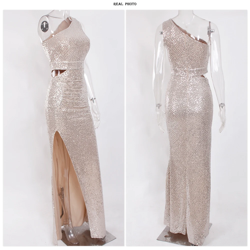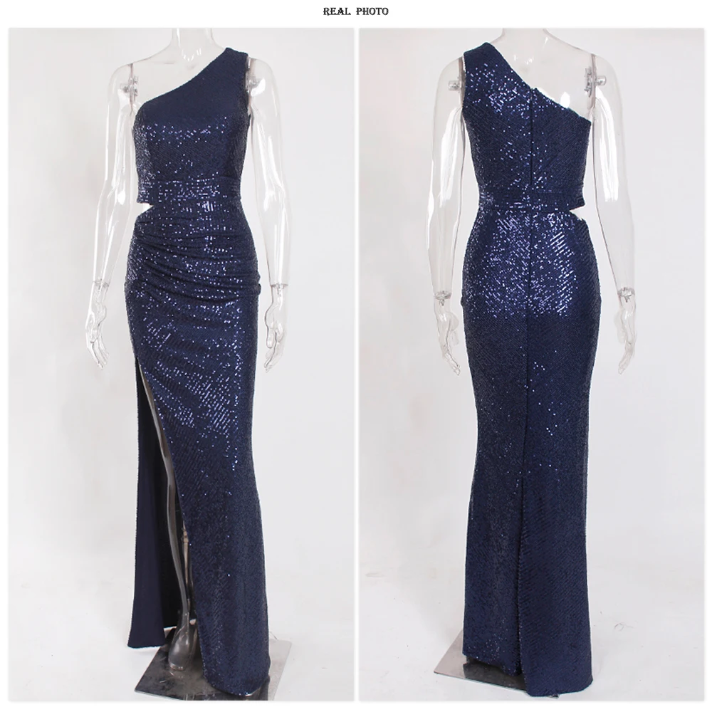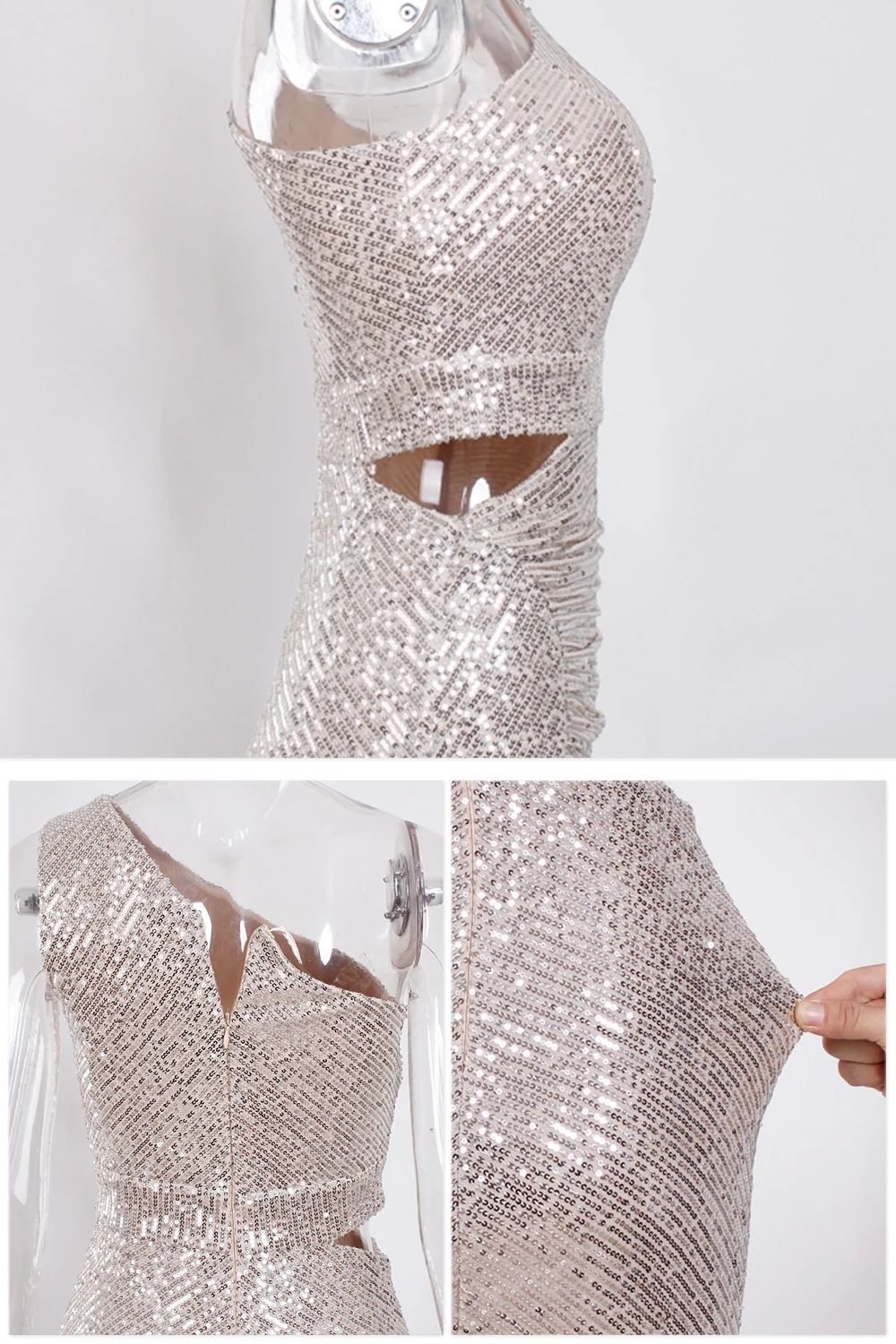 New York’s Fashion Silver One Shoulder Hollow Out Sequin Cocktail Dress Luxury Pleated Slit Padded Sleeveless Women Party Evening Dresses