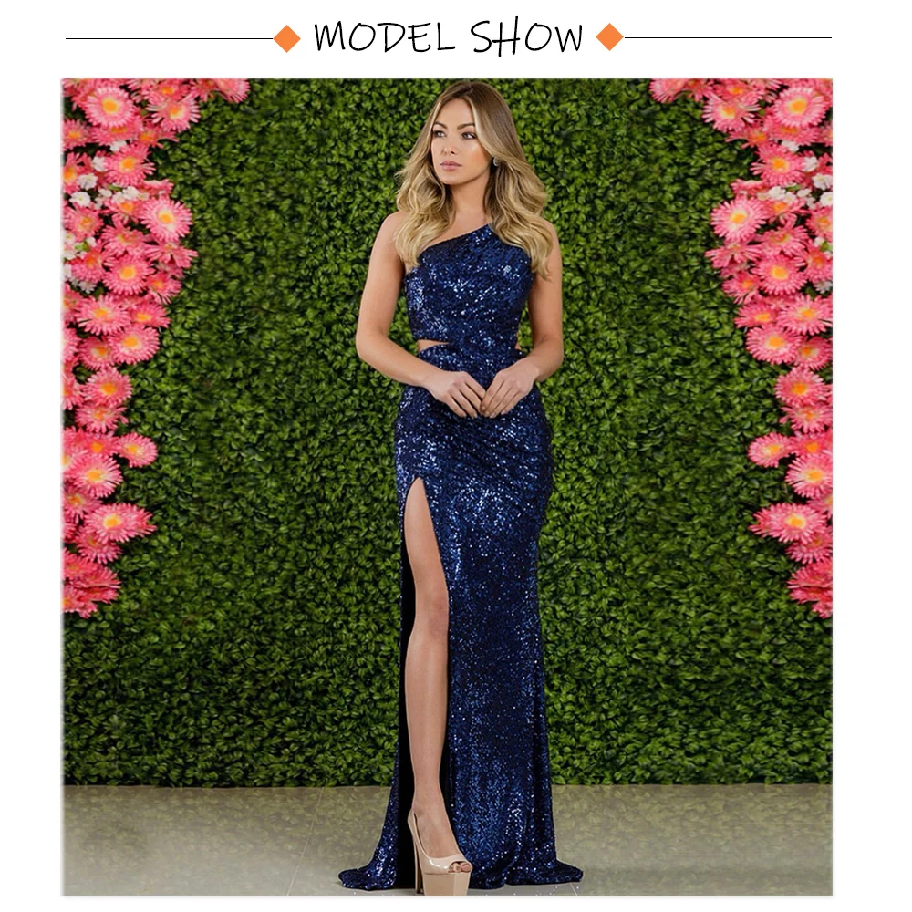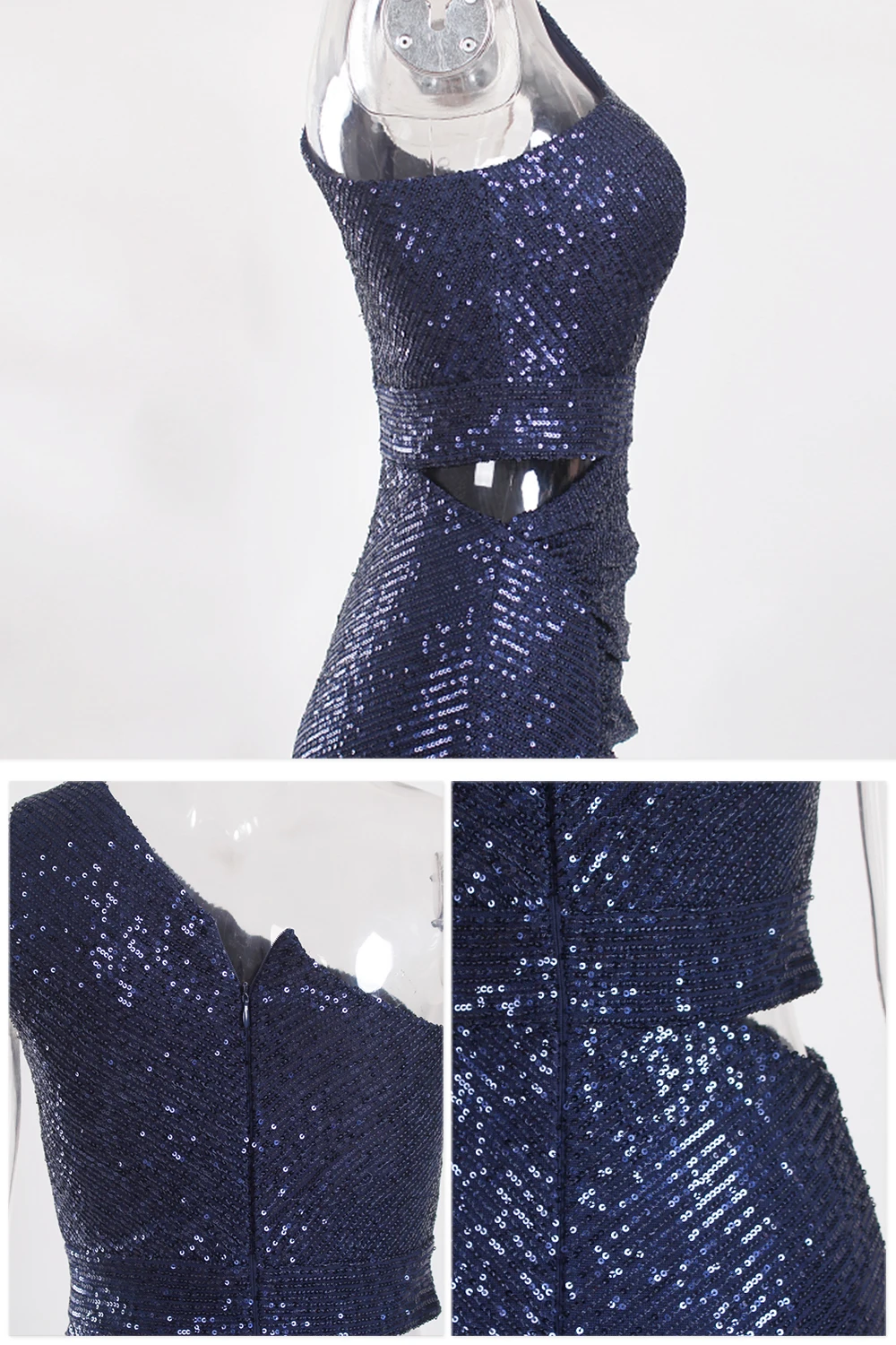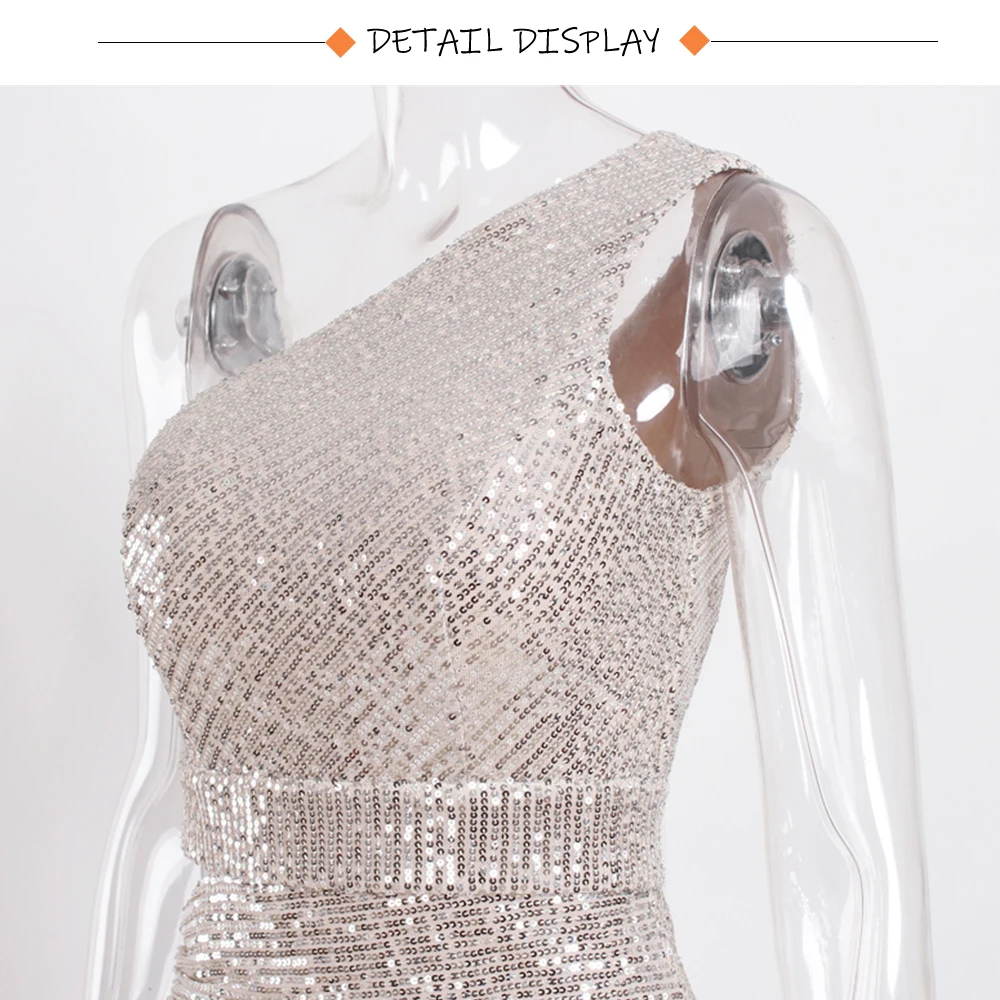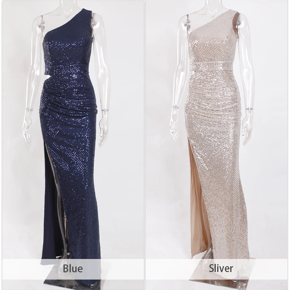 New York’s Fashion Silver One Shoulder Hollow Out Sequin Cocktail Dress Luxury Pleated Slit Padded Sleeveless Women Party Evening Dresses