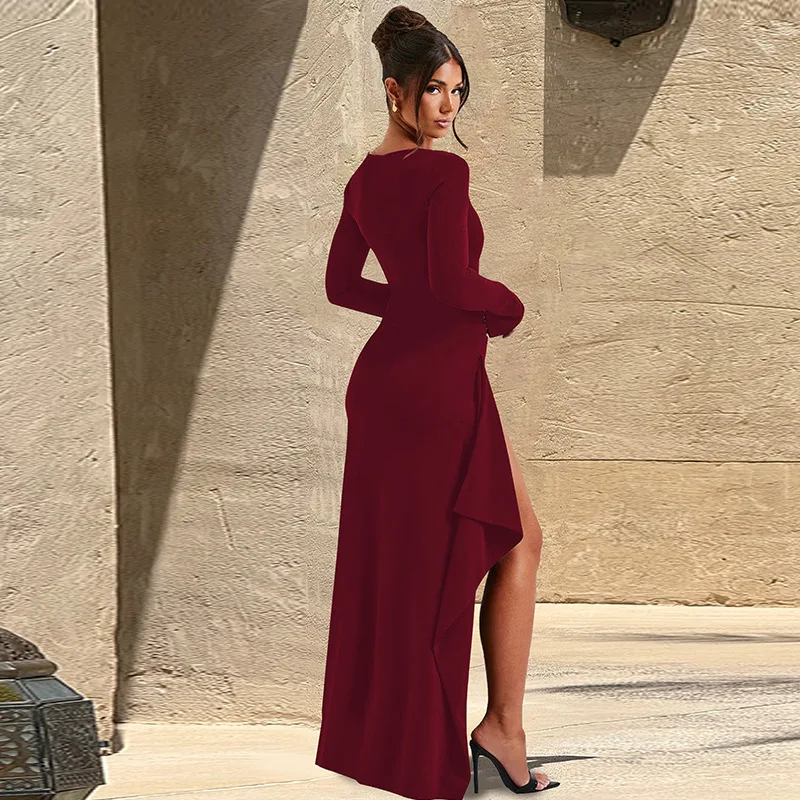 New York’s Fashion Square Neck Long Sleeve Ruffle High Split Party Sexy Dresses Elegant Pleated Maxi Long Dress Women 2025 Autumn Dress