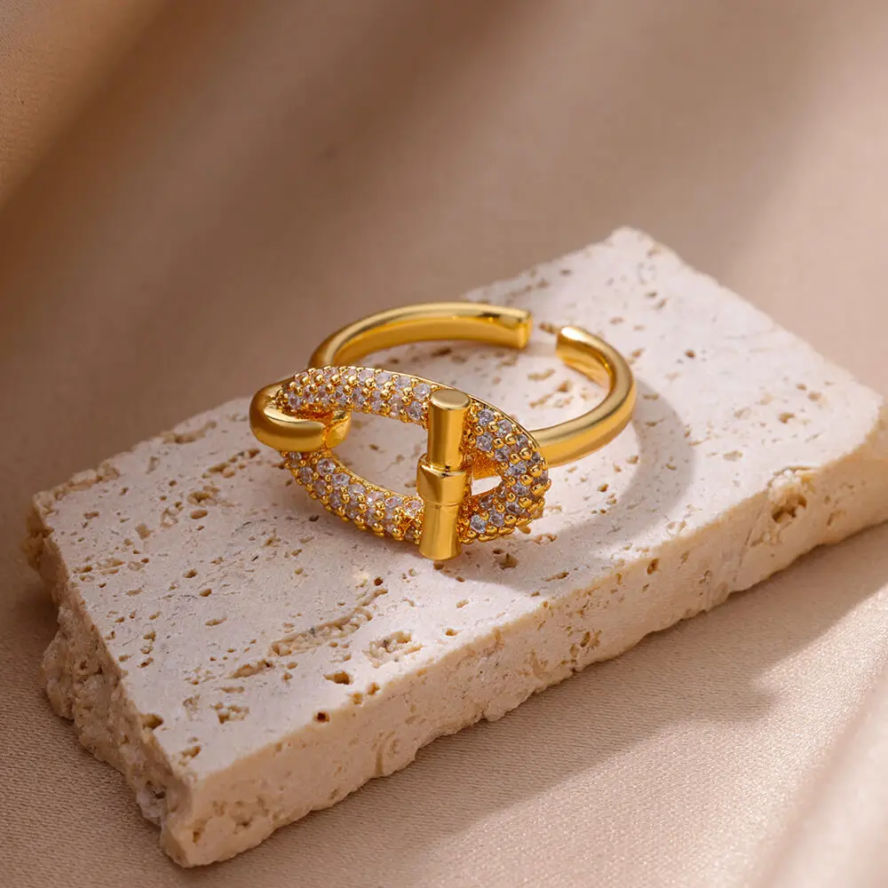 New York’s Fashion Stainless Steel Oval Hollow Zircon Open Rings For Women Gold Color Trendy Wedding Aesthetic Ring Summer Jewelry Accessories