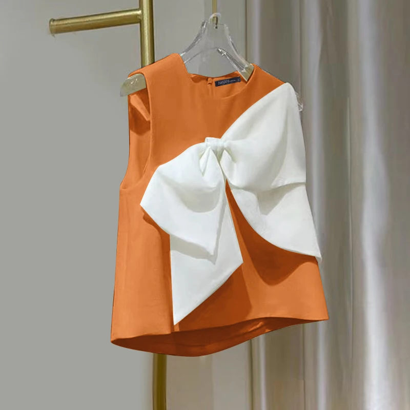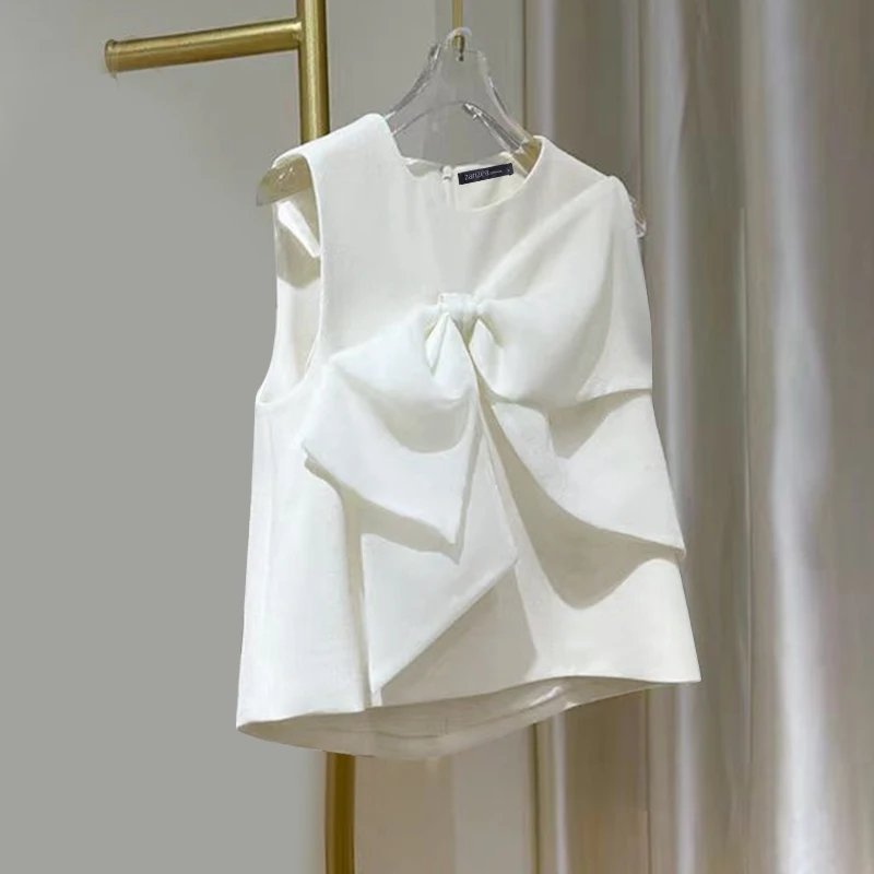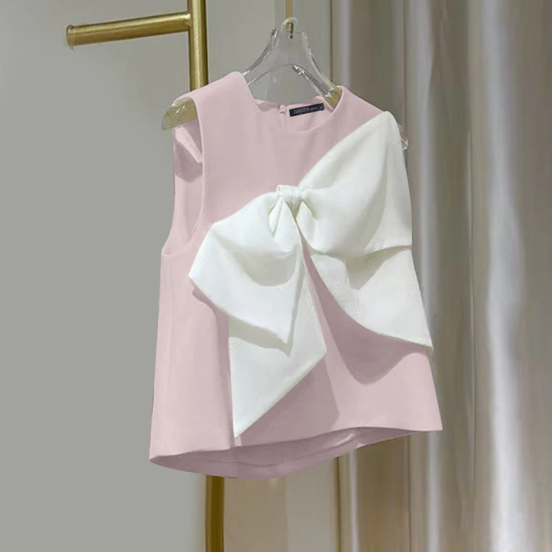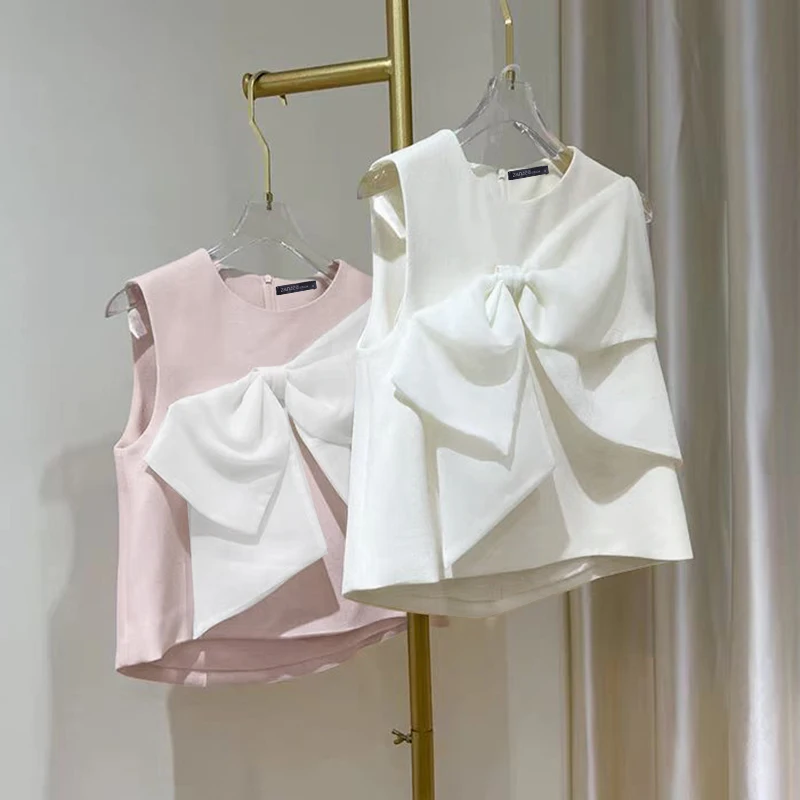 New York’s Fashion Summer Chic Sleeveless O-neck Tops Korean Sweety Bow Tie Tanks 2024 Beach Patchwork Tank Tops Women Solid O-neck Blouse