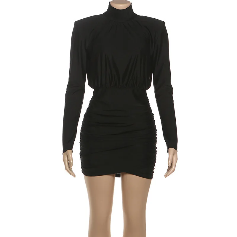 New York’s Fashion Turtleneck Long Sleeve Ruched Women Dress Black High Waist Mini Dress Autumn Winter New Slim Elegant Party Club Dress