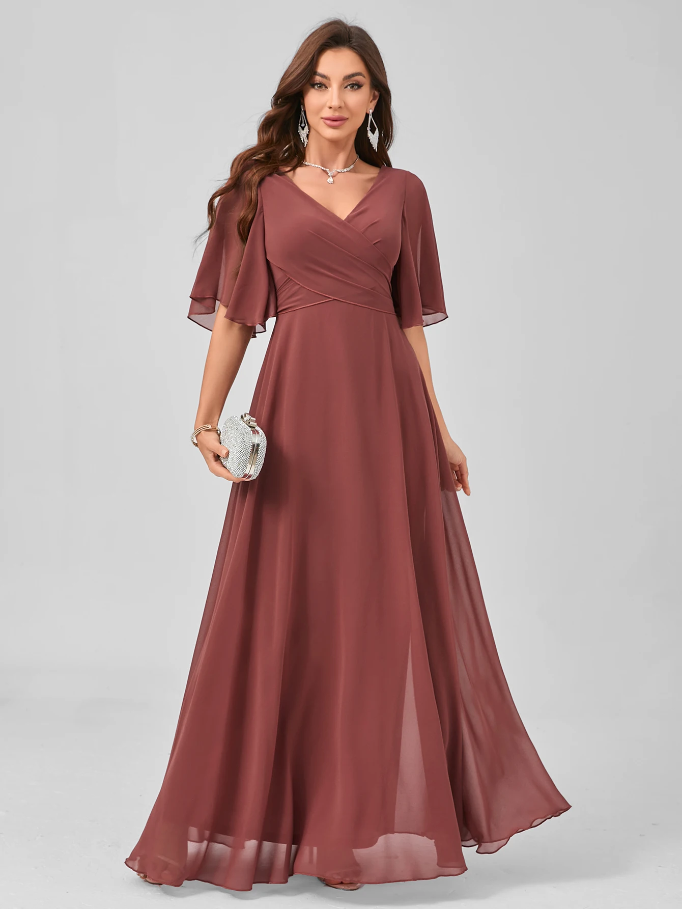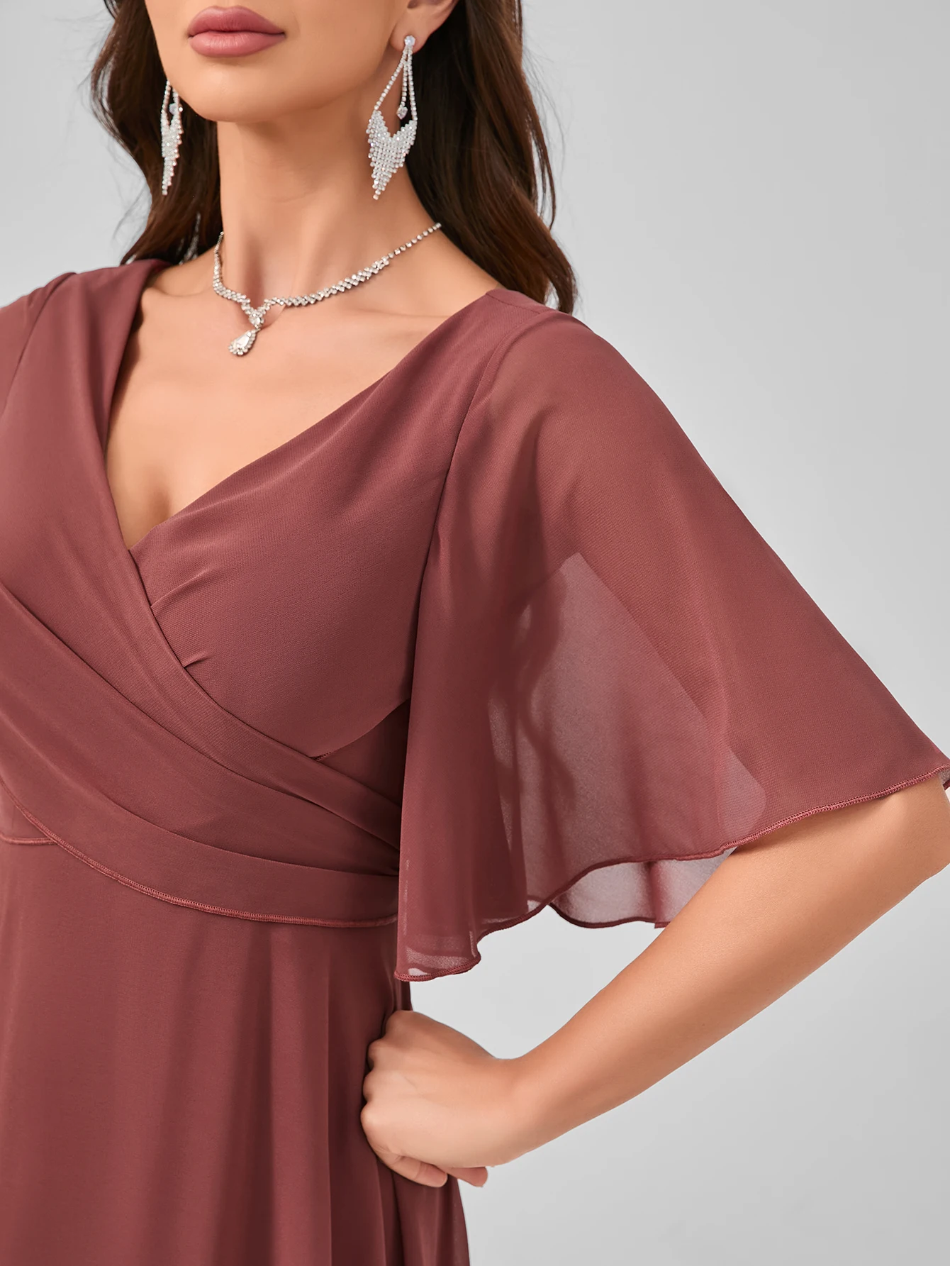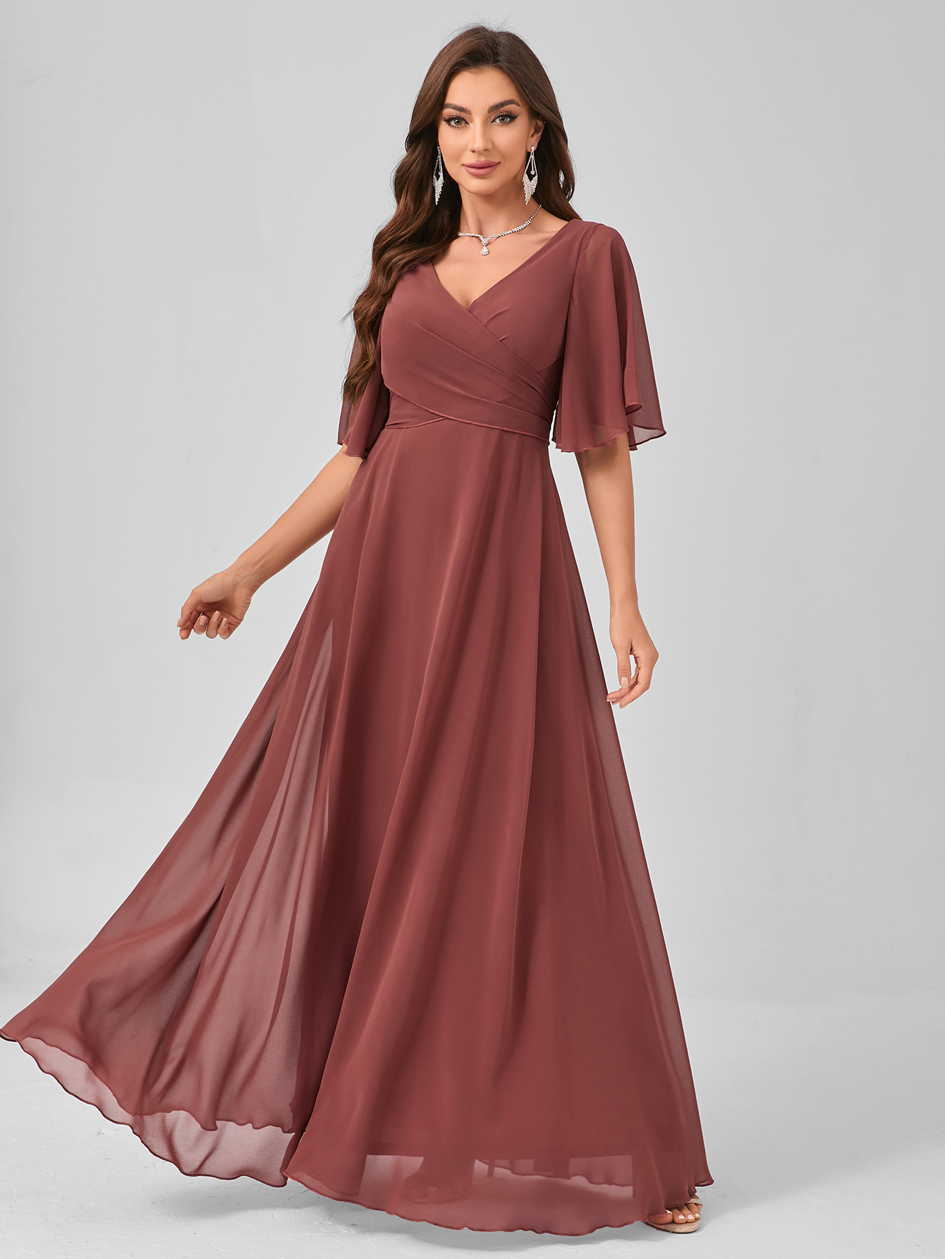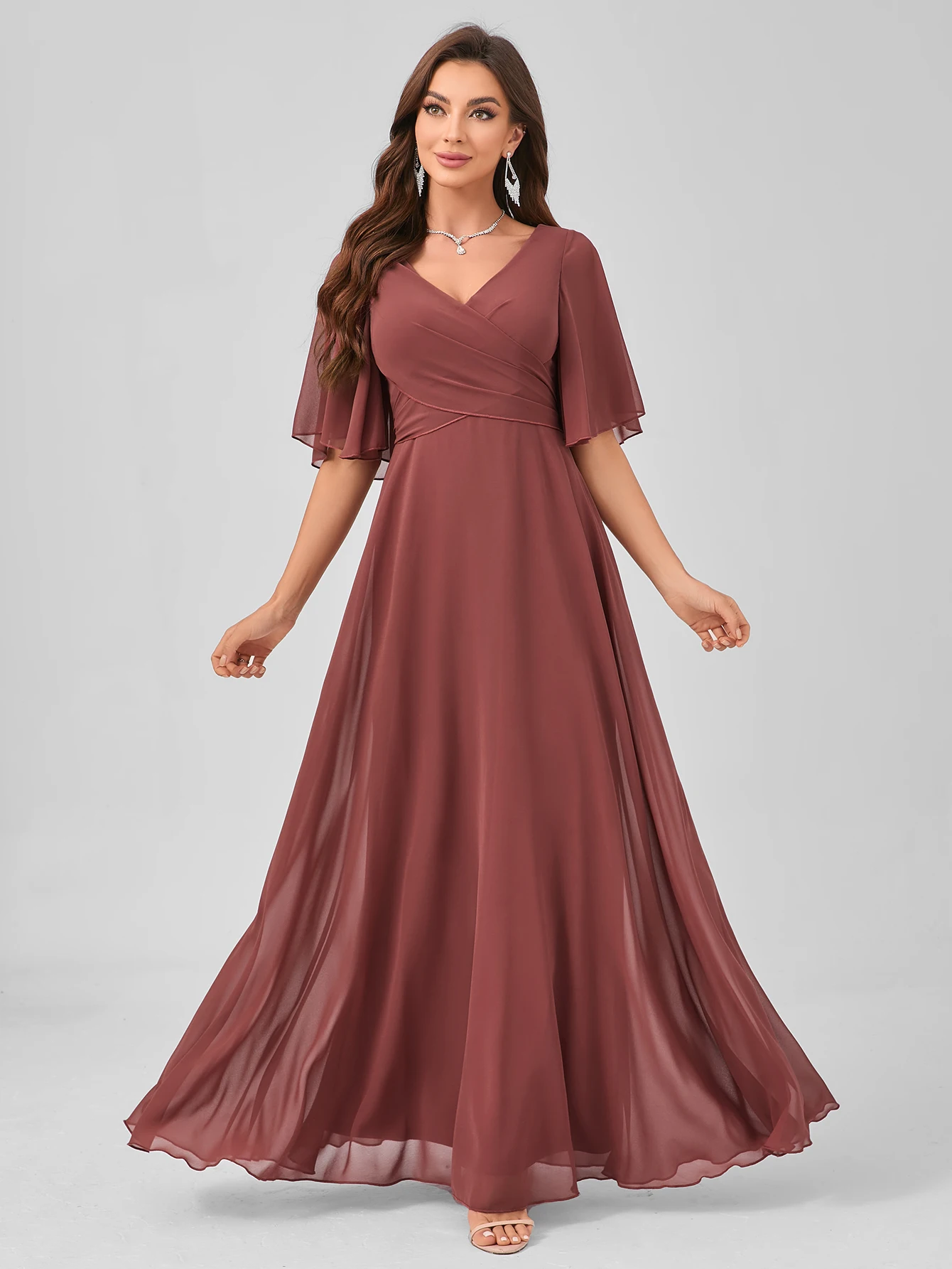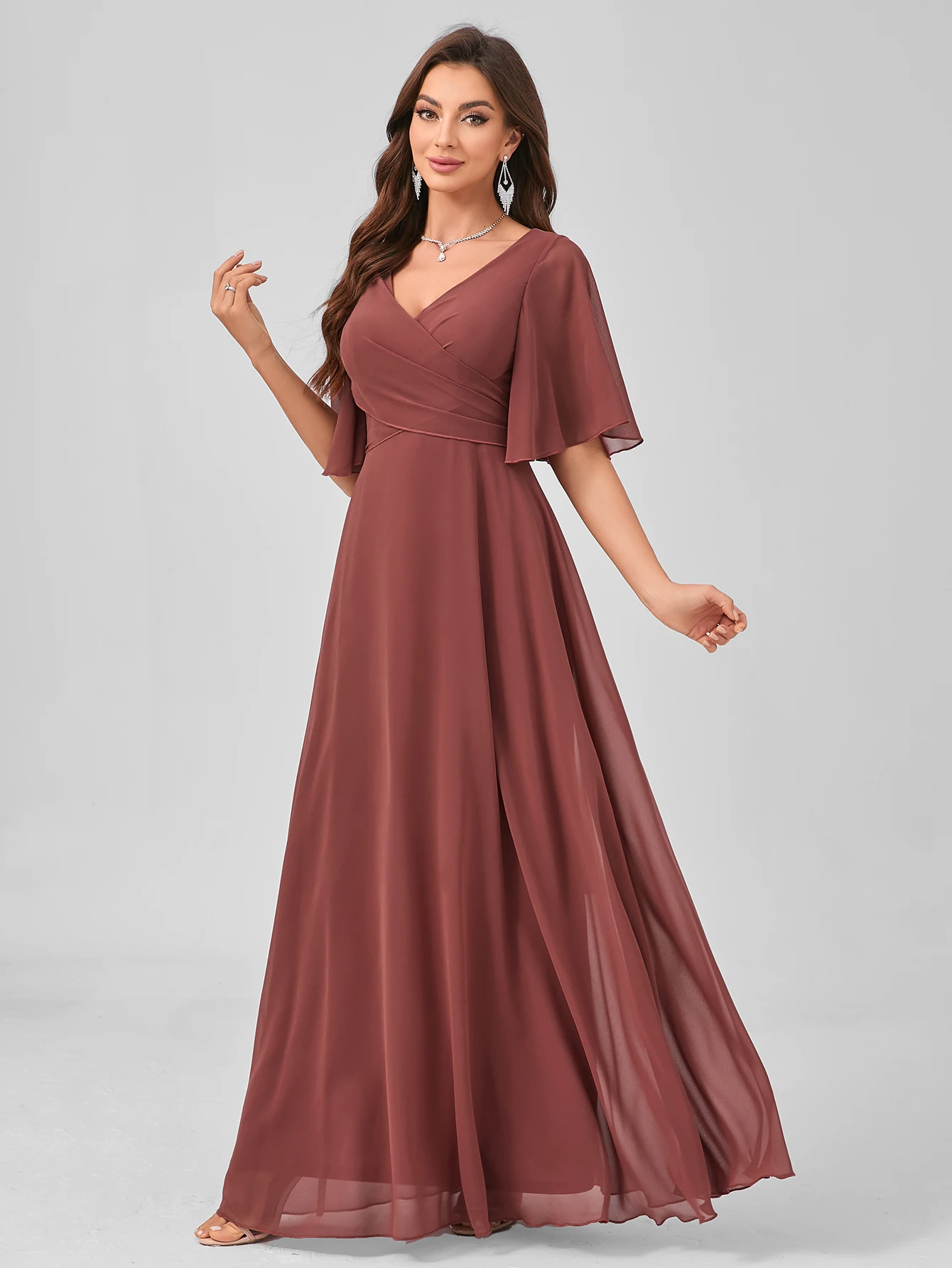 New York’s Fashion V-Neck Back Bowknot Tied Chiffon Wedding Dress with Gathered Skirt And Lace Sleeves for Maids of Honor