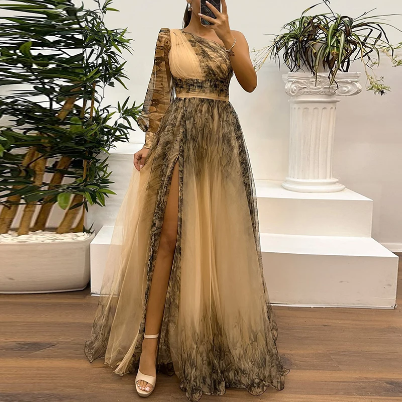 New York’s Fashion Vintage Pattern Printed High Waist Long Dress Sexy Asymmetric Mesh Evening Dress New One Shoulder Sleeve Pleats Bridesmaid Dress