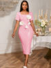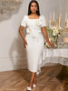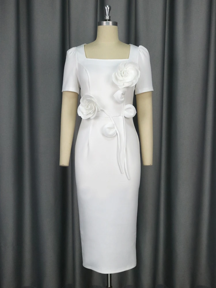 New York’s Fashion White Evening Party Dresses for Ladies Short Sleeve 3D Flower High Waist Bodycon Birthday Bridesmaid Wedding Guest Midi Gowns